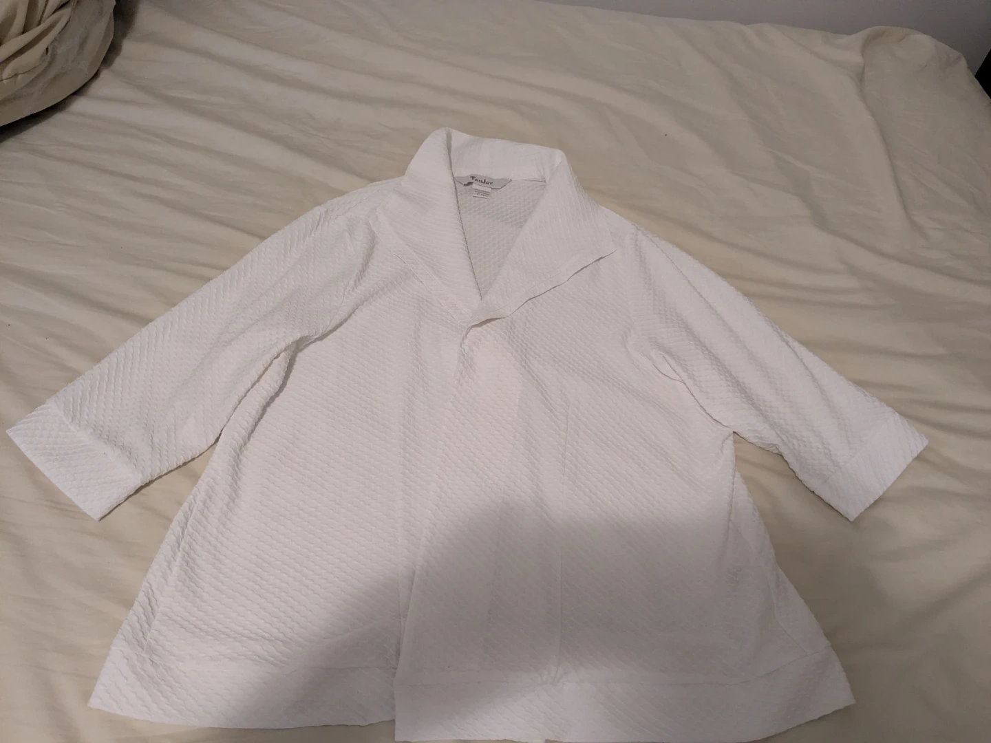 Here's a lovely white textured blouse from TanJay! It's a XL and in great condition. The fabric has a subtle, stylish texture that adds a bit of interest to the classic white colour. Perfect for dressing up or down!