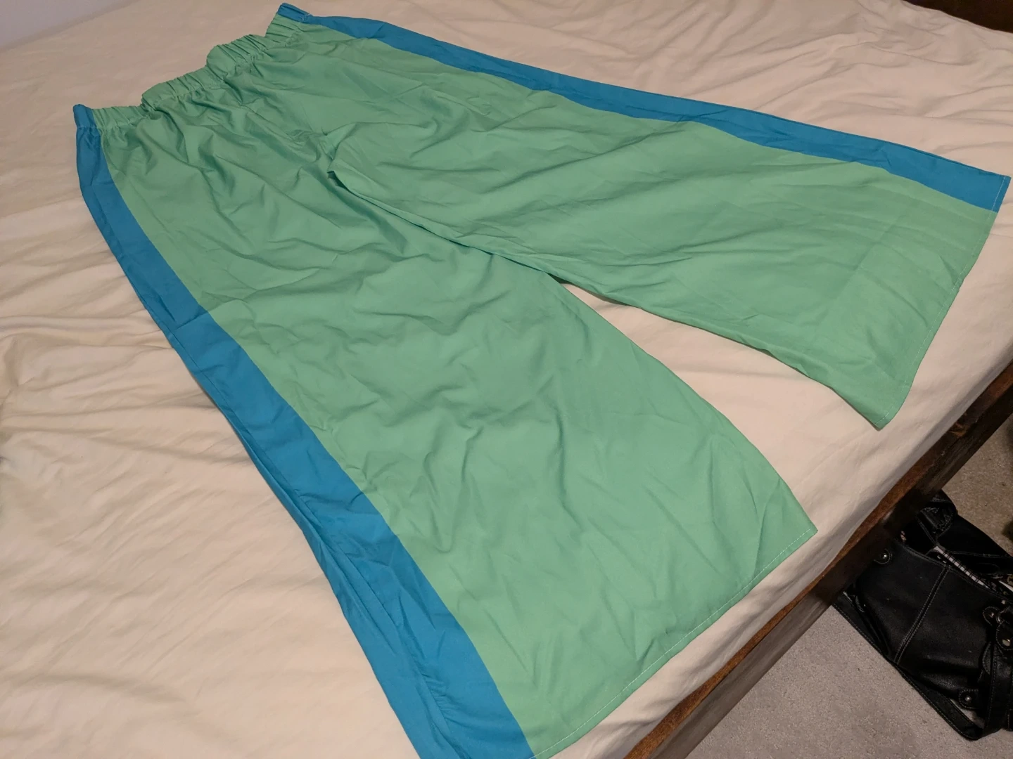 Track pants in a refreshing mint green with a striking blue stripe down the side! They look super comfy and stylish. Perfect for lounging or a casual day out. No brand or size information is available.