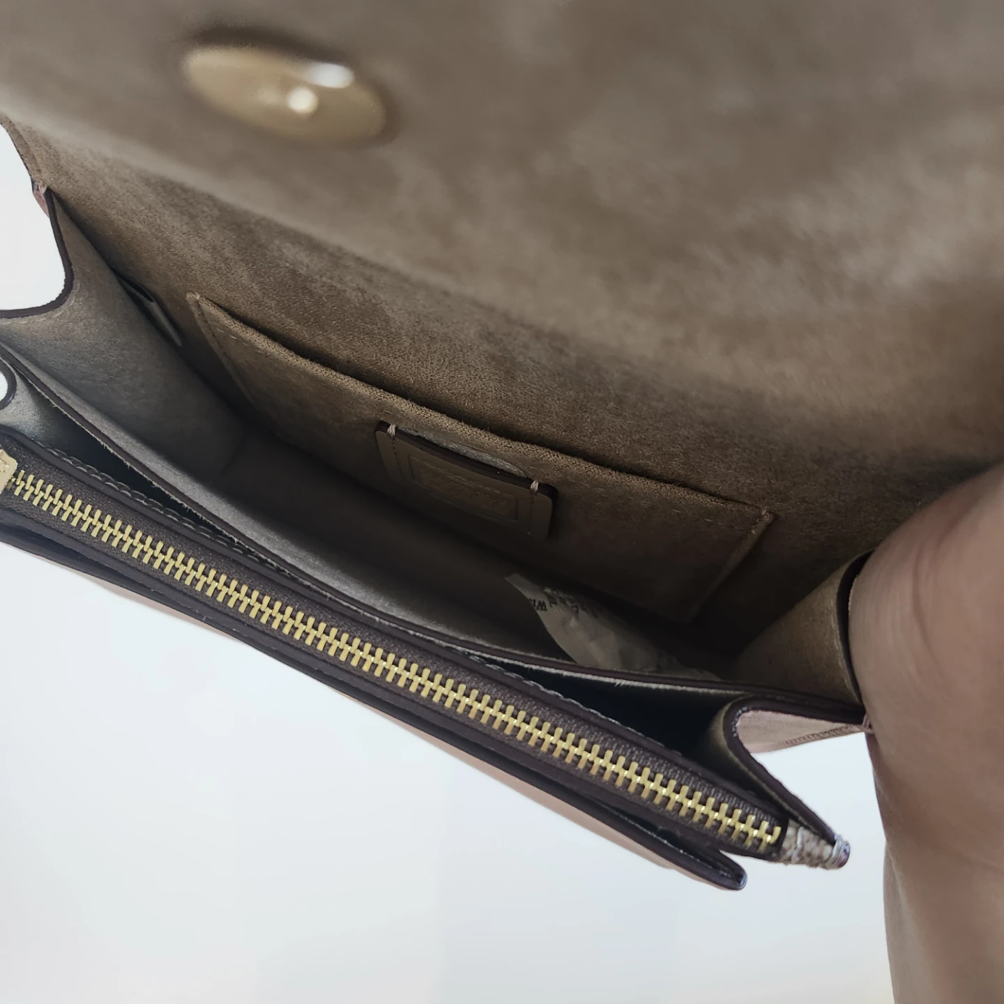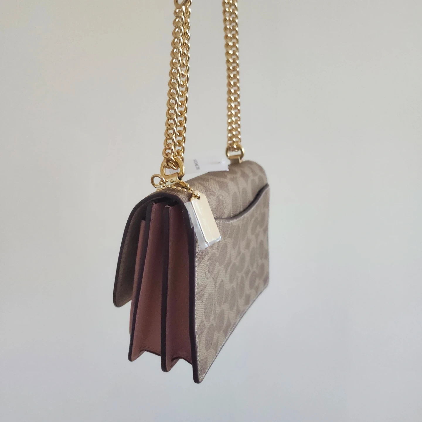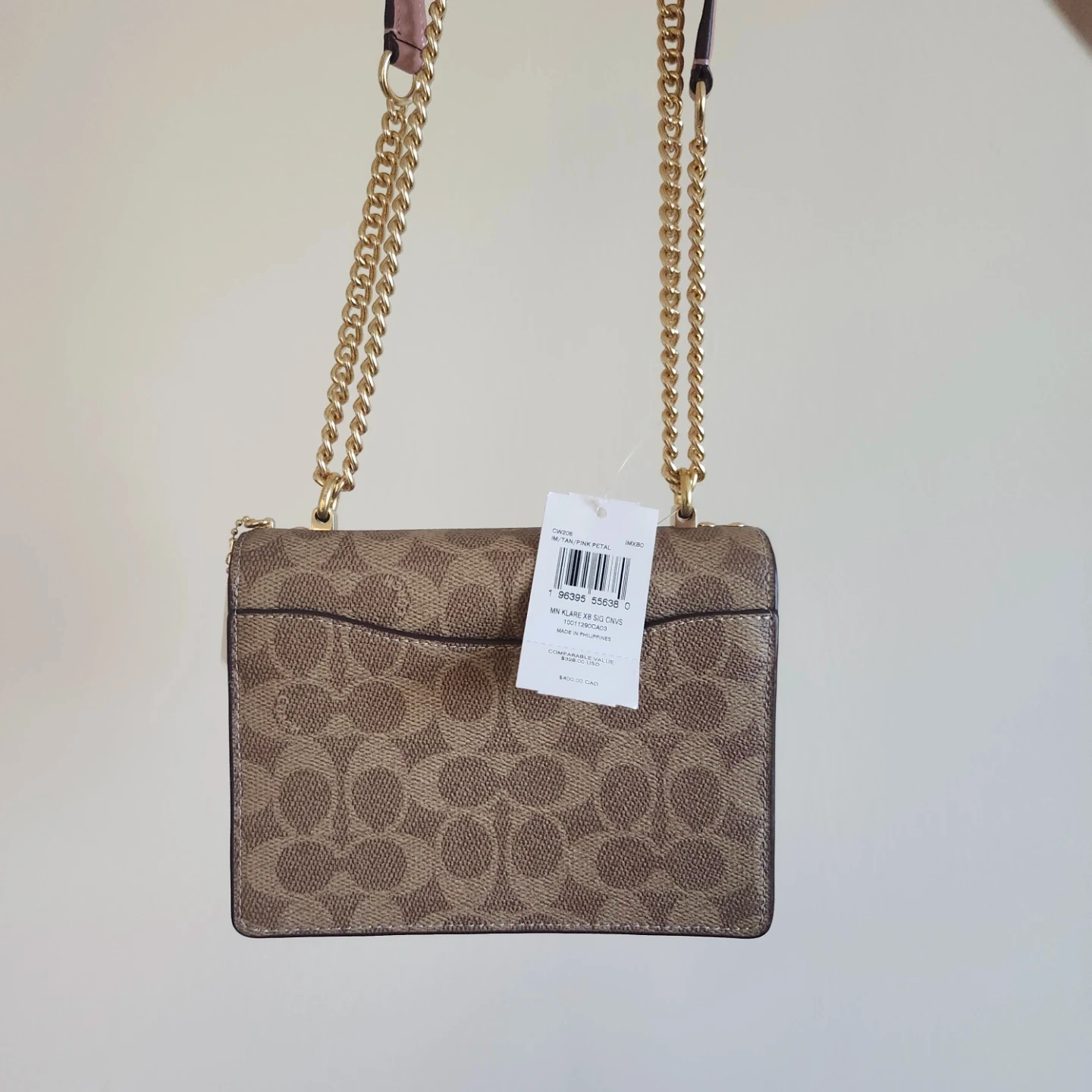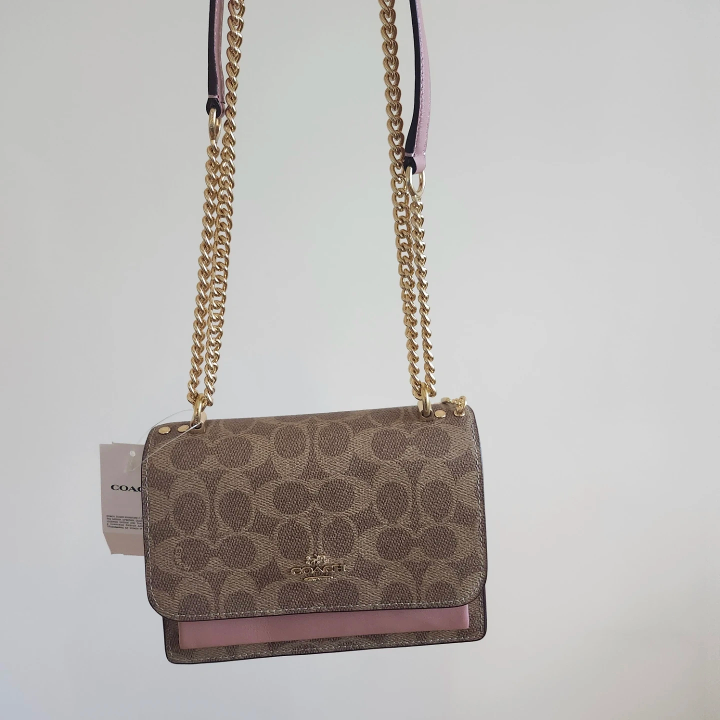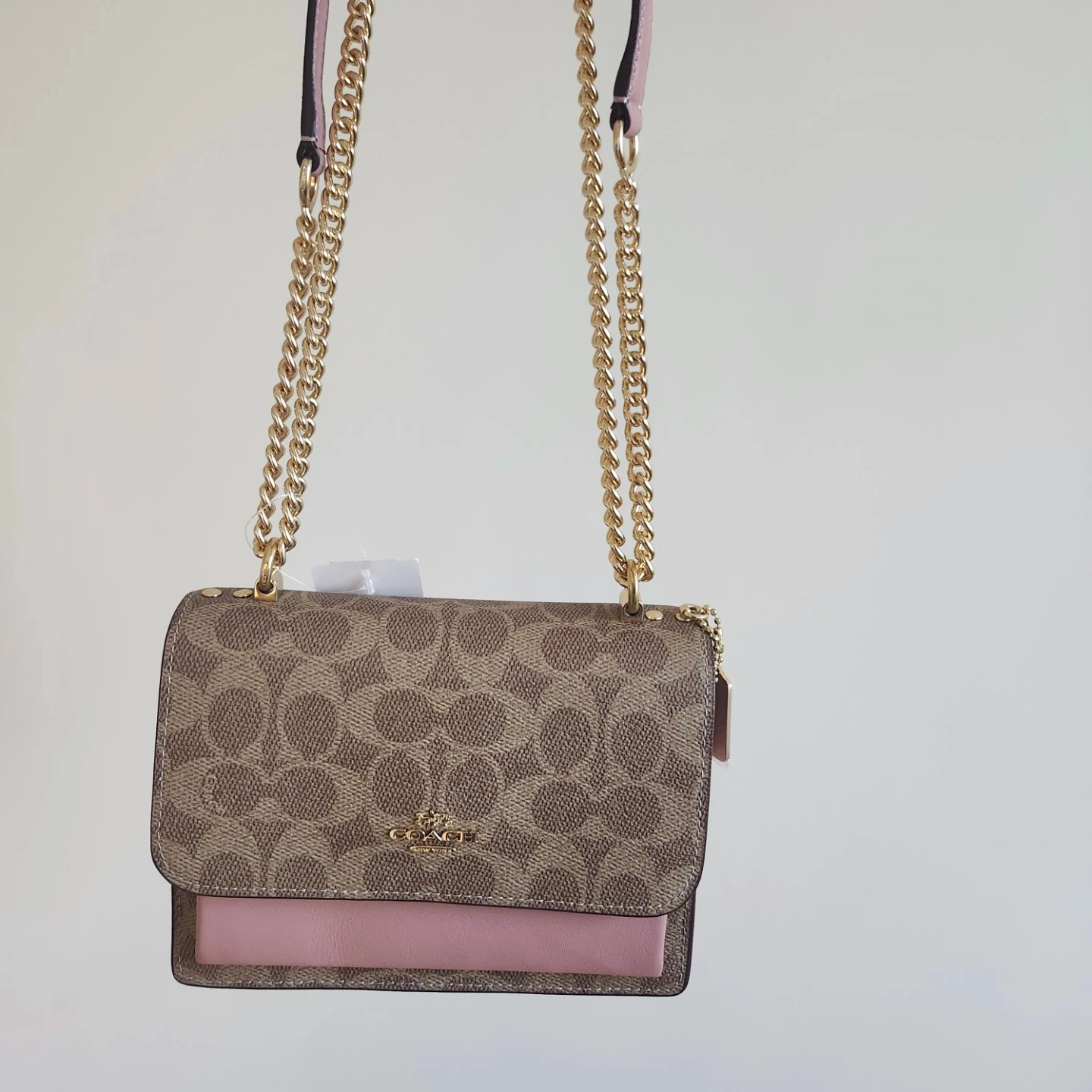 Selling a Coach shoulder bag in signature jacquard with pink leather accents! It features a stylish chain strap and compact design, perfect for everyday use. The bag is in unused condition with tags.