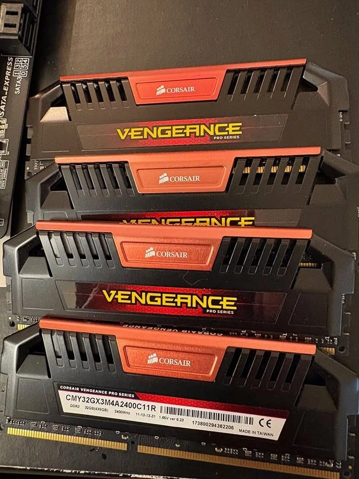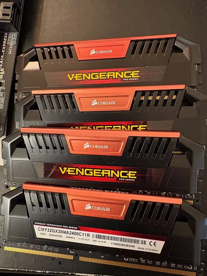 - 32GB (4x 8GB) DDR3 Corsair Vengenace Pro Series RAM @ 2400MHz, Dual Channel