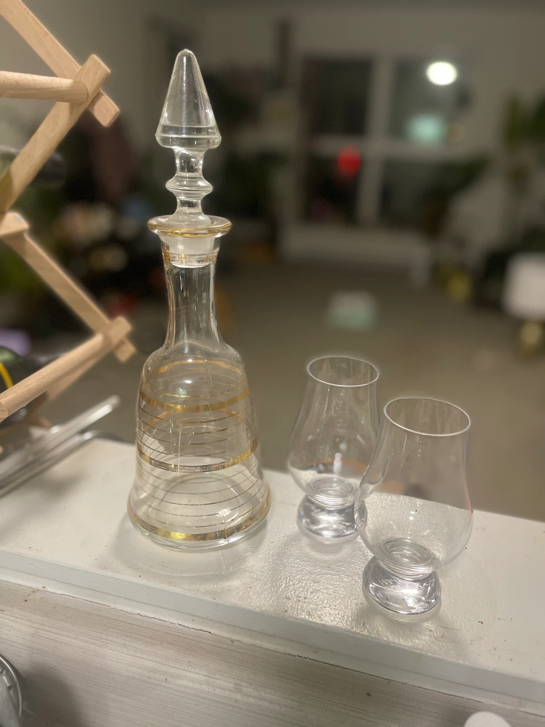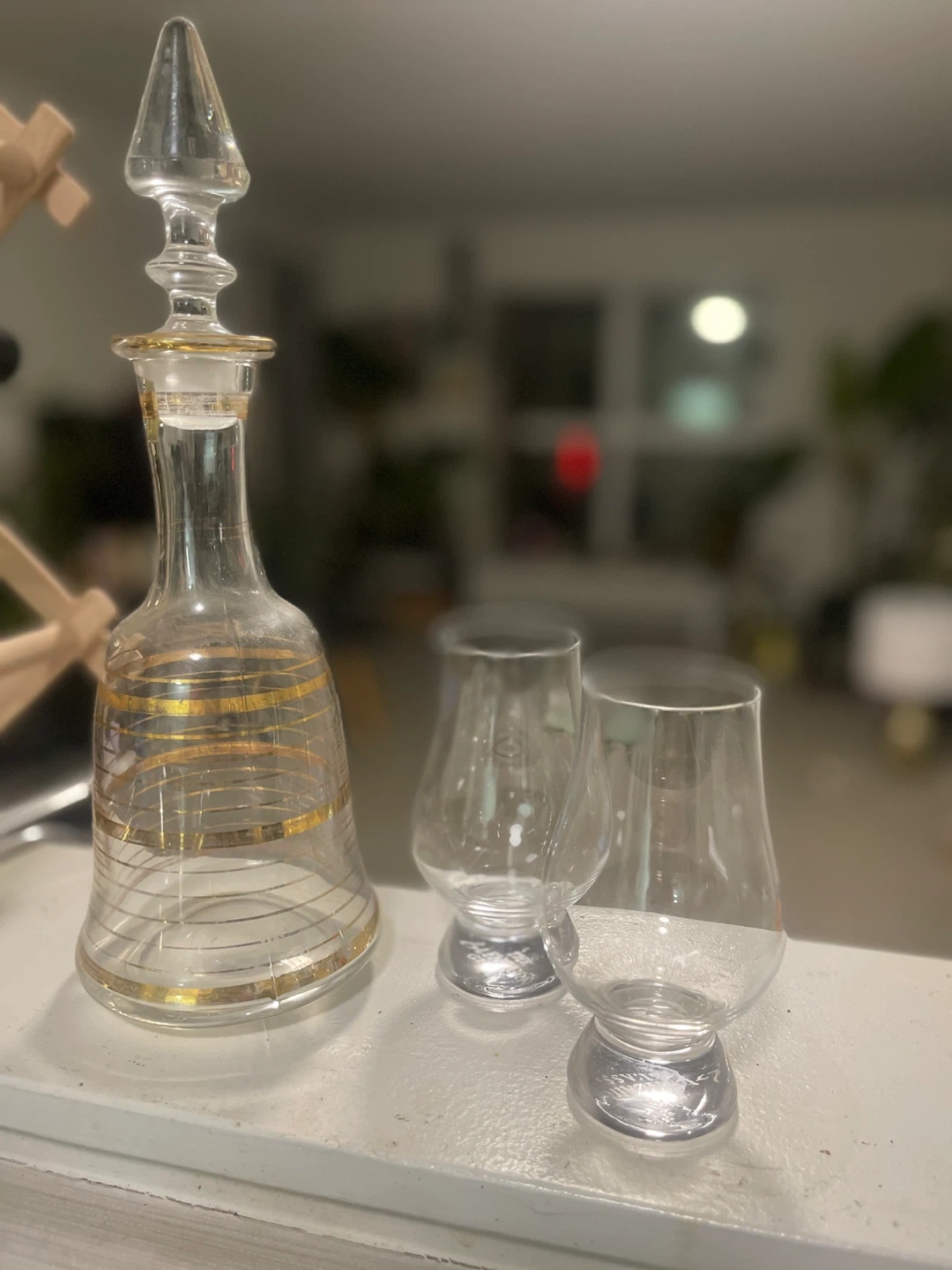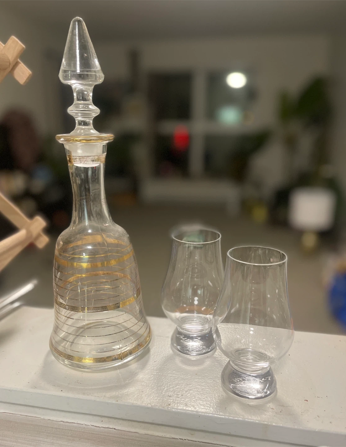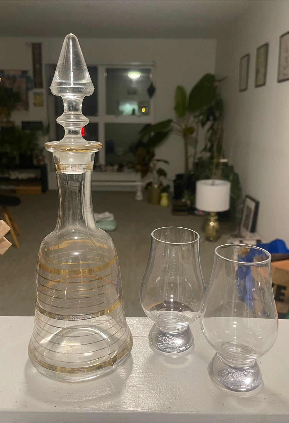 Selling a lovely vintage whiskey decanter set that includes the decanter and two glasses. The decanter features a beautiful clear glass design with gold accents. Perfect for serving your favourite spirits!