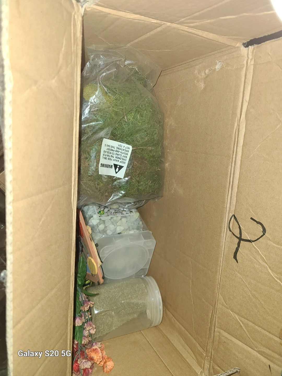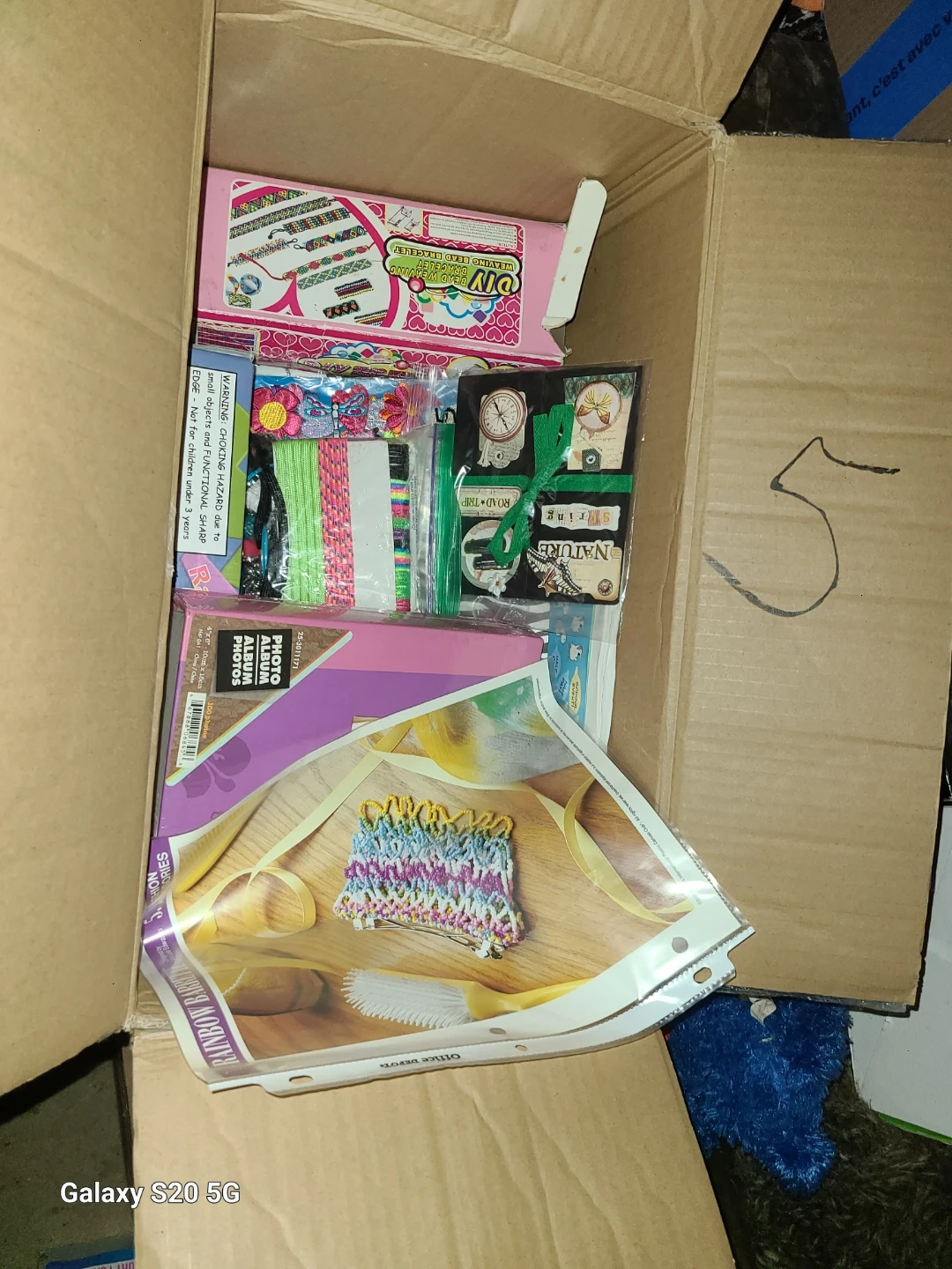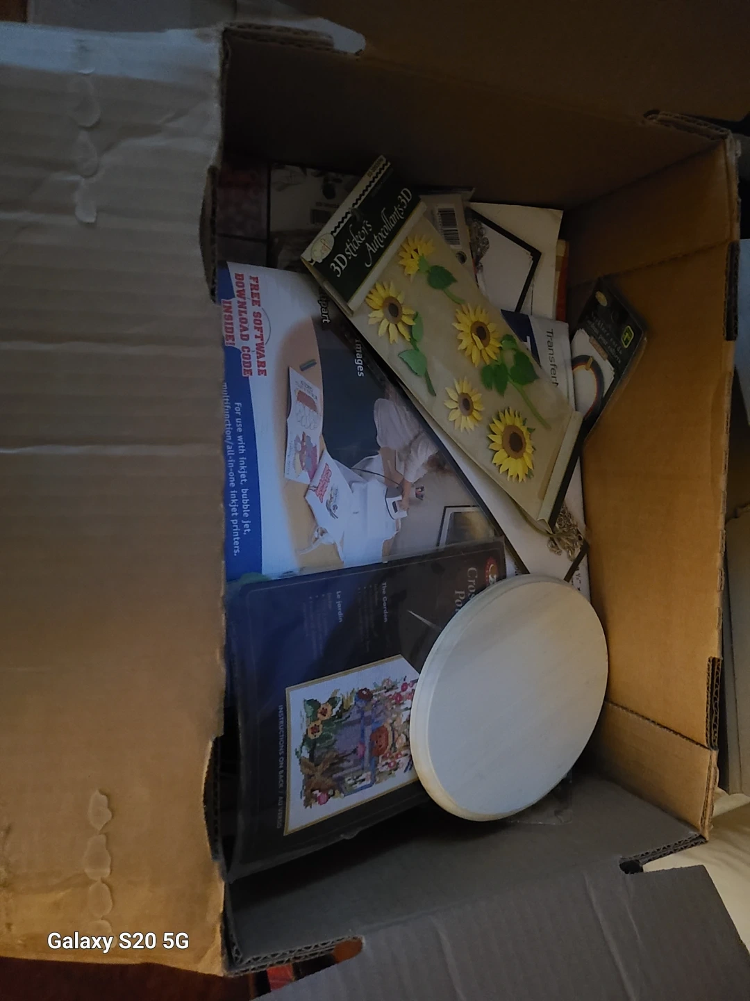 Selling a box full of craft supplies! There's a variety of items including beads, stickers, moss, and other crafting materials. Perfect for anyone who enjoys DIY projects
