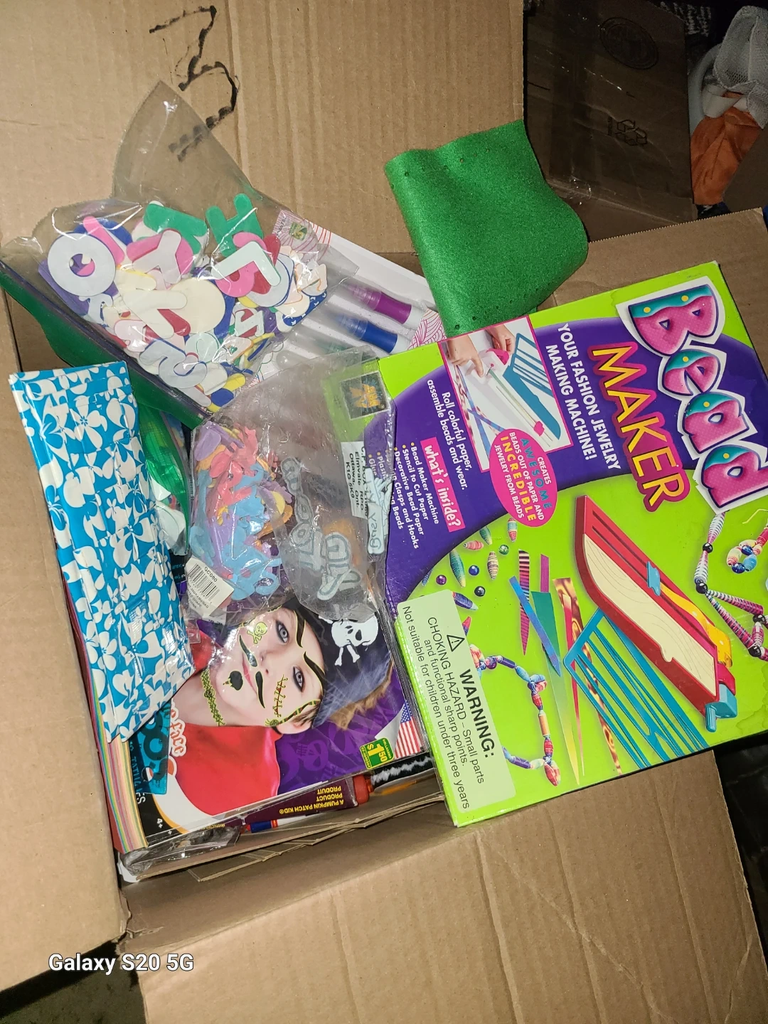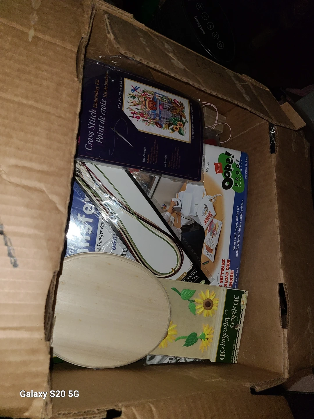 Selling a box full of craft supplies! There's a variety of items including beads, stickers, moss, and other crafting materials. Perfect for anyone who enjoys DIY projects