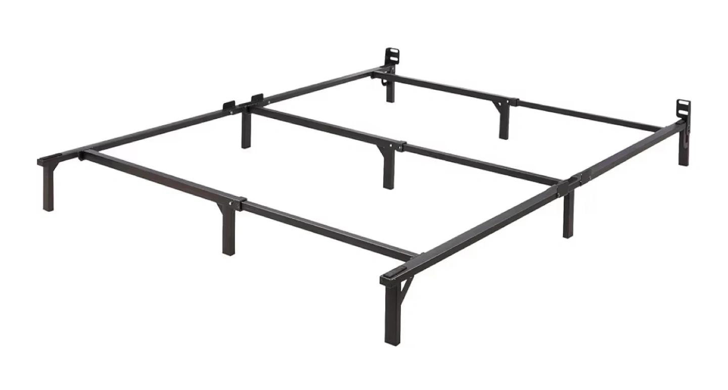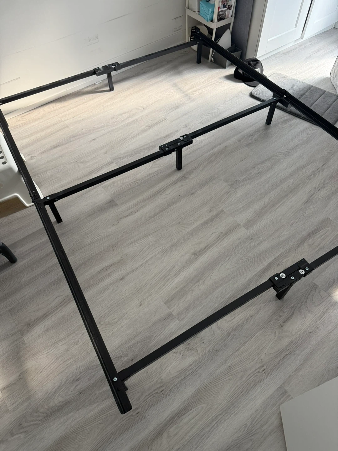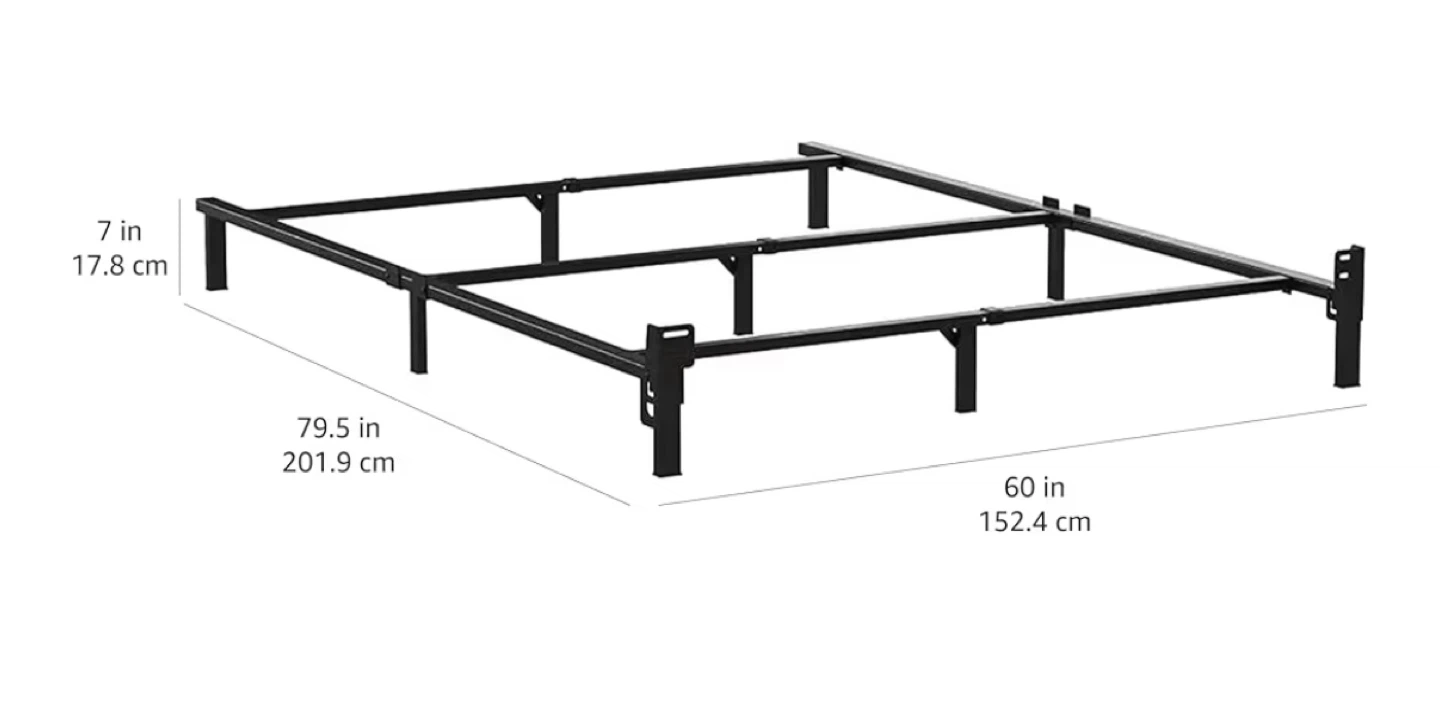 Selling a queen-size bed frame in black metal! It's in great shape and ready to support your mattress. The frame measures 79.5 inches in length and 60 inches in width, with a height of 7 inches.