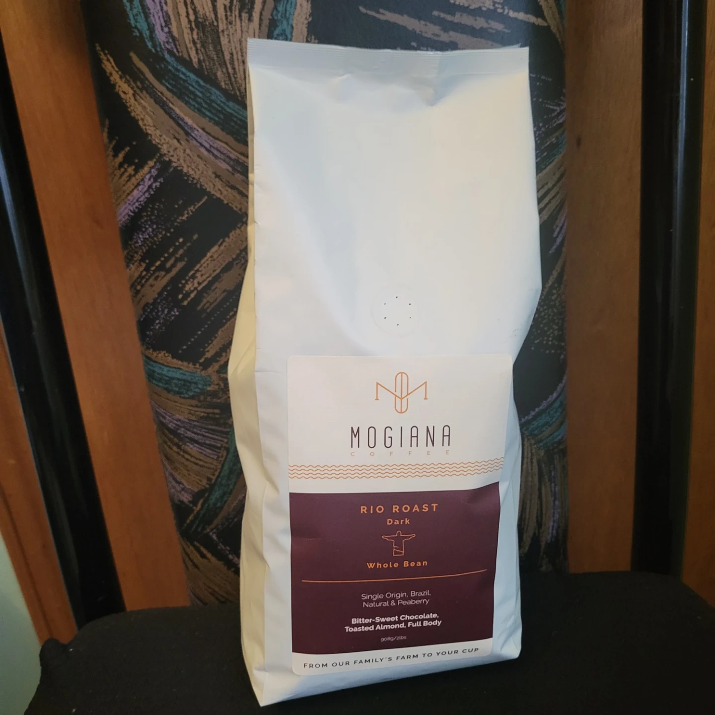 Selling a bag of Mogiana Rio Roast Dark Whole Bean Coffee! It's a single origin from Brazil, natural & peaberry, with a bitter-sweet chocolate, toasted almond, full body flavour profile