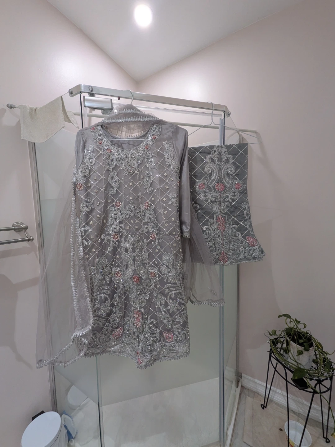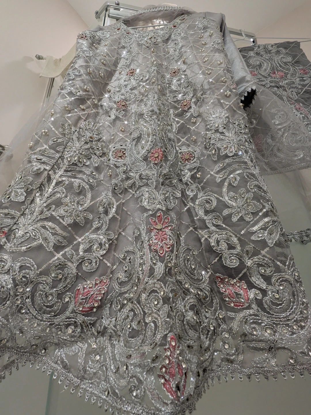 Stunning bright grey Pakistani suit with intricate embroidery. Perfect for special occasions wedding, engagement, bridal, ! The suit includes a top, bottom, and dupatta. It's a heavy set with serious sparkles all over work. Picture does not do justice
