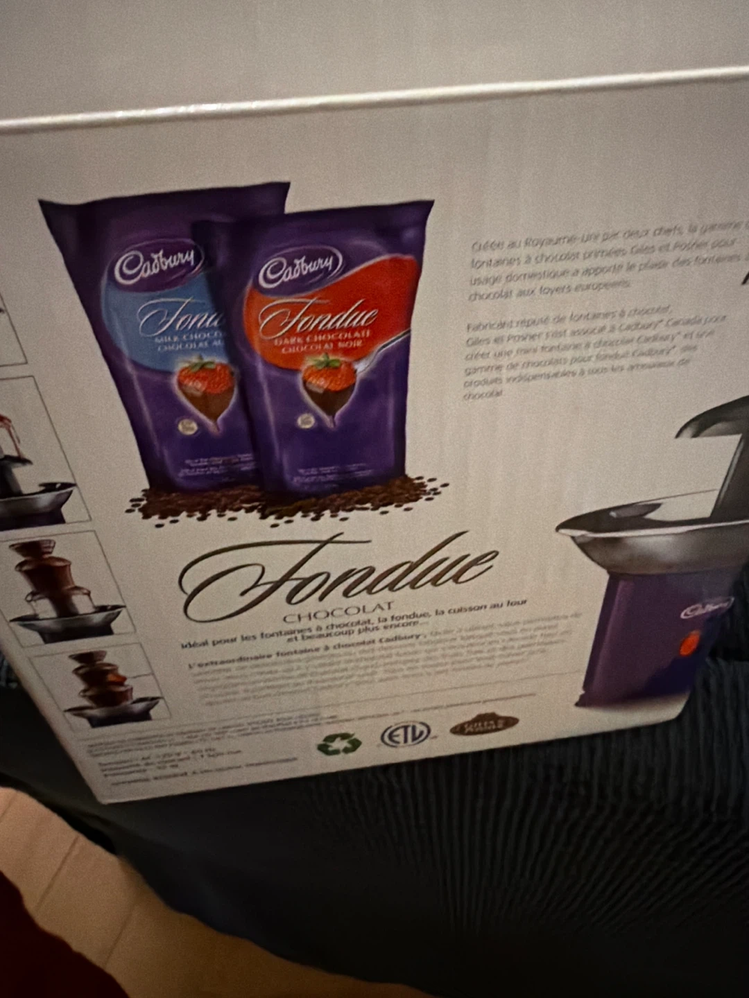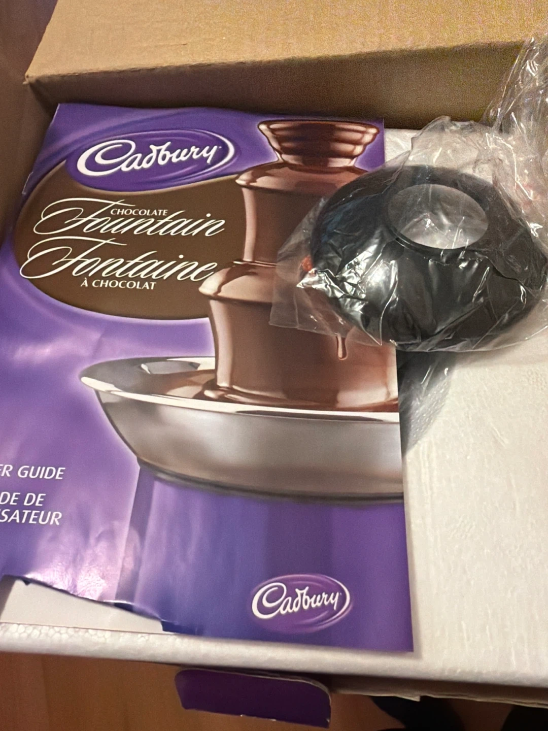 Selling a brand new Cadbury chocolate fondue fountain! It's still in its original packaging and ready to make some delicious chocolatey treats. Perfect for parties or just a fun dessert night. The box is included with all the original components inside