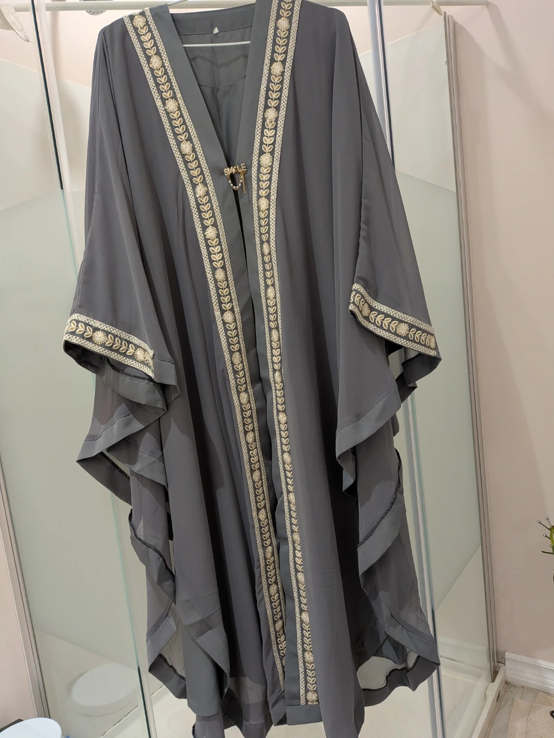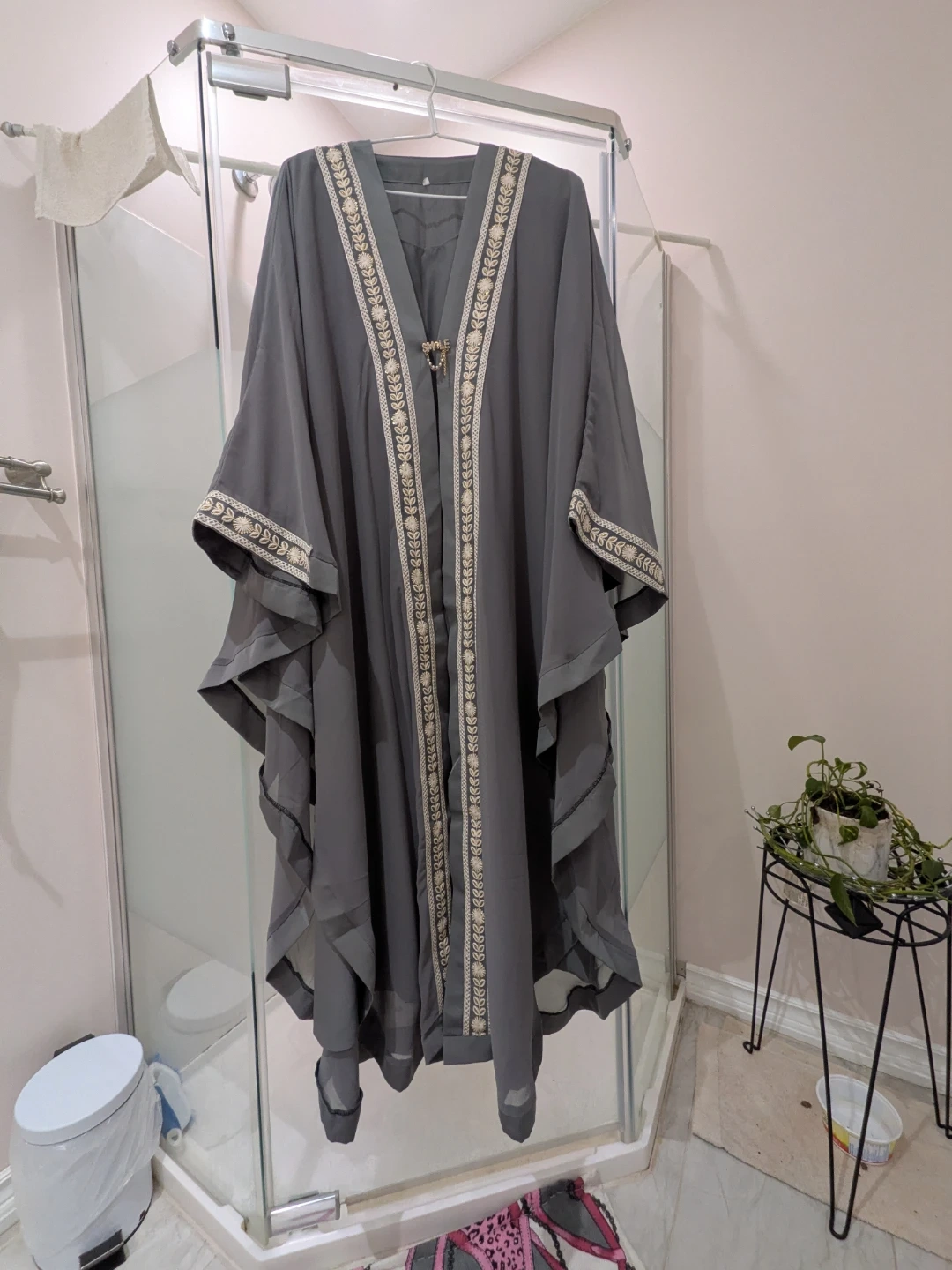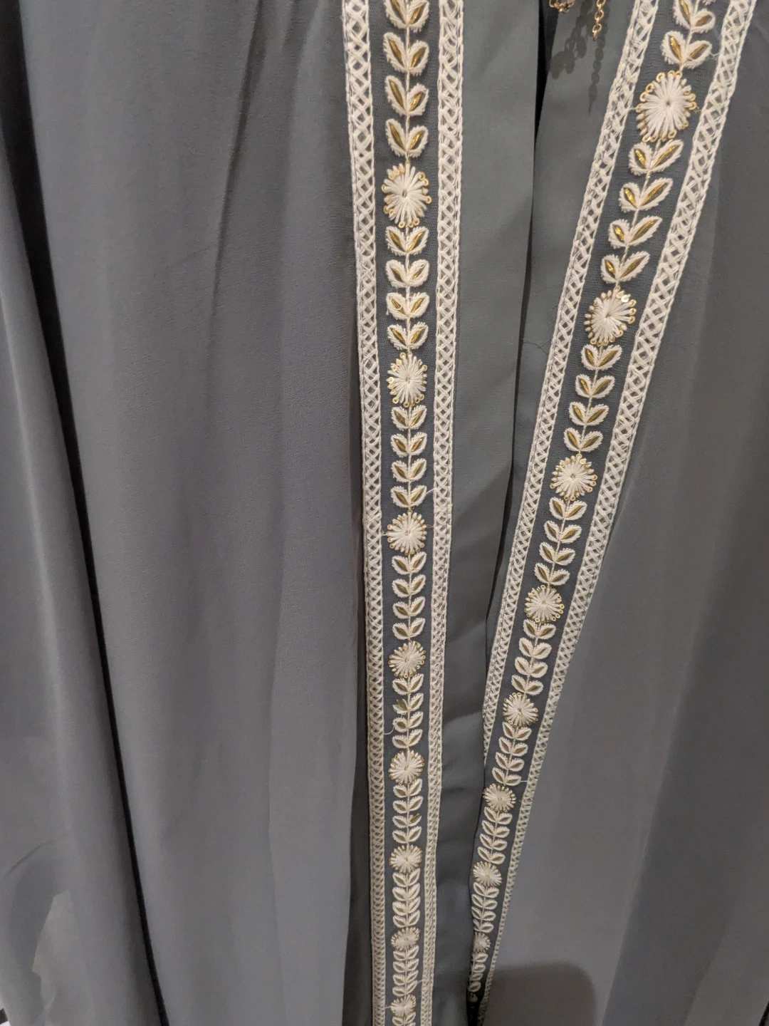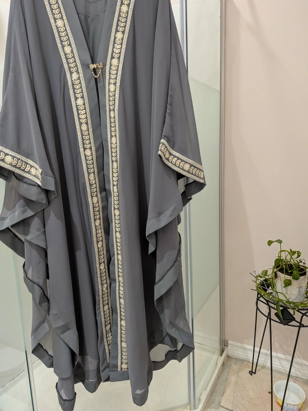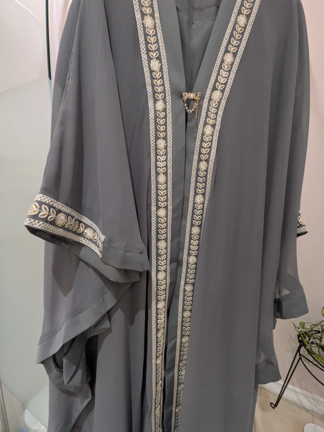 Selling a lovely grey abaya with delicate embellishments. It's in great condition and perfect for special occasions or everyday wear! The fabric is premium quality from Makkah with under layering attached