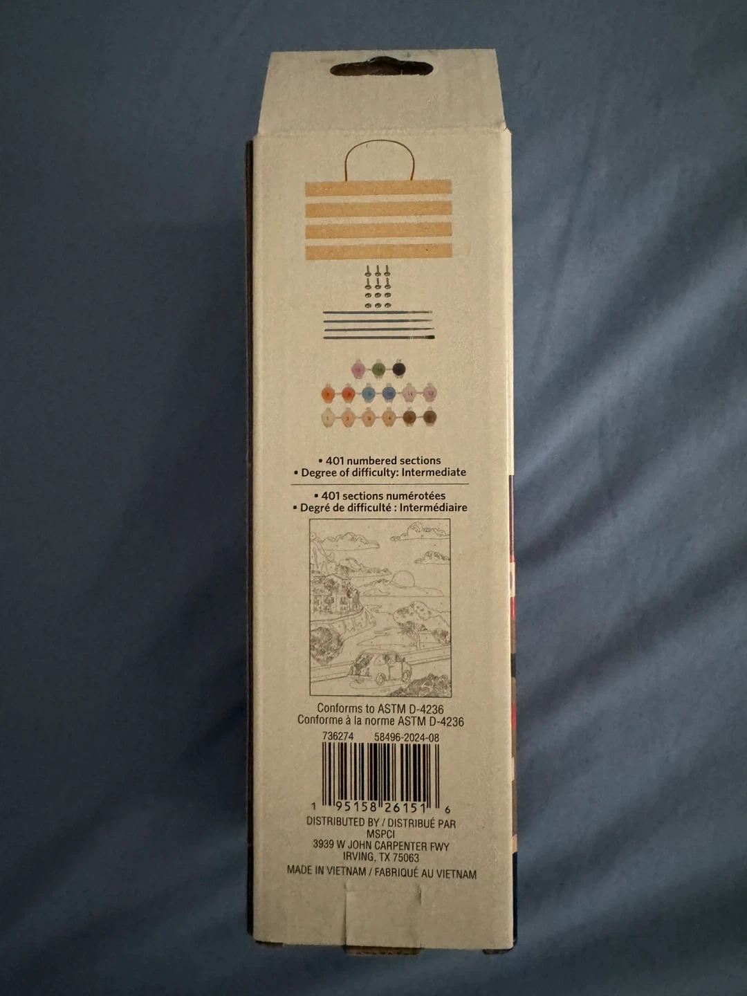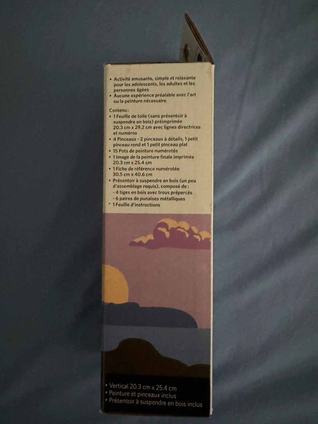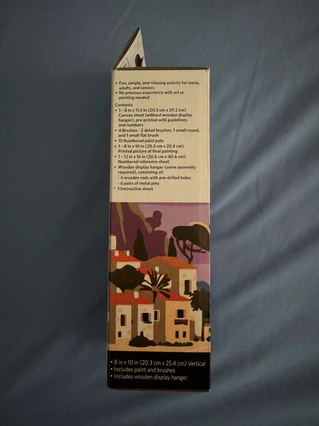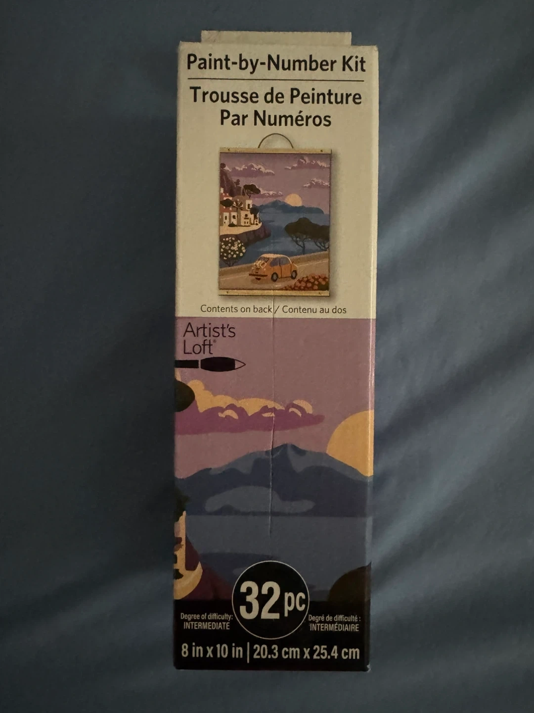 I'm selling a brand new Artist's Loft Paint-by-Number Kit! It's a 32-piece set with a degree of difficulty rated as intermediate. The canvas size is 8 in x 10 in (20.3 cm x 25.4 cm) and it's a vertical orientation. Includes paint and brushes, as well as a wooden display hanger. The box contains: