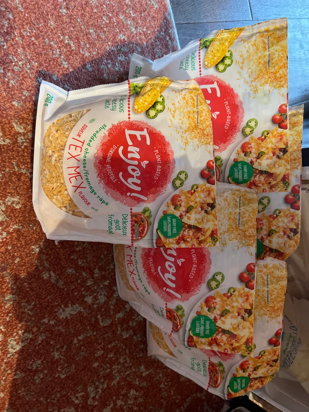 Selling a package of Enjoy! Tex Mex flavour shredded cheese. It's plant-based and dairy-free, so it's great for anyone with dietary restrictions. Perfect for adding a cheesy flavour to your favourite dishes!