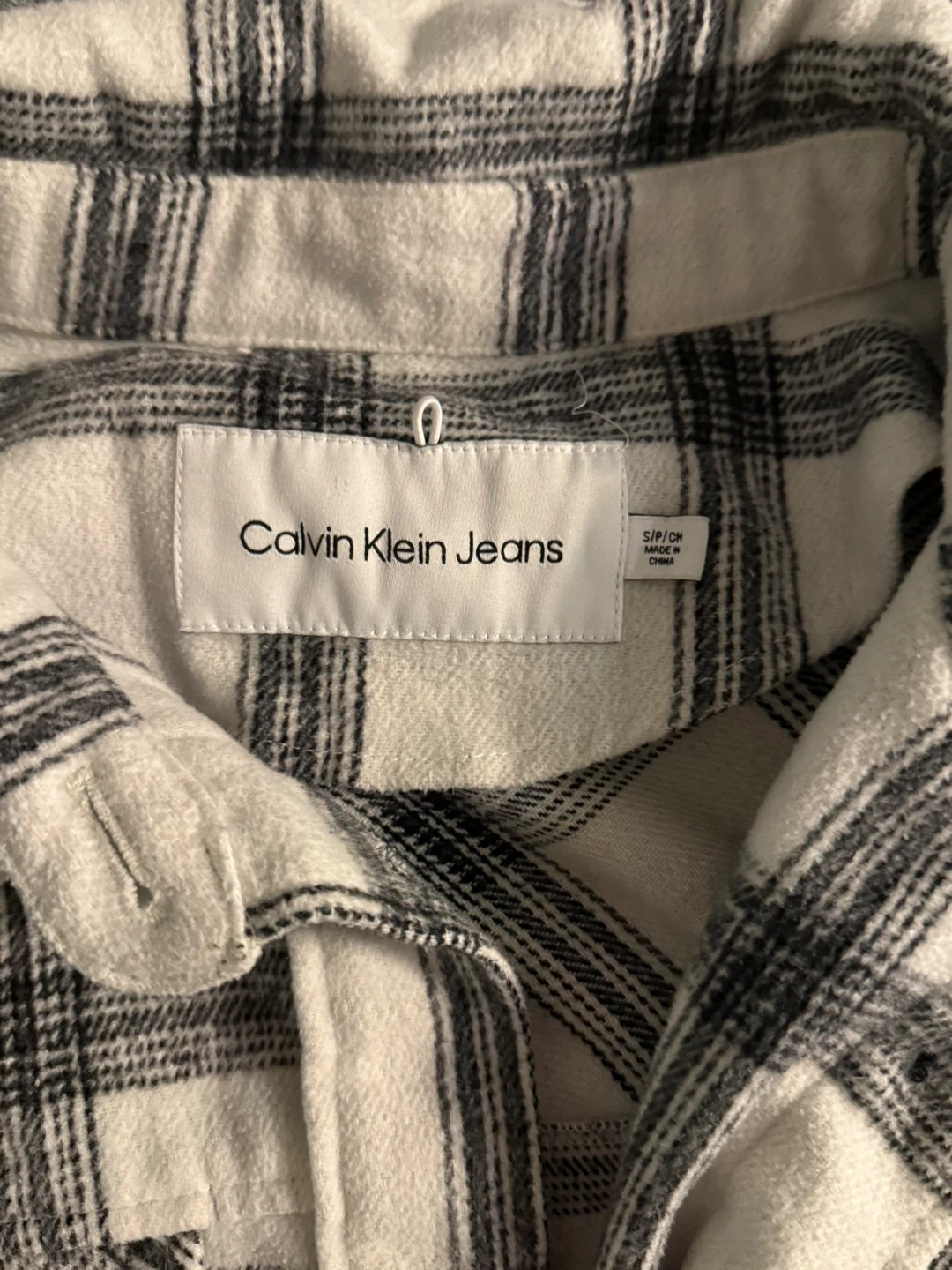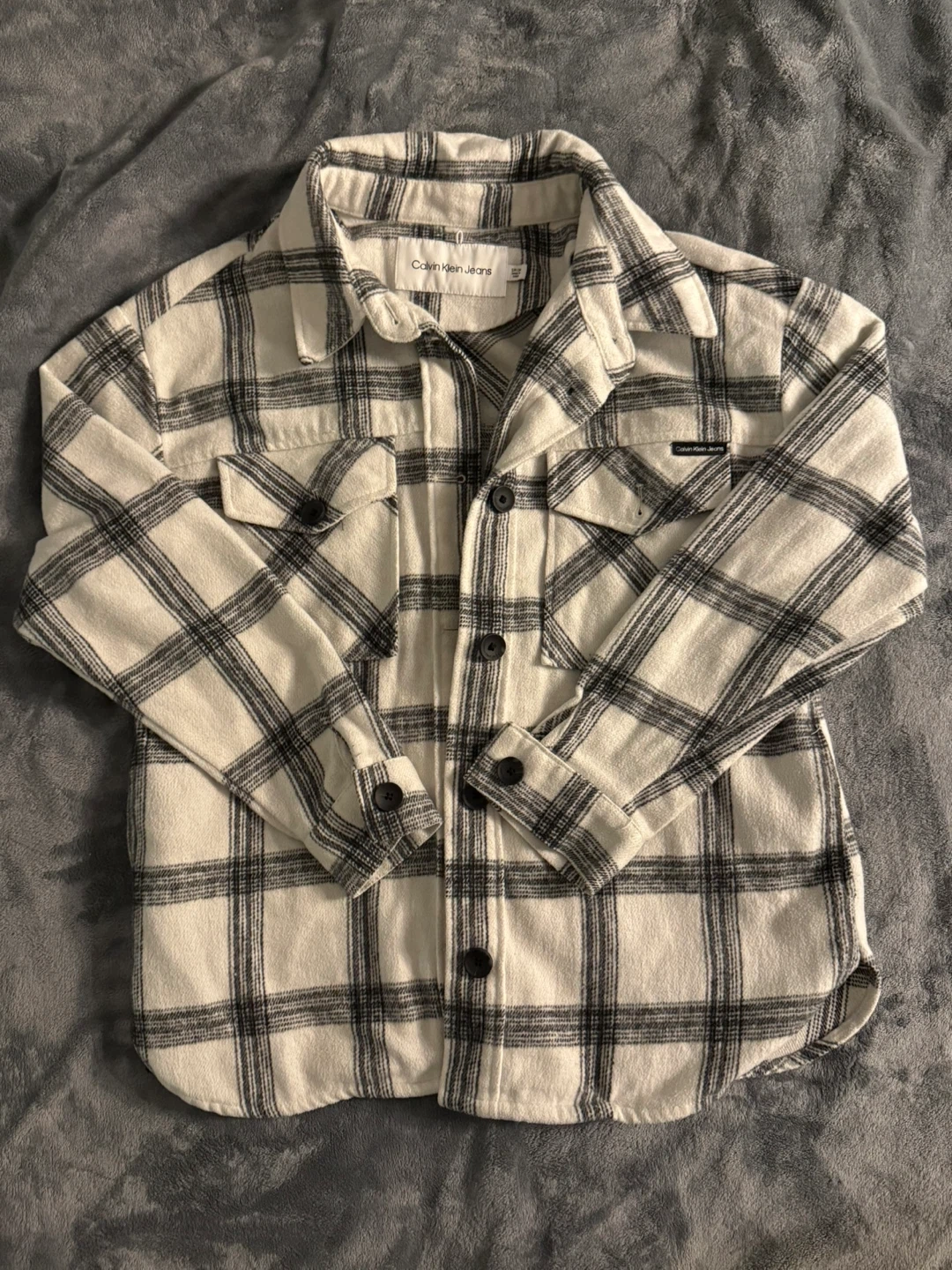 Cozy Calvin Klein Jeans flannel shirt in a classic plaid pattern. It's a size small and perfect for layering during the cooler months. In great condition!