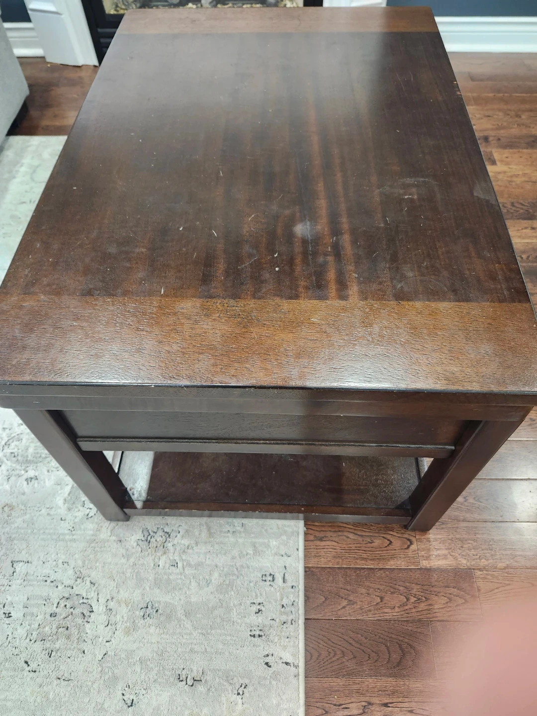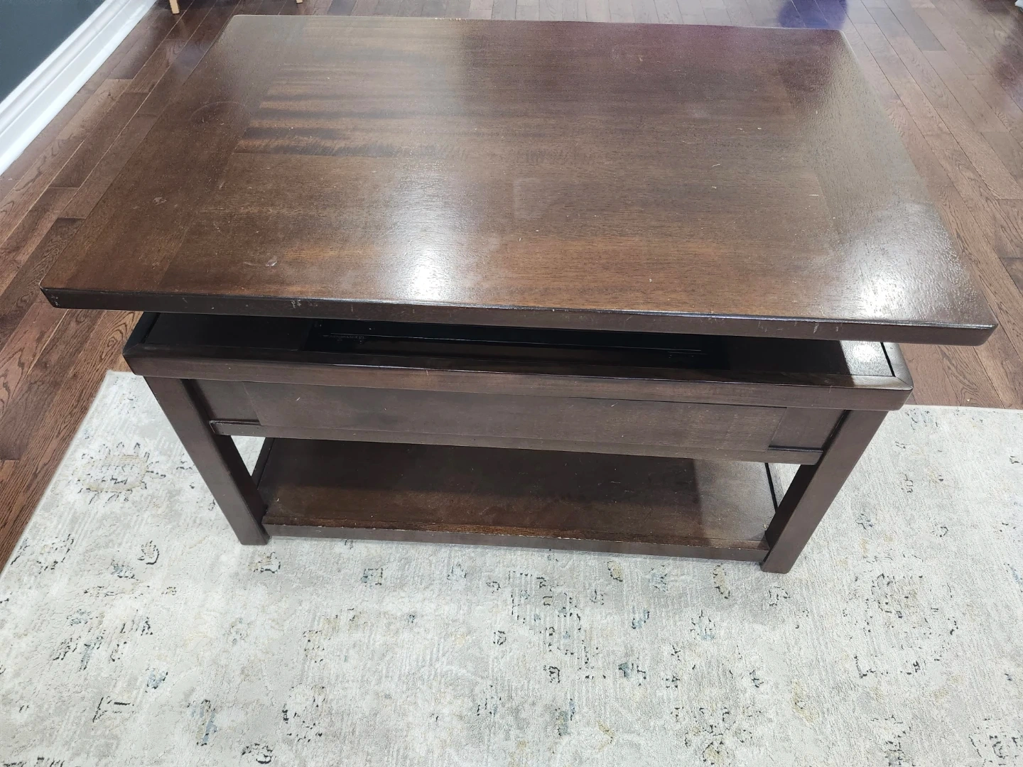 Selling a dark brown wood coffee table. It has a shelf underneath for storage. It's in good condition and would be a great addition to any living room