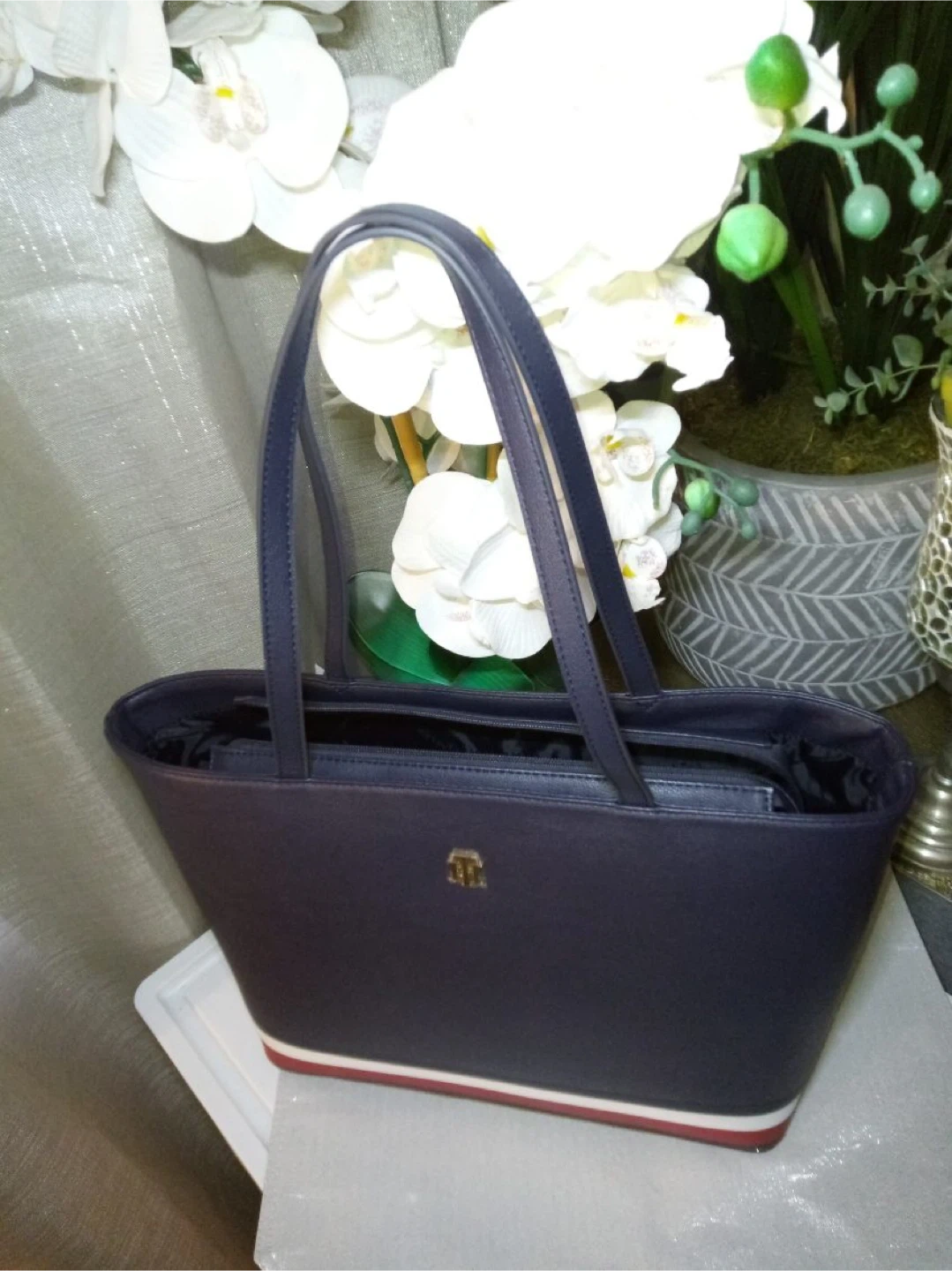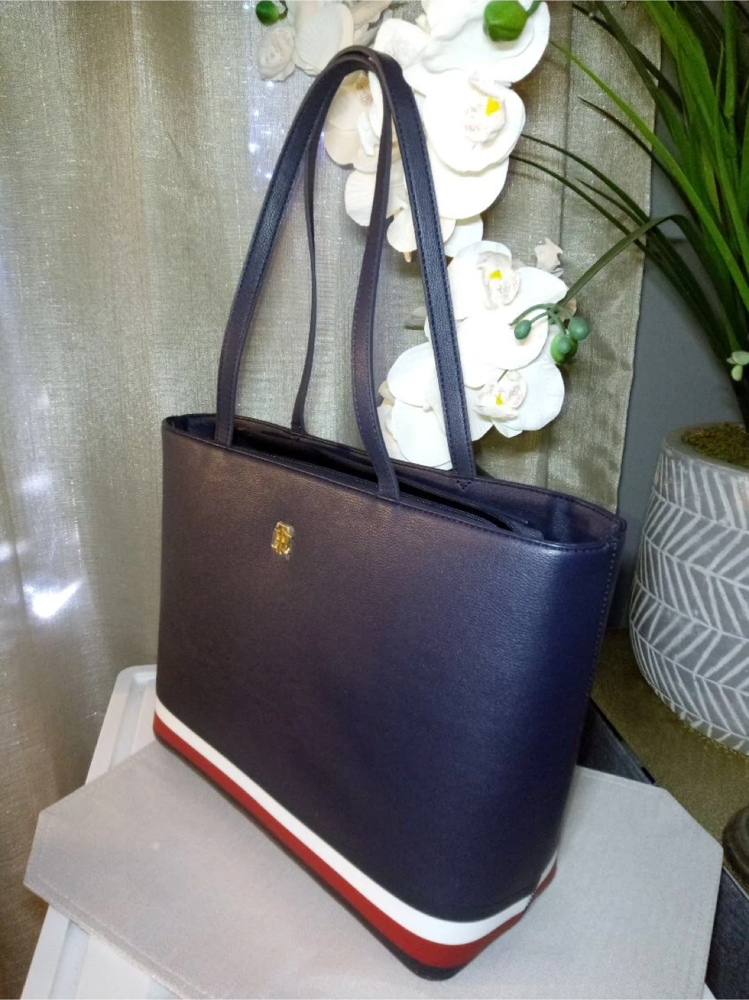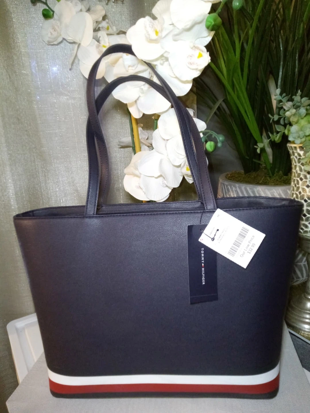 Check out this brand new Tommy Hilfiger tote bag! It's a beautiful navy blue color with the classic red, white, and navy stripe detail. The tag shows the original price was $119.00