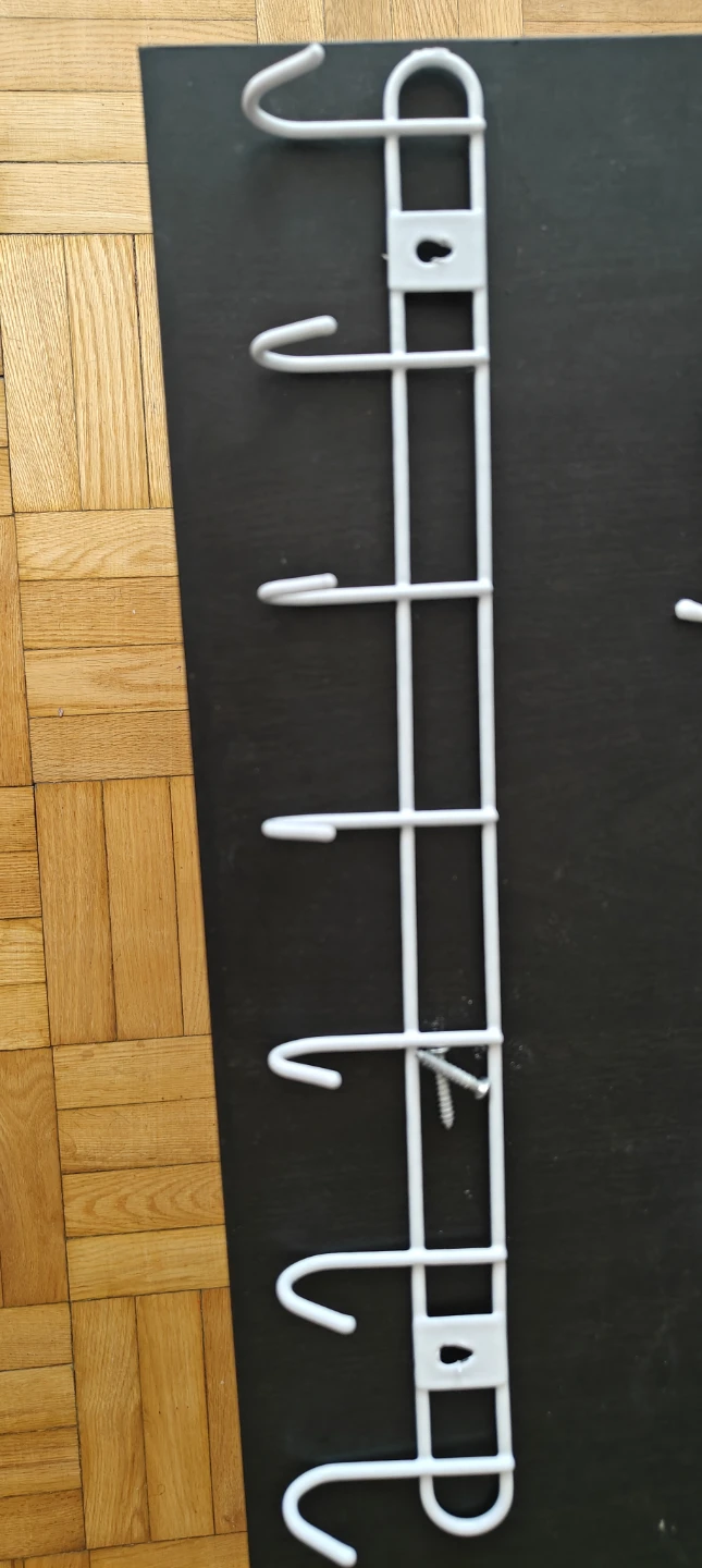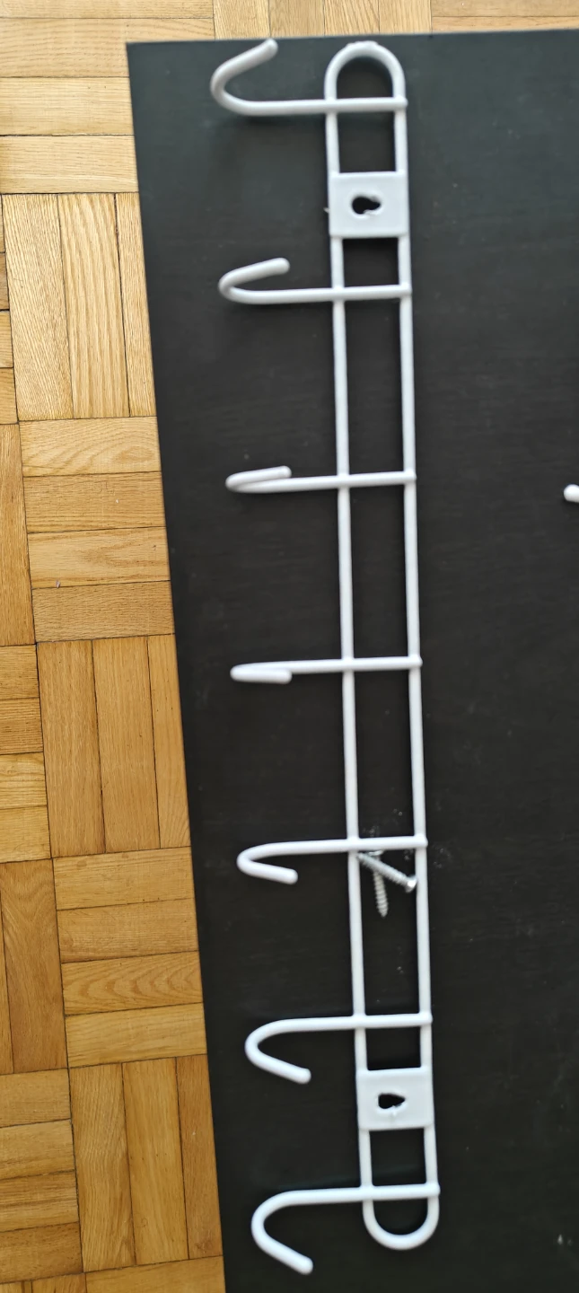 Here's a handy white metal hook rack that fits over the door! It's perfect for adding extra hanging space in your closet, bathroom, or entryway. It's in great condition and ready to use