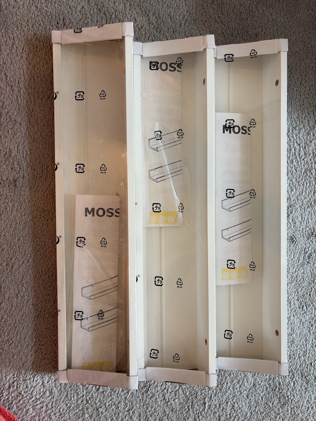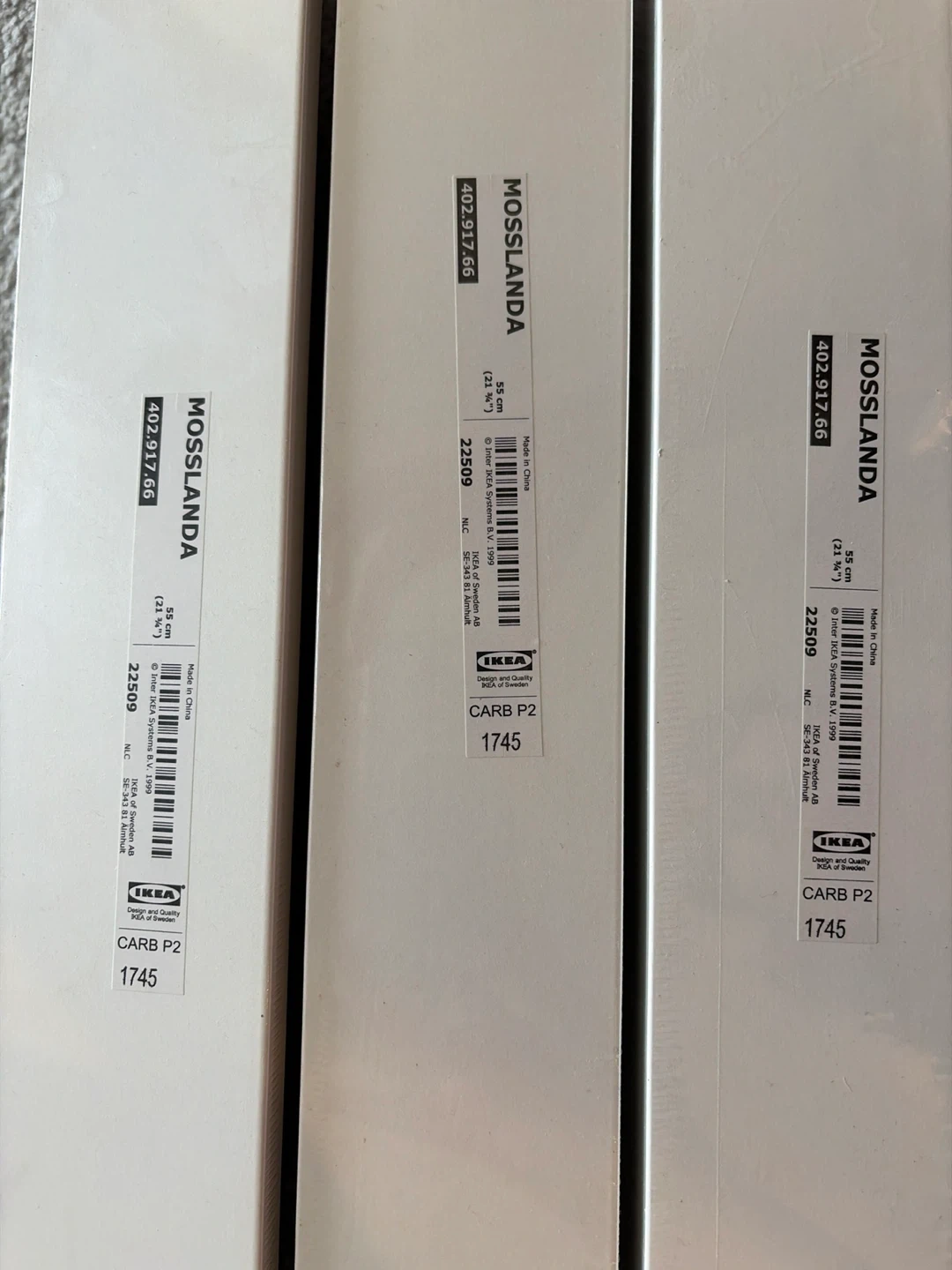 Selling 3 IKEA Mosslanda picture ledges/shelves in white. They are 55 cm (21 3/4") long. Perfect for displaying pictures or small items! They are still in their original packaging.