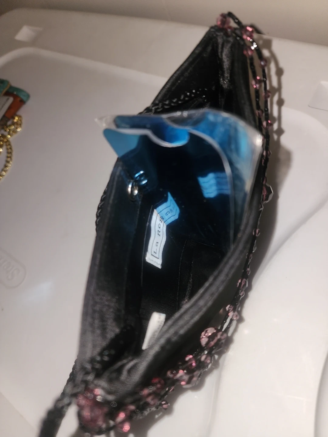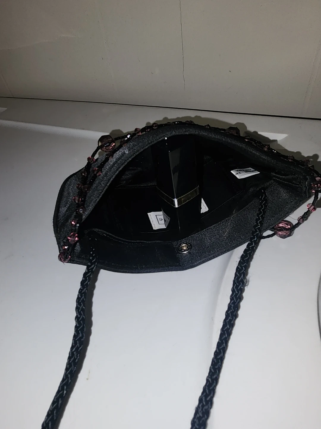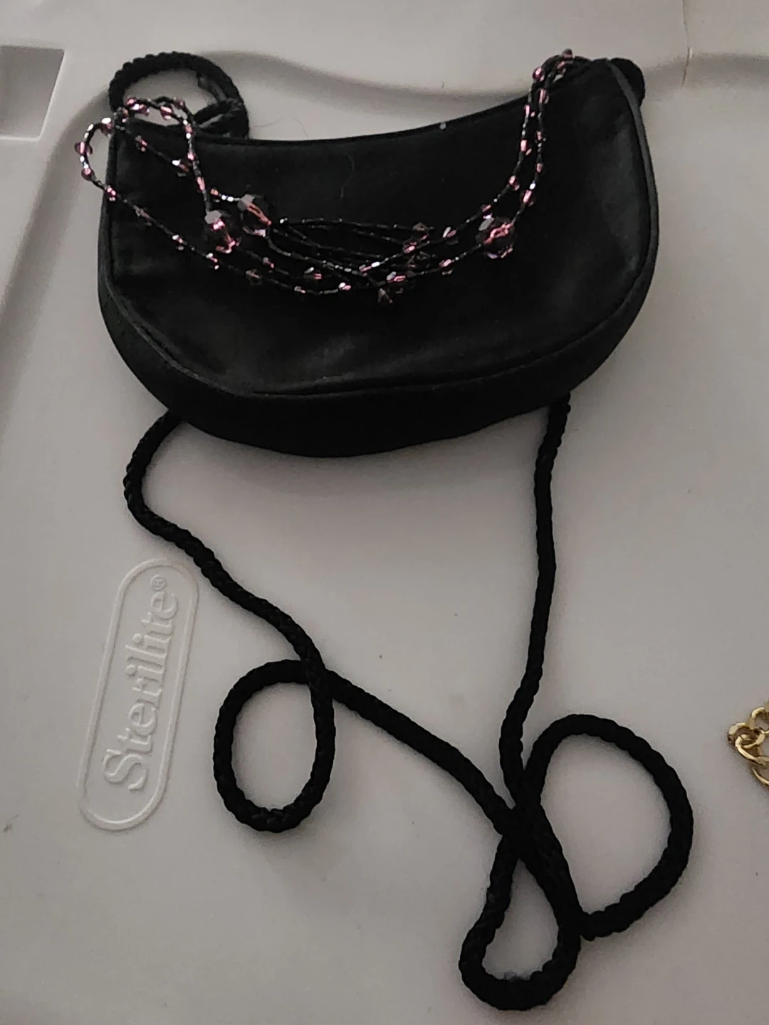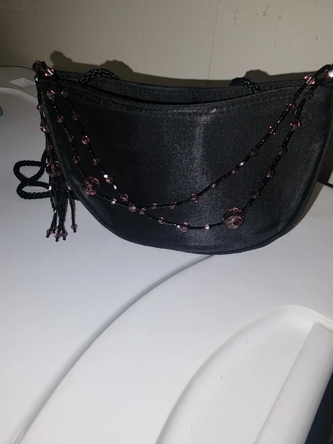 This is a cute littleblack evening bag to pair with that perfect little black dress. It has a beaded design and a long braided strap. Small inner cc pocket. Simple snap closure. Great for when you want to go munimalist. Just big enough to hold a credit card, a few dollars, a pen, your lipstick and mascara. It is in good condition and perfect for a night out!