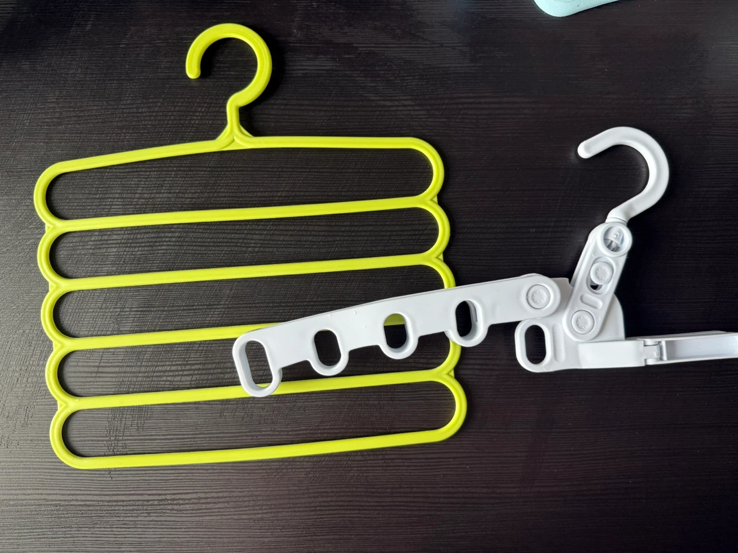 Selling clothes hangers! Green one has multiple bars for pants or scarves. White one folds up for easy storage.