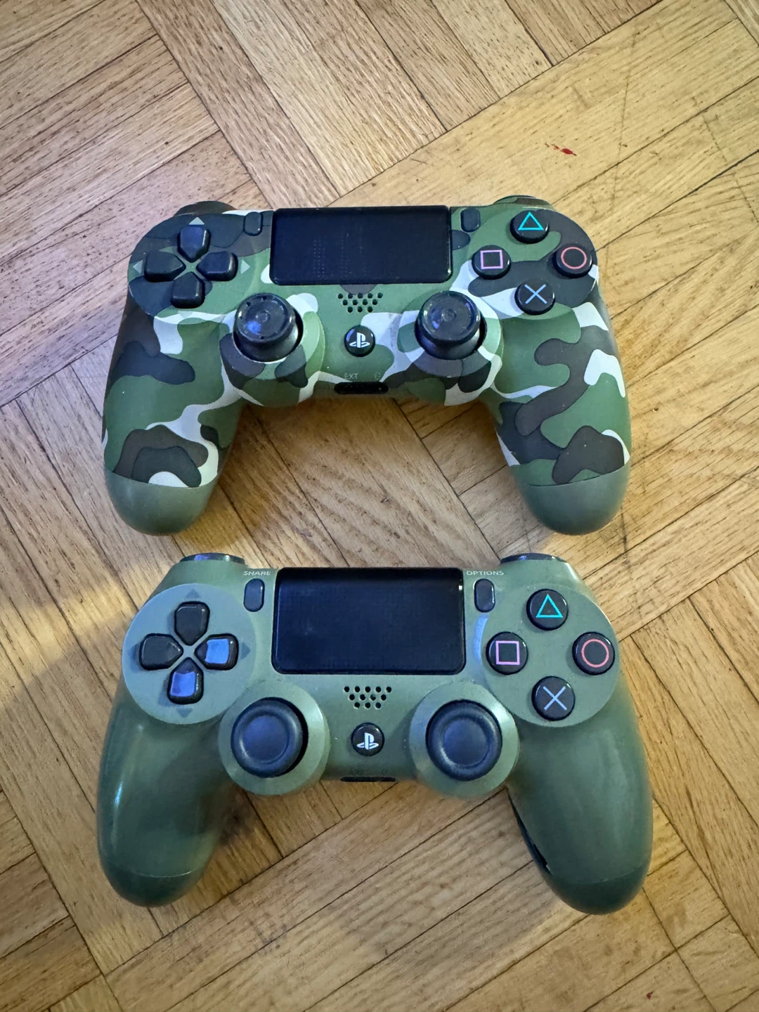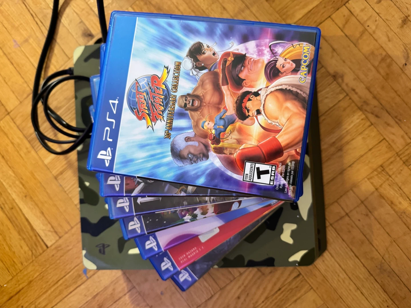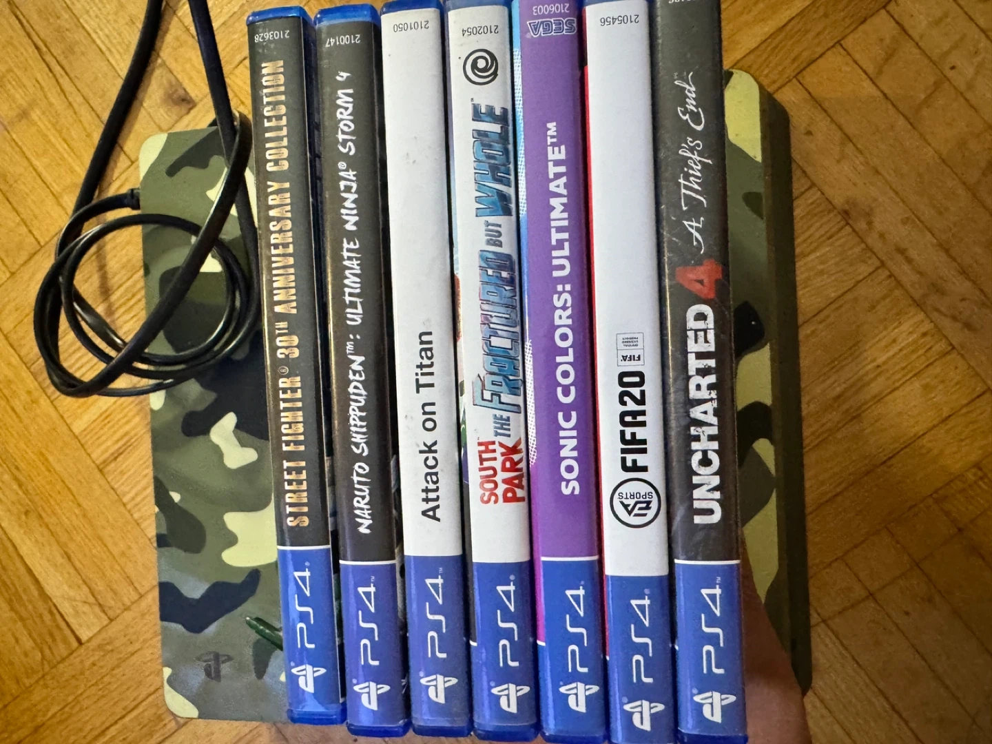 Selling a used PS4 console with a unique camouflage design, along with several games and two controllers. One controller is camouflage, and the other is a solid green colour. Games include Street Fighter 30th Anniversary Collection, Naruto Shippuden: Ultimate Ninja Storm 4, Attack on Titan, South Park The Fractured But Whole, Sonic Colors: Ultimate, FIFA 20, and Uncharted 4: A Thief's End