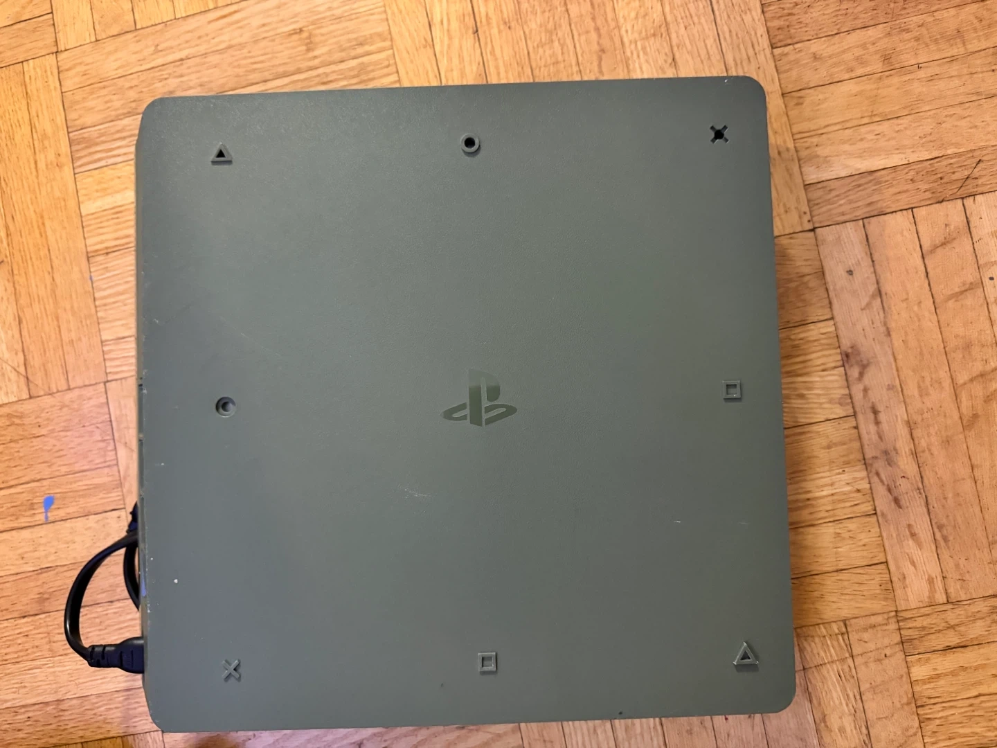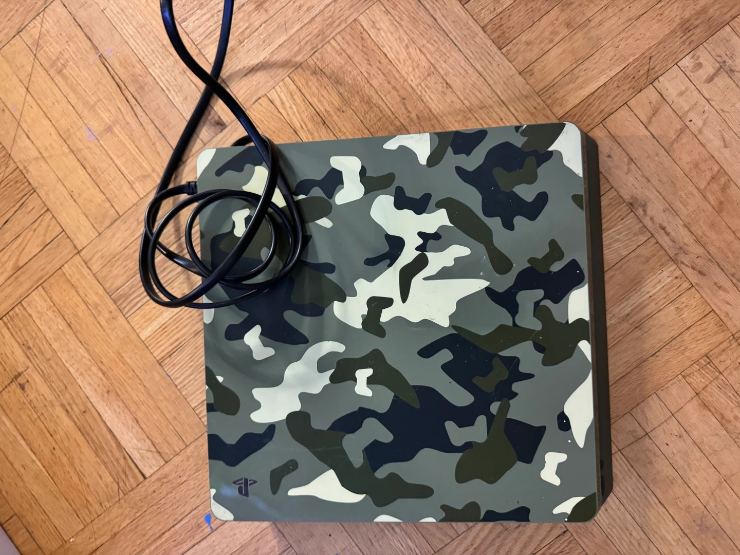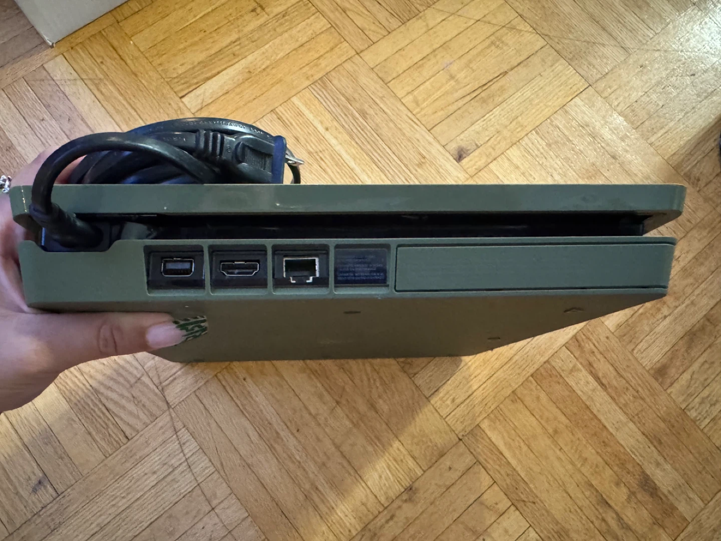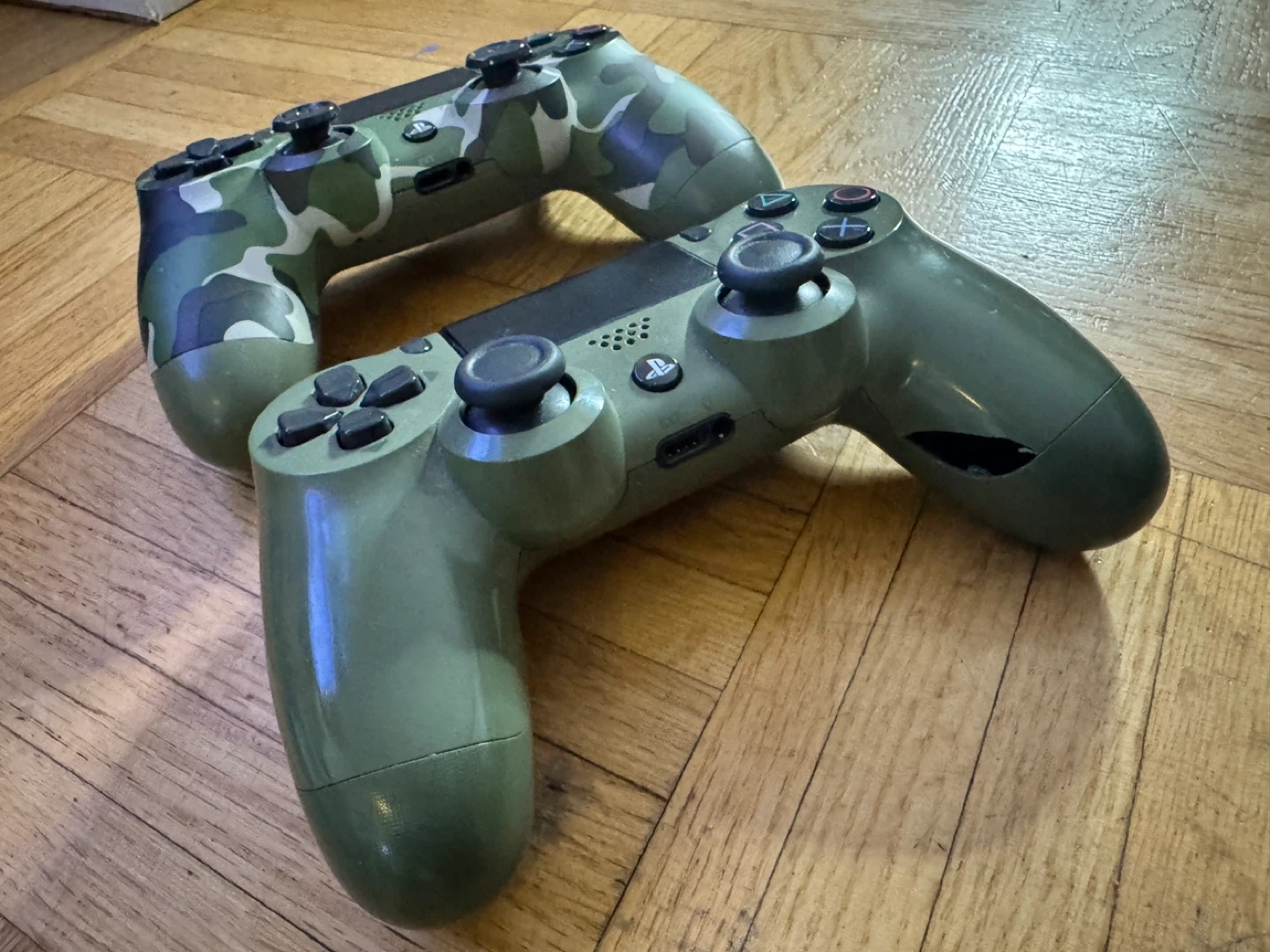 Selling a used PS4 console with a unique camouflage design, along with several games and two controllers. One controller is camouflage, and the other is a solid green colour. Games include Street Fighter 30th Anniversary Collection, Naruto Shippuden: Ultimate Ninja Storm 4, Attack on Titan, South Park The Fractured But Whole, Sonic Colors: Ultimate, FIFA 20, and Uncharted 4: A Thief's End
