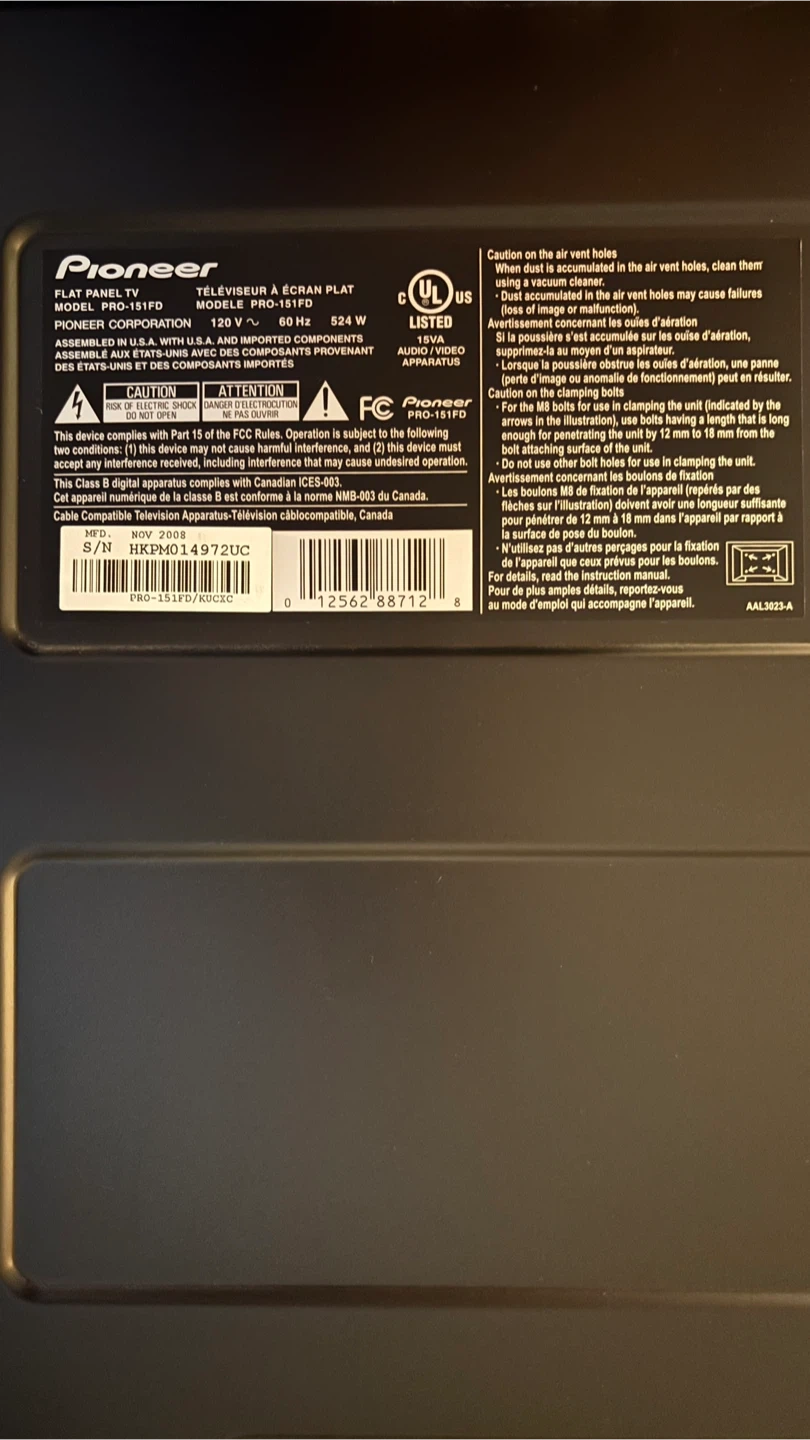 Selling a Pioneer flat panel TV, model PRO-1110HD (not smart)