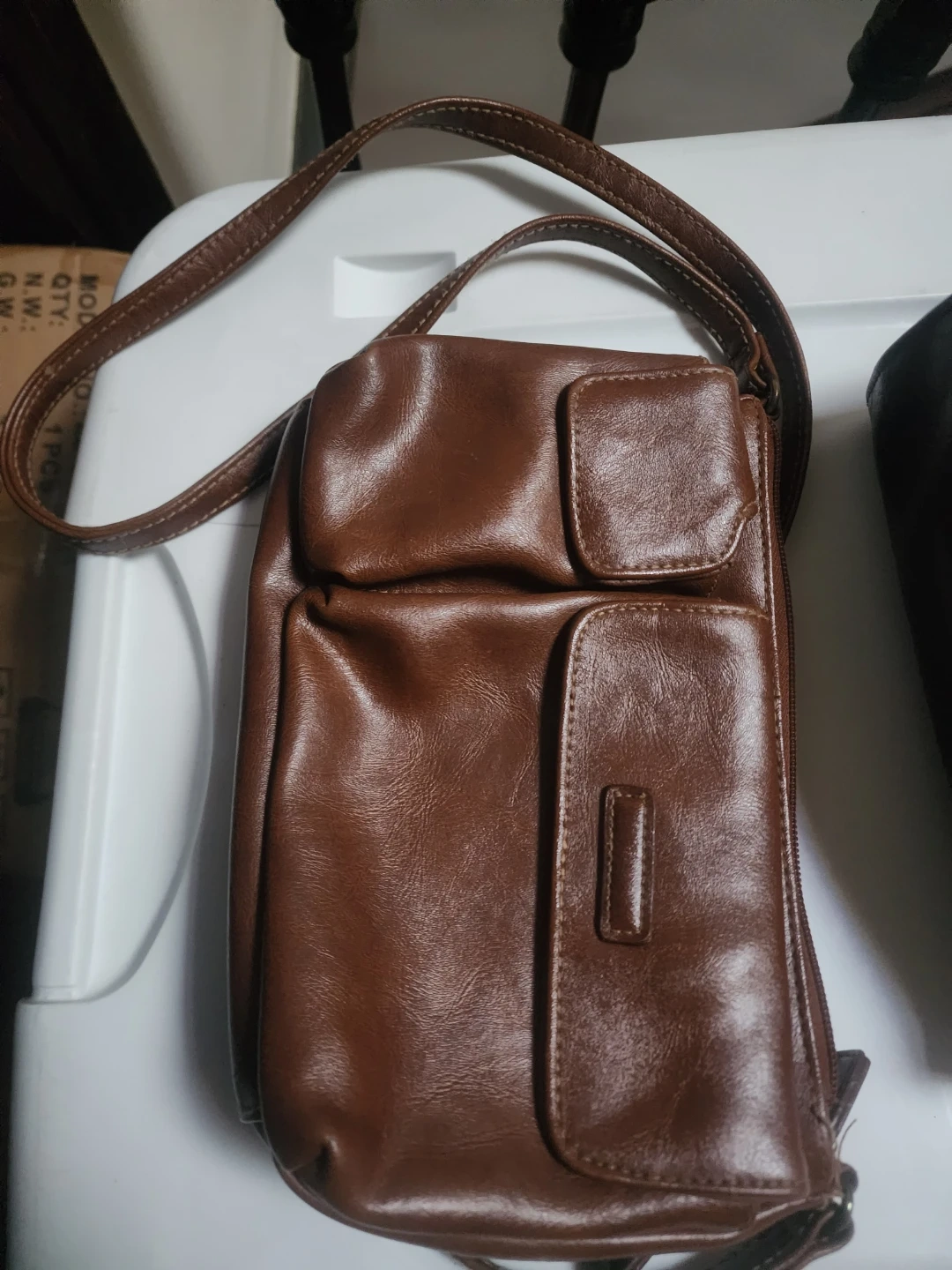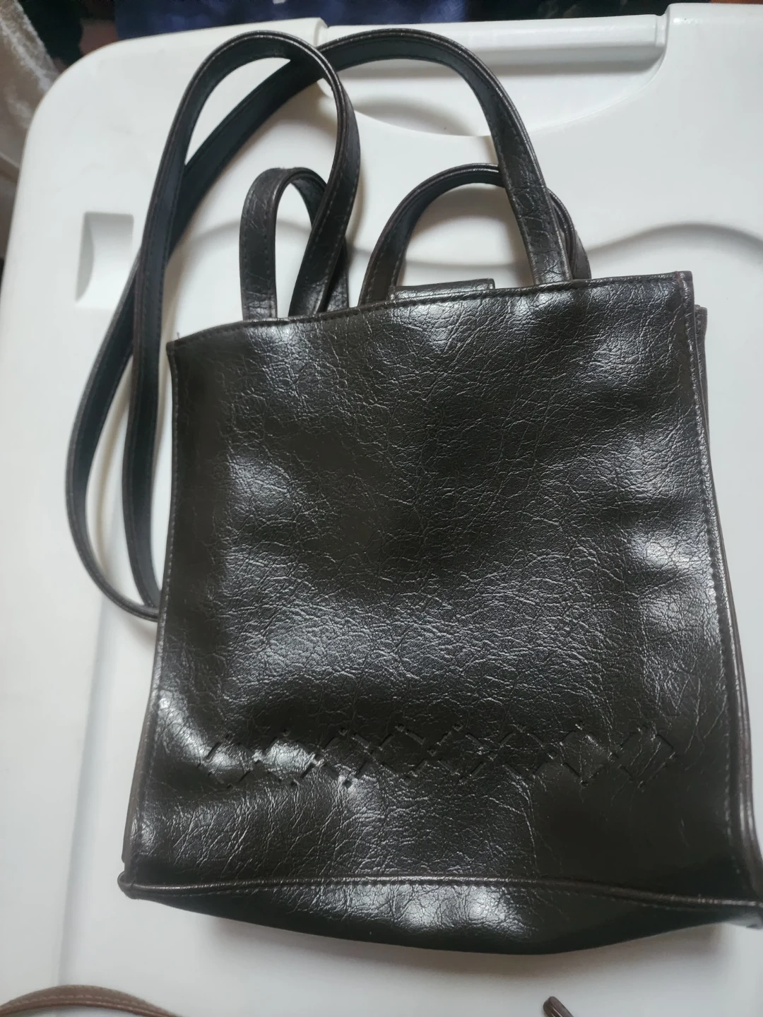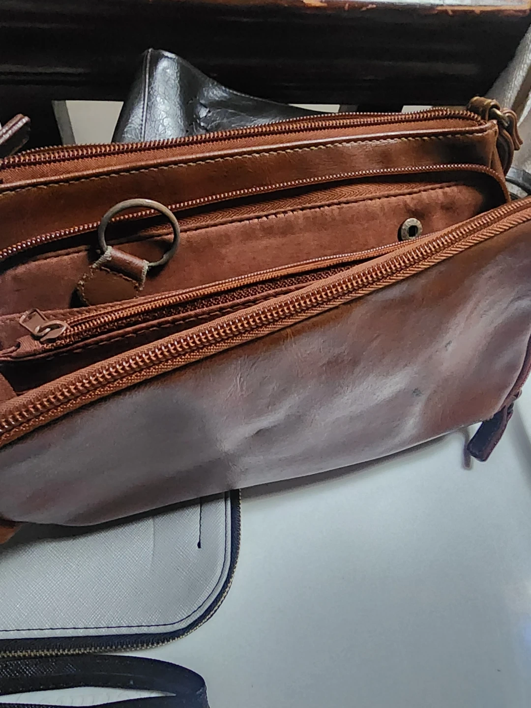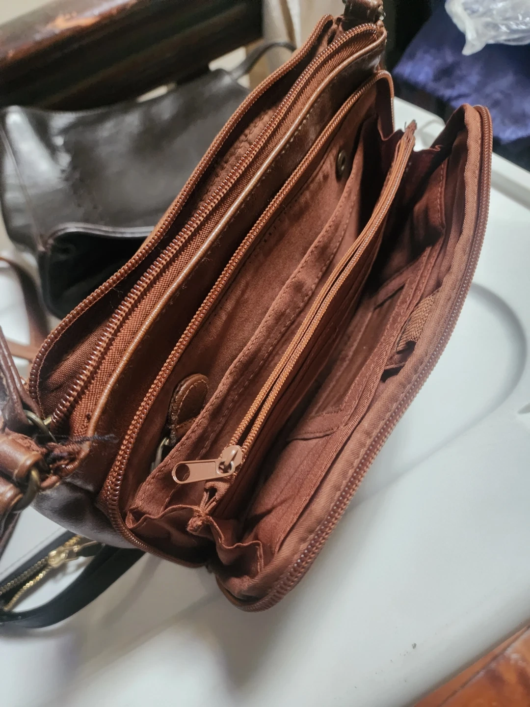 Selling a collection of used leather purses and handbags. There's a gray wristlet, a dark brown (almost black) shoulder bag. In good but used condition, as pictured.