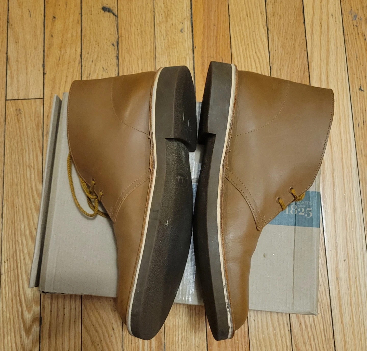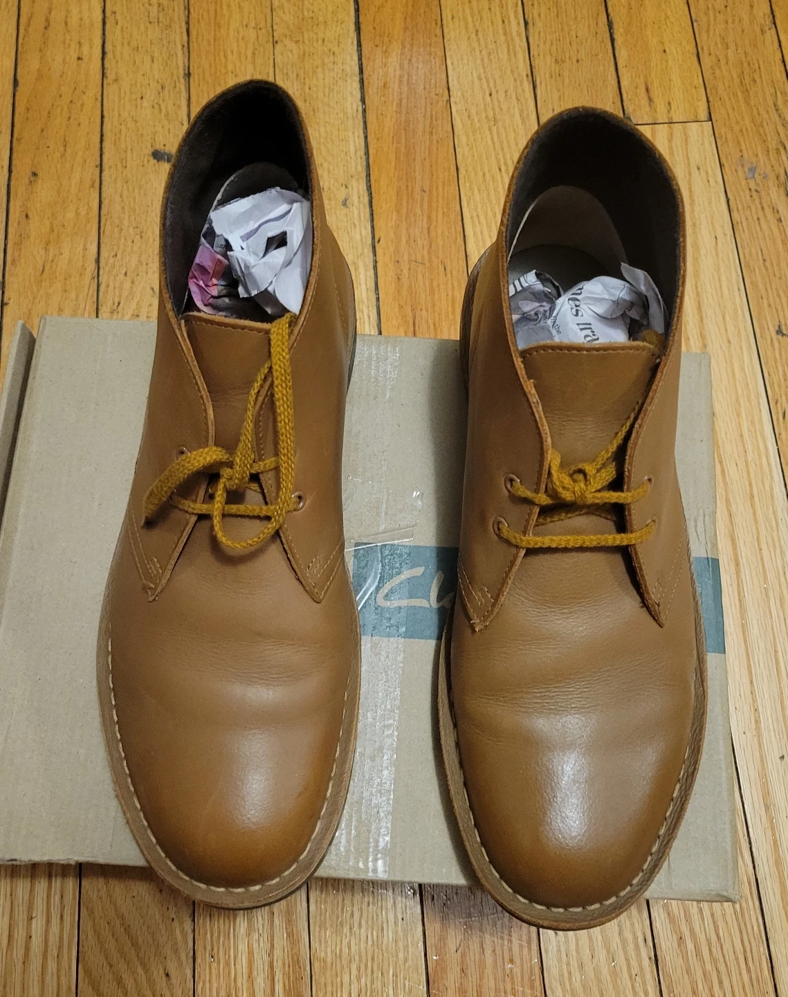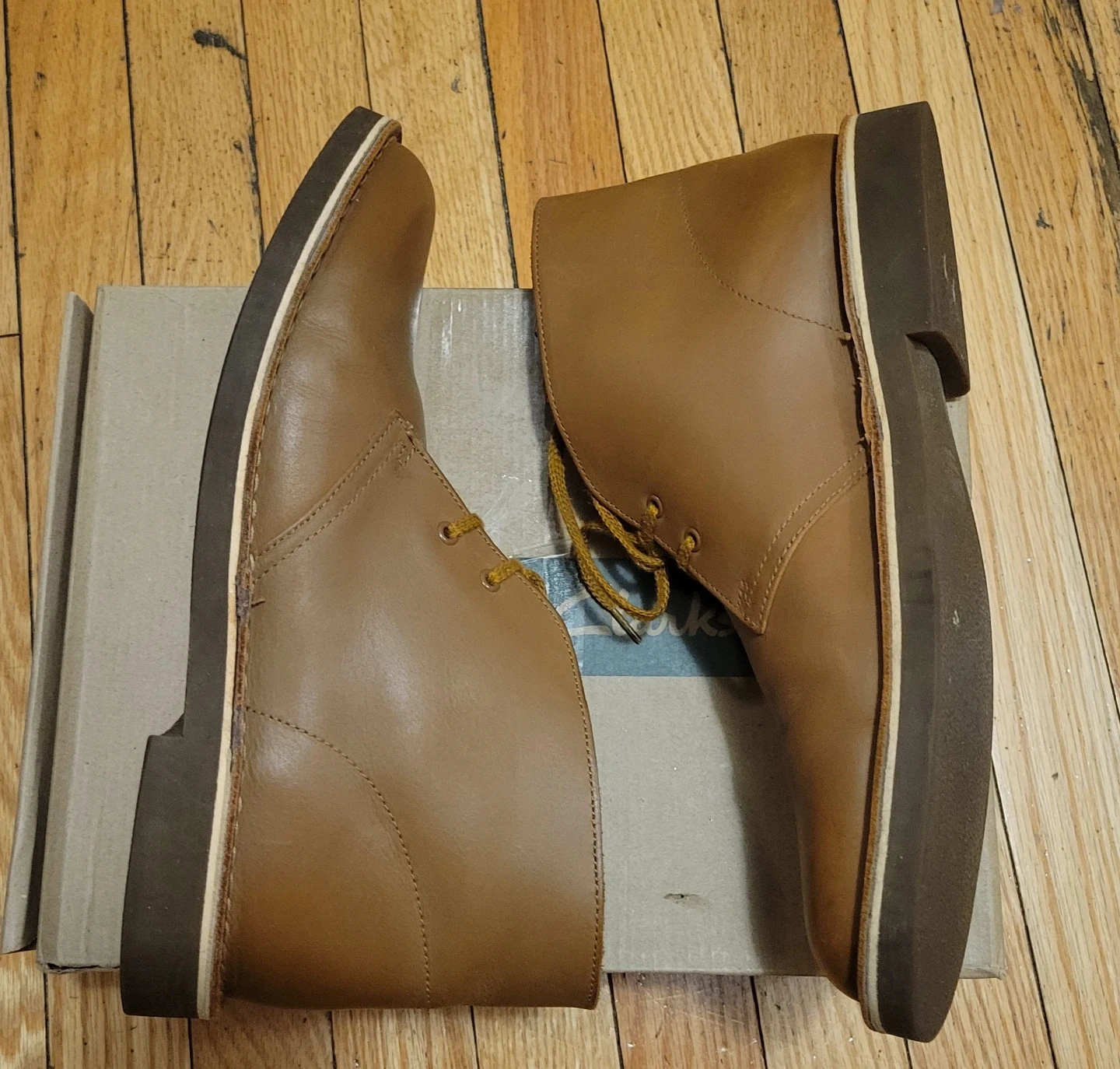 Selling a pair of Clarks Bushacre 2 boots in tan leather. They are size 9.5. The original box is included!