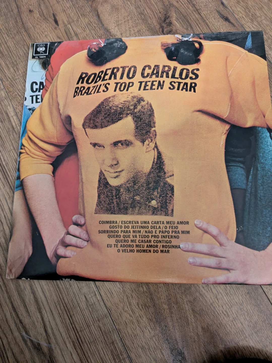 Selling a Roberto Carlos Brazil's Top Teen Star vinyl record. The record includes the songs: Coimbra, Gosto Do Jeitinho Dela, Sorrindo Para Mim, Quero Que Va Tudo Pro Inferno, Quero Me Casar Contigo, Eu Te Adoro Meu Amor, and O Velho Homen Do Mar