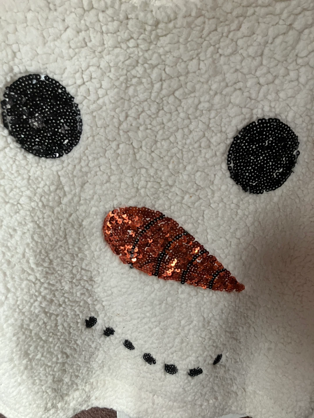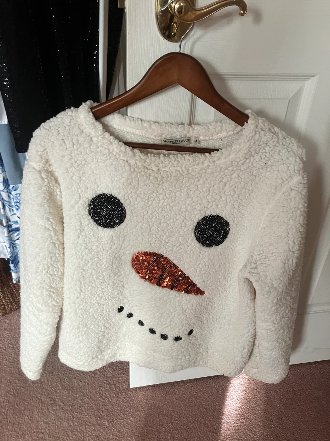 Selling a snowman sweater in a size large. It's a super cute and cozy sweater with a sequin snowman design on the front for some sparkle!.