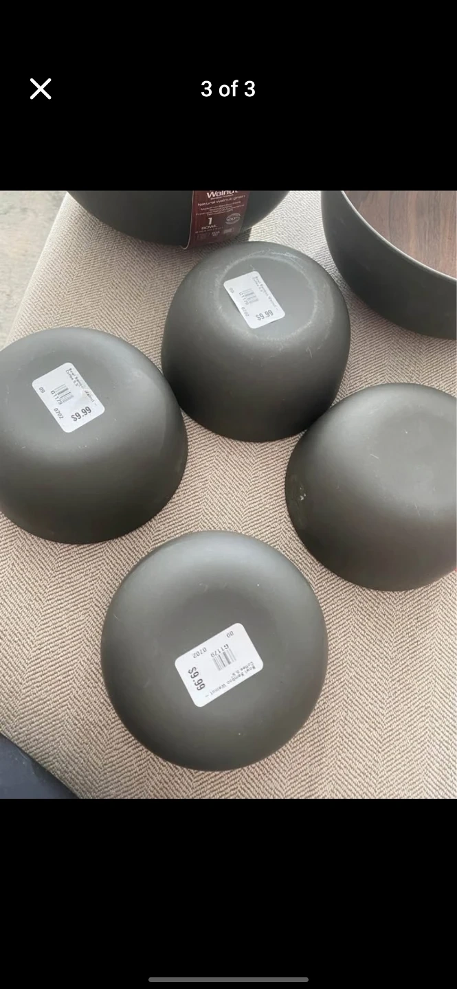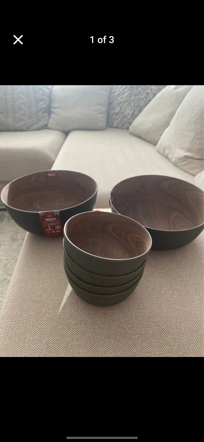 Selling a Walnut bowl set. Includes three larger bowls and four smaller bowls. They're in great condition and would look great in any kitchen. Each of the smaller bowls were originally bought for $9.99 and the larger bowls were originally bought for $24.99