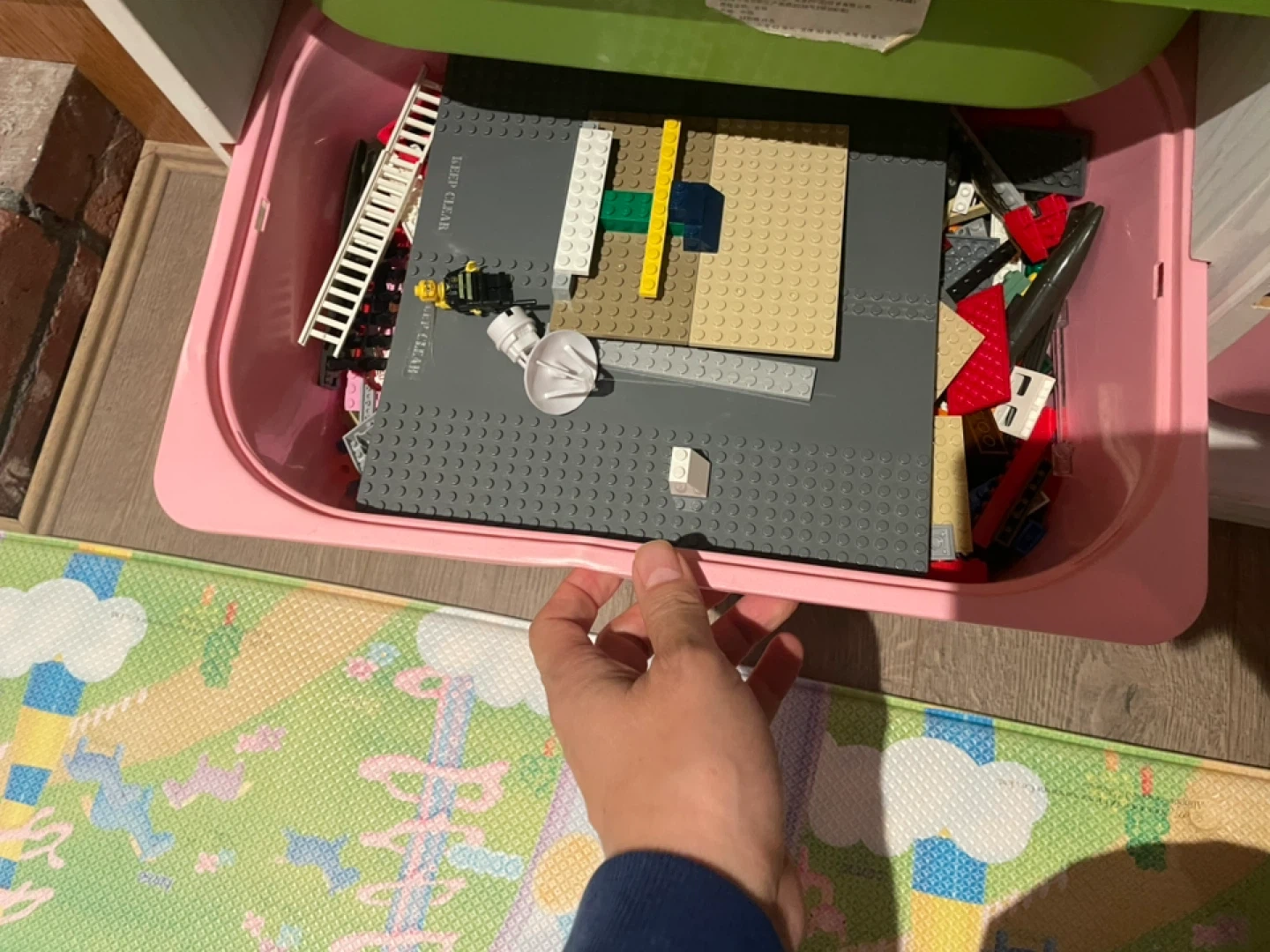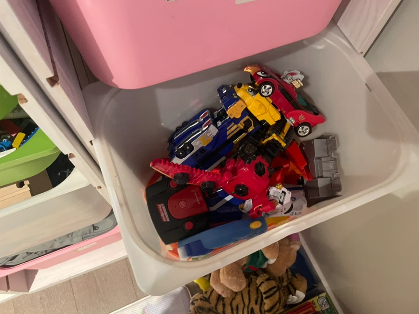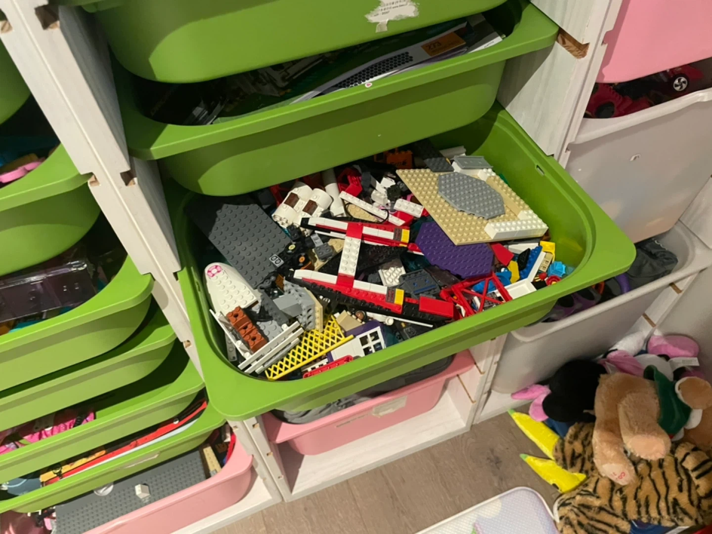 Selling a collection of mixed LEGO sets, INCLUDING the green/white/pink plastic bins and the white storage organizer itself as well.