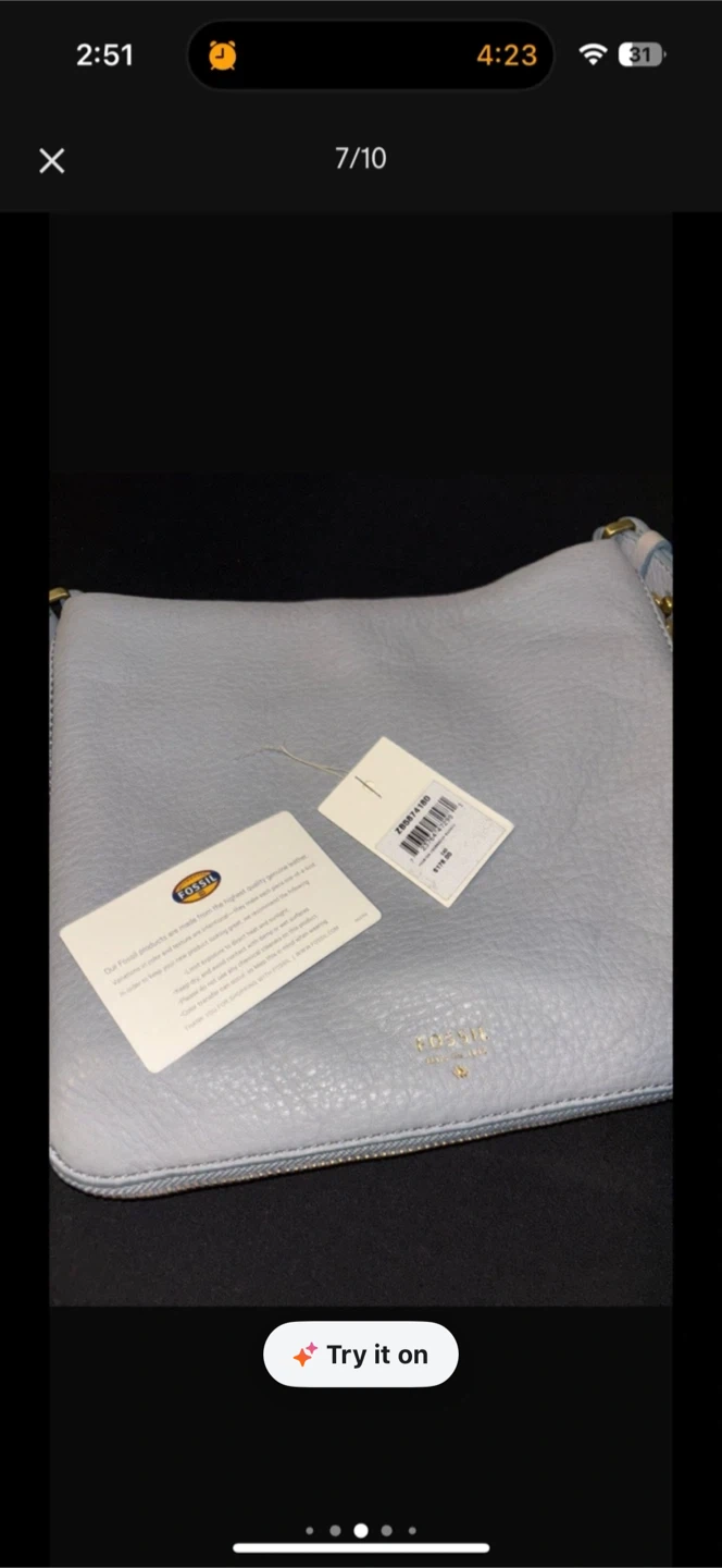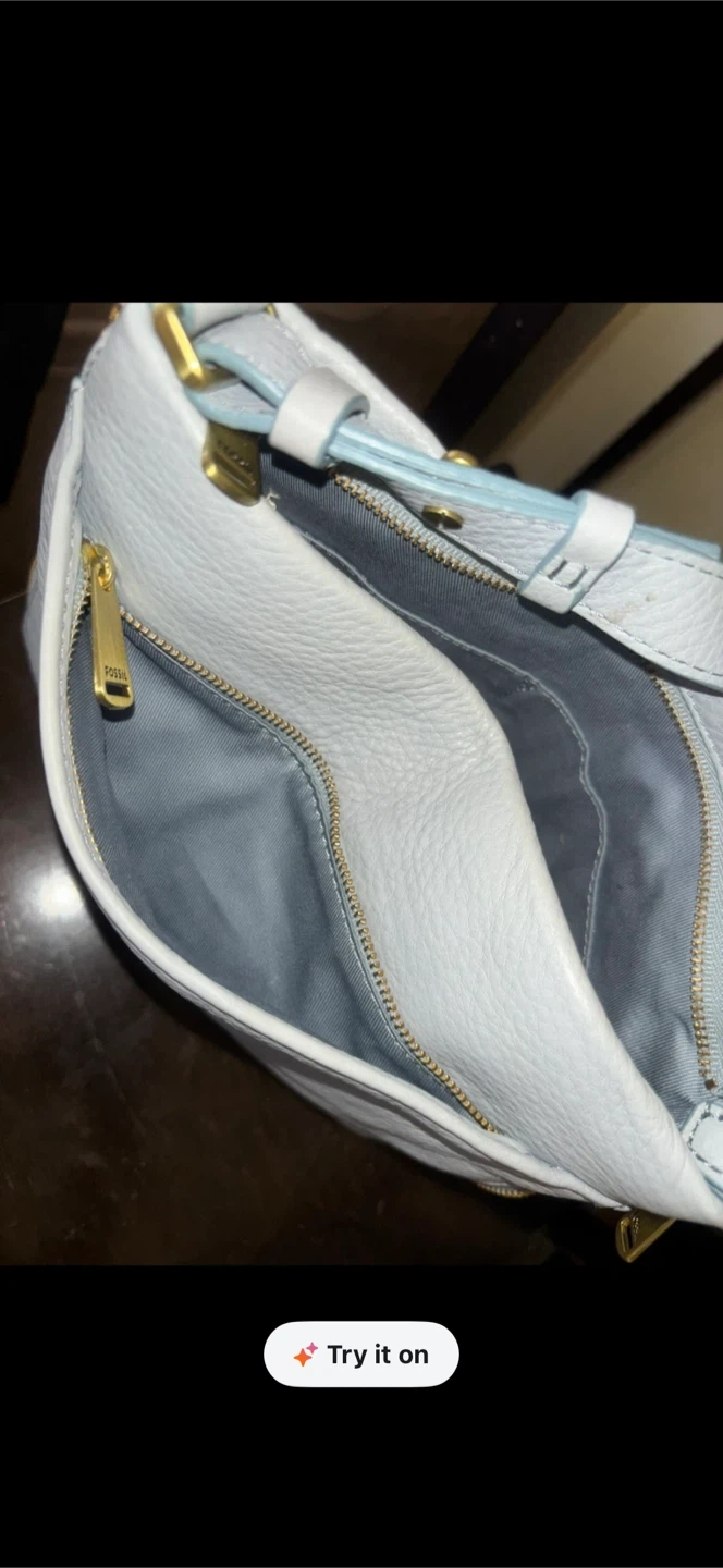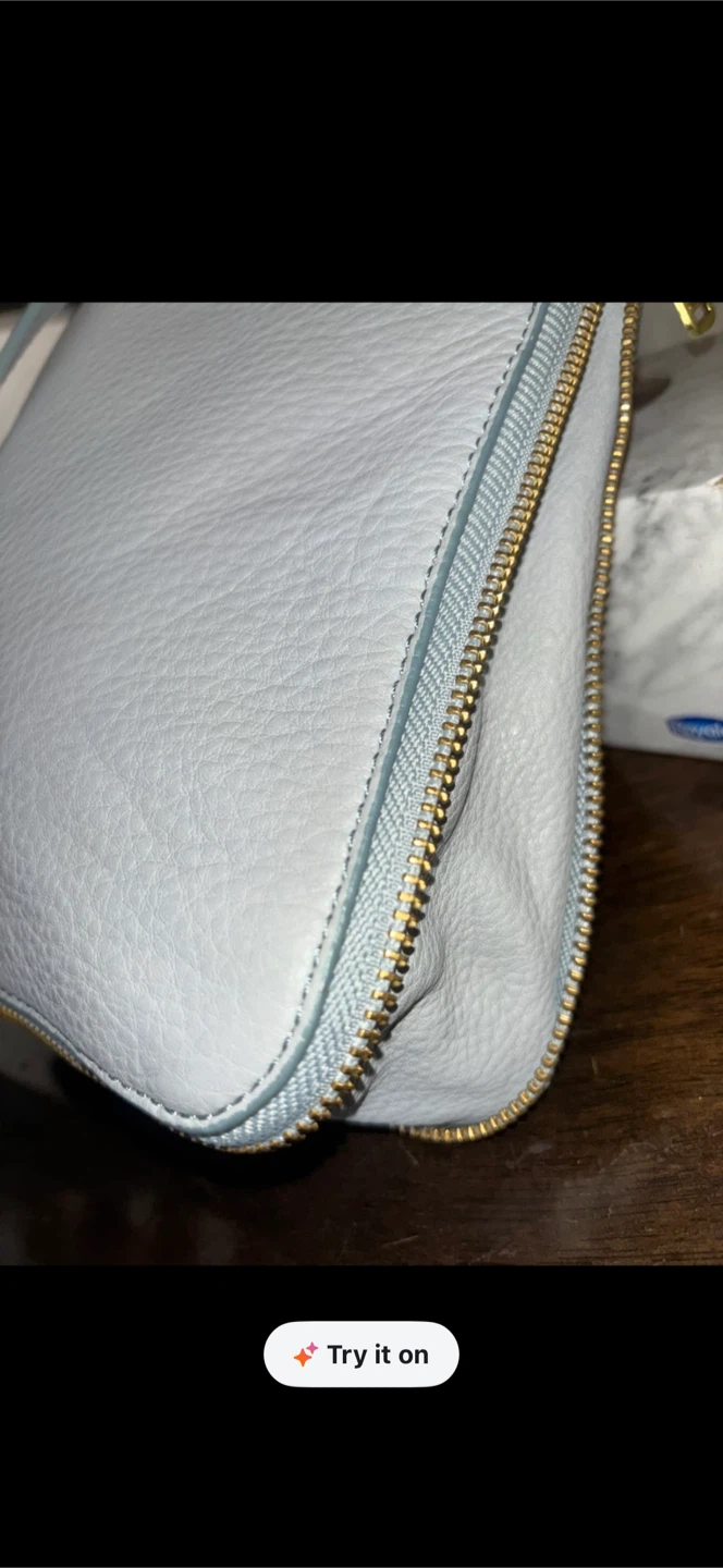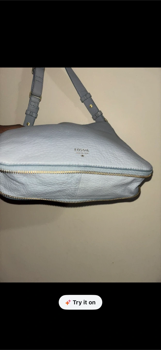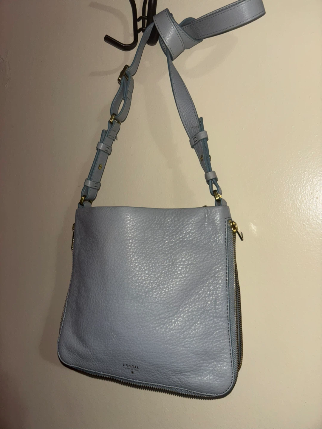 Selling a lovely Fossil crossbody bag in a soft, light blue colour. It's made of genuine leather and has a stylish design. The bag is in new condition was at 170+tax and perfect for everyday use!