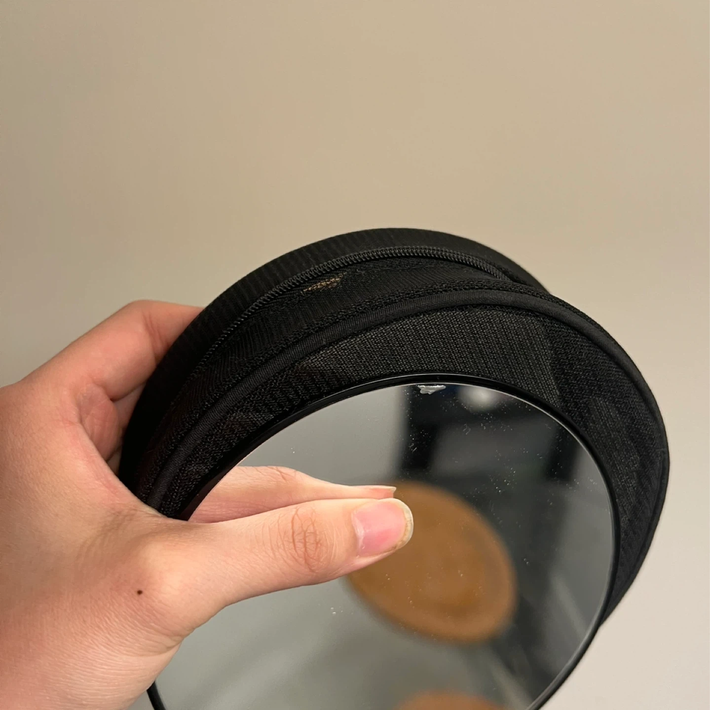Good condition, small stain on black bag and crack on the mirror as shown in last photo (can’t be felt to the touch, it’s on the inside). Mirror fits perfectly in the pouch. Great for travel and makeup storage!