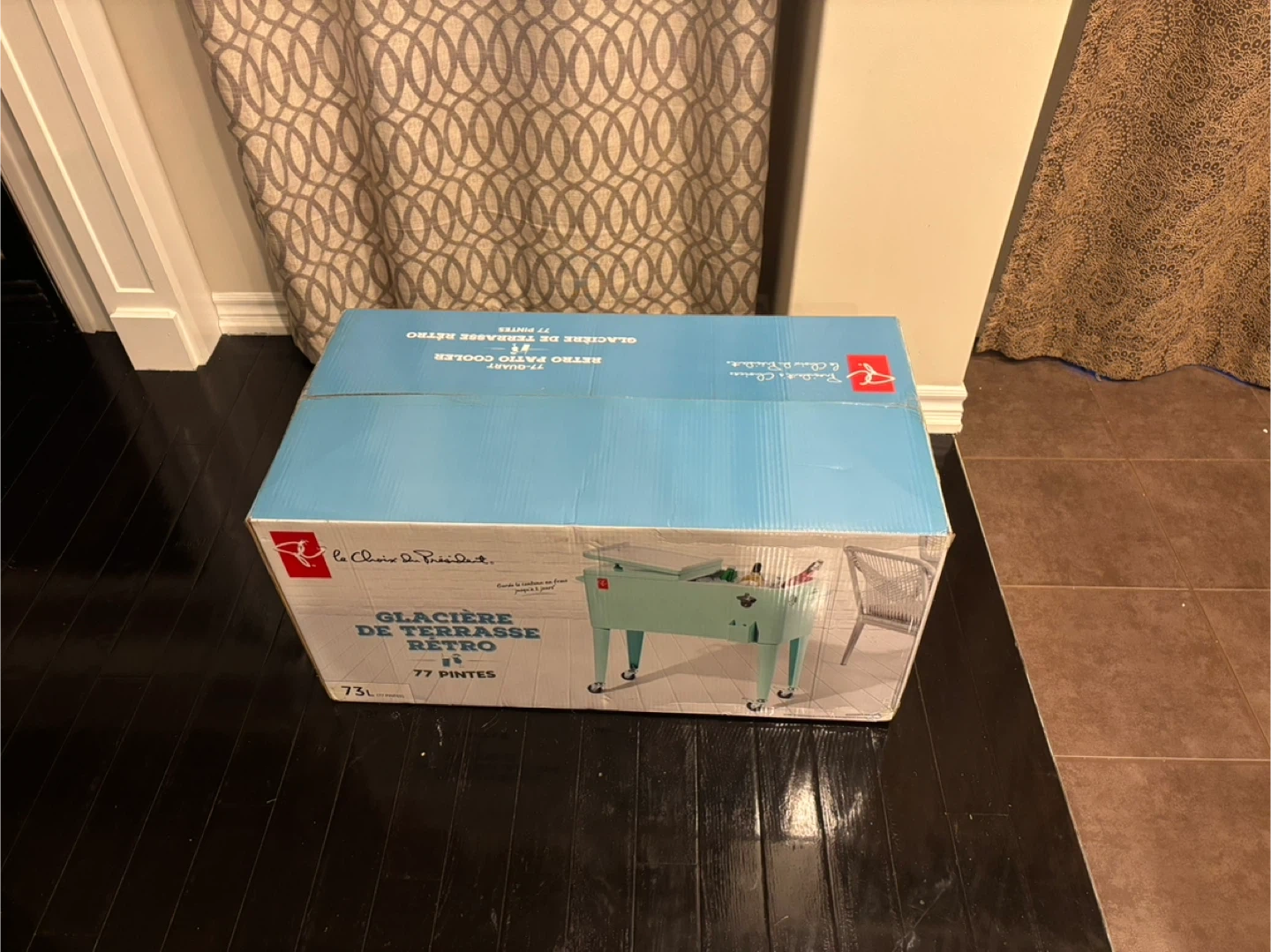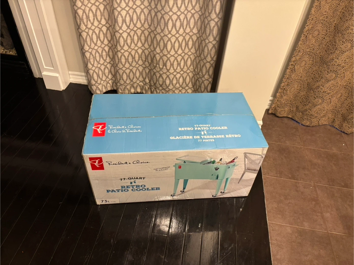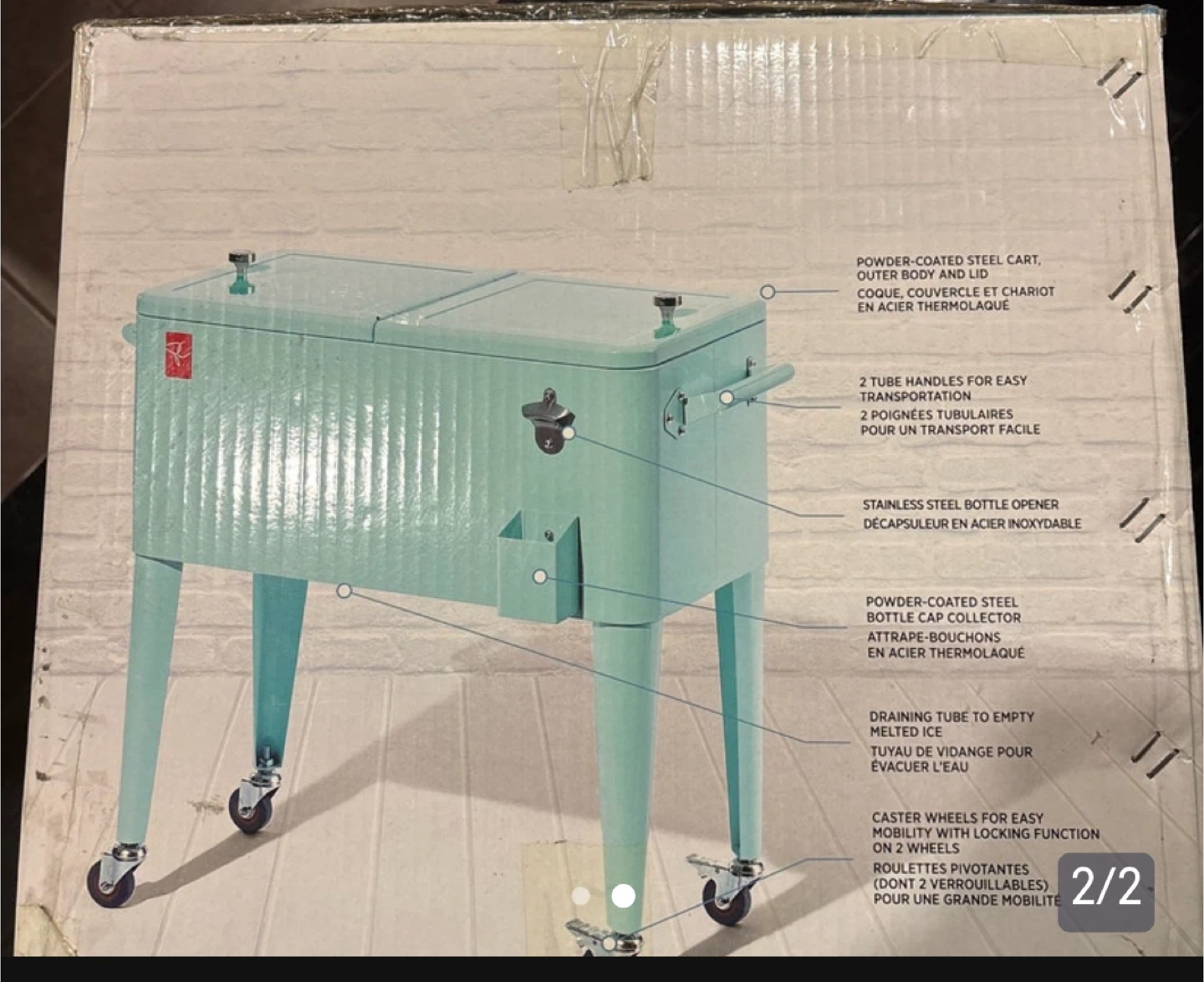 Selling a President's Choice 77-Quart Retro Patio Cooler. It features a powder-coated steel cart, body, and lid. It also has two tubes for easy transportation and a stainless steel bottle opener. The cooler includes a powder-coated steel bottle cap collector and a draining tube to empty melted ice. It also has caster wheels for easy mobility with a locking function