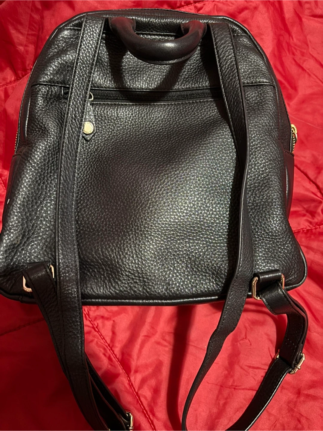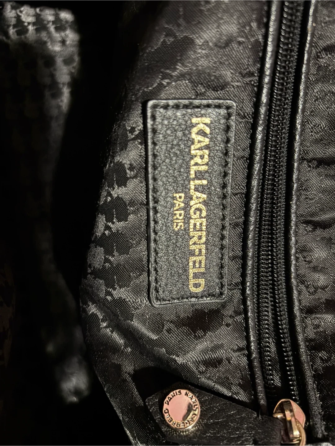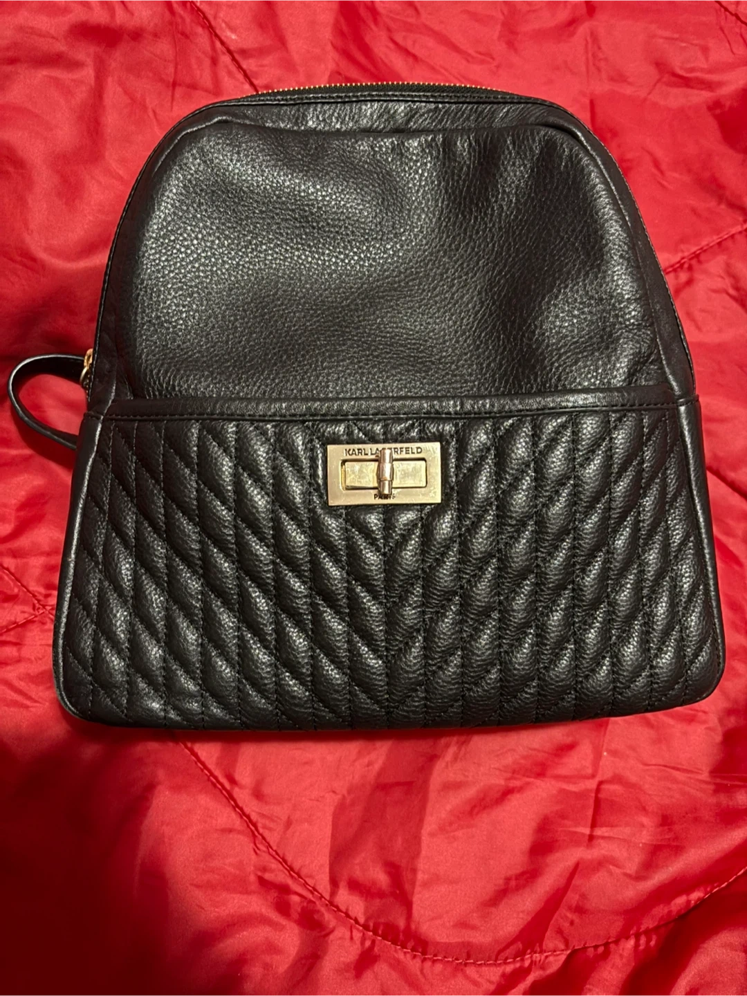 Selling a stylish Karl Lagerfeld Paris black leather backpack. It's in great condition and perfect for everyday use. Features a quilted front pocket and adjustable straps