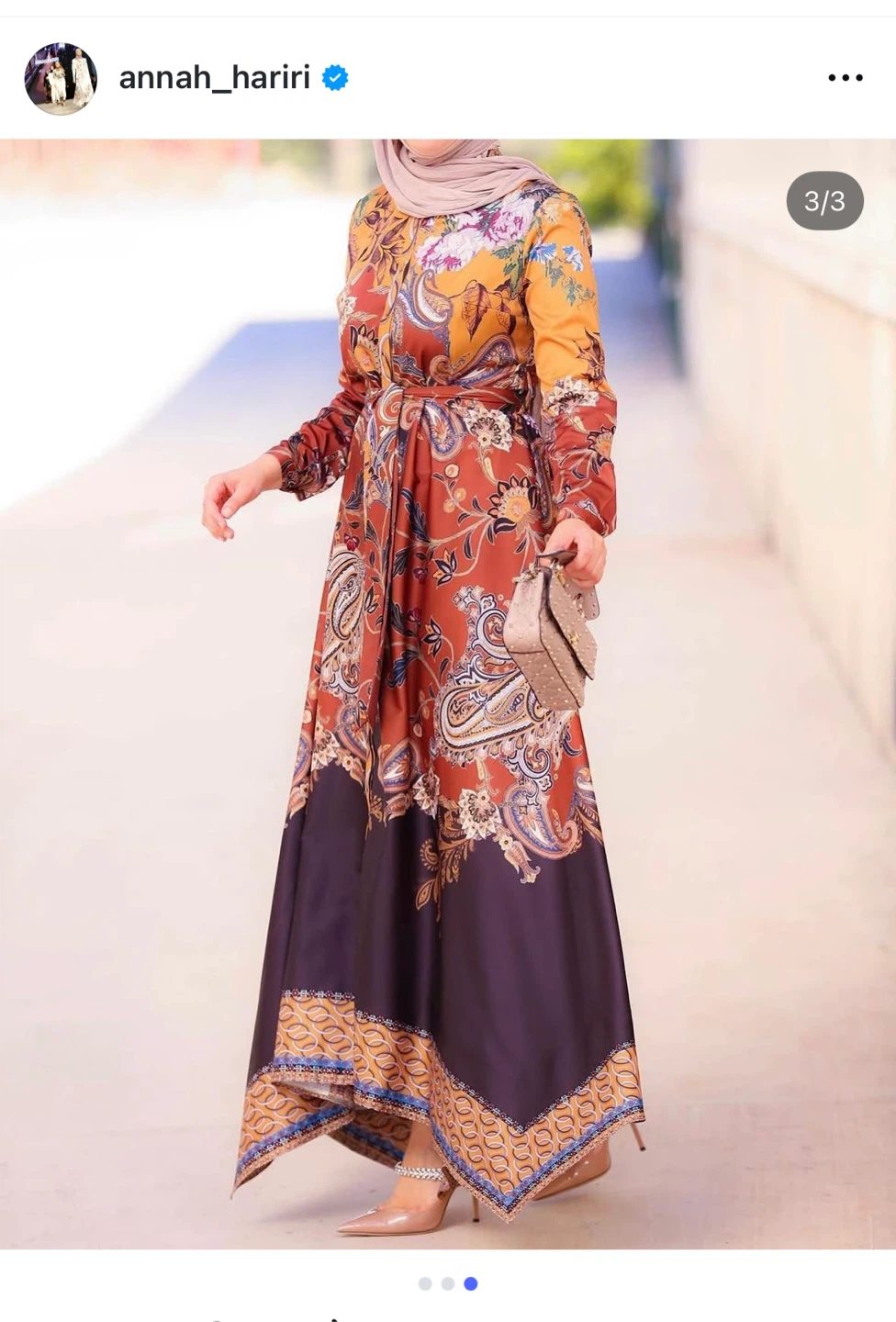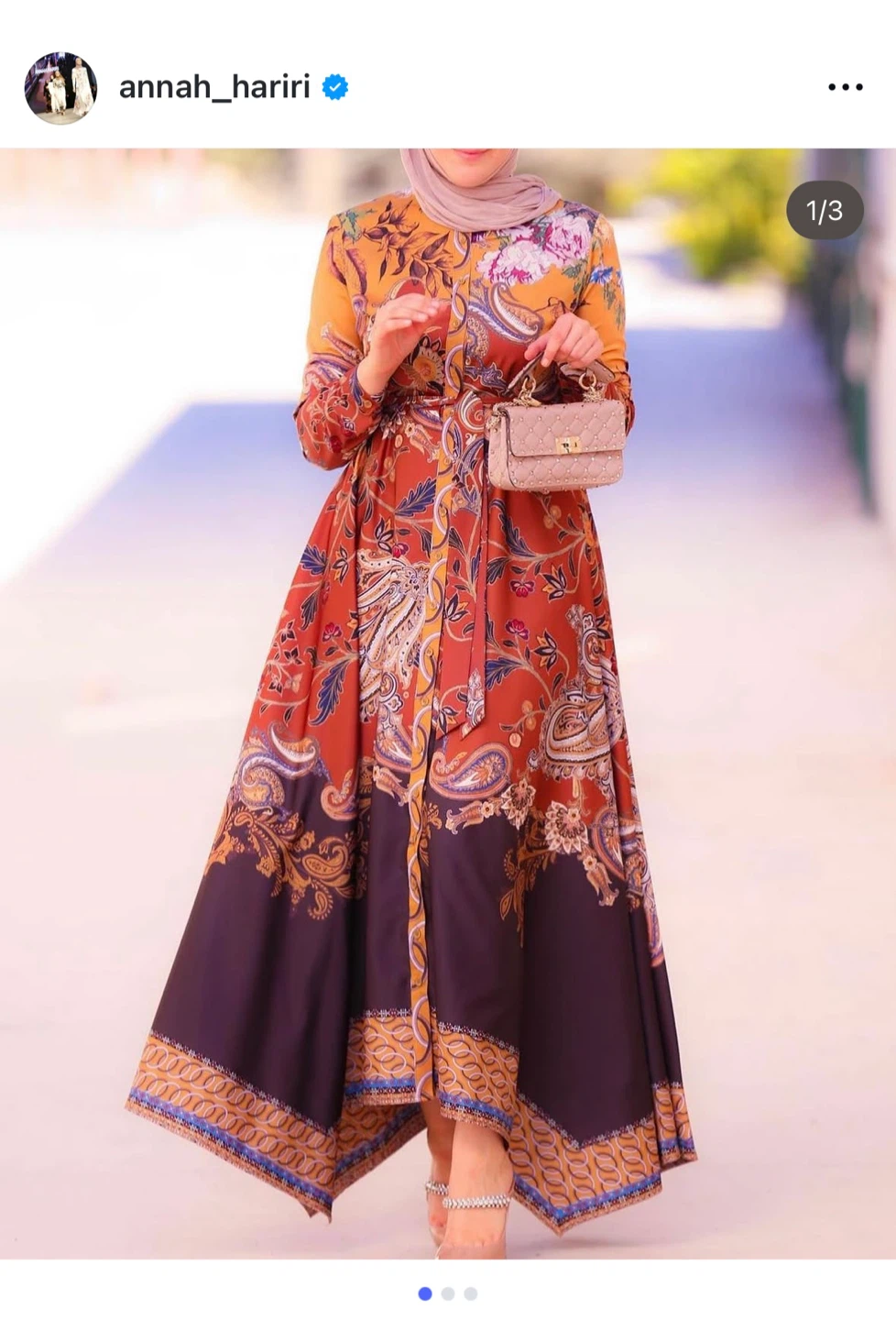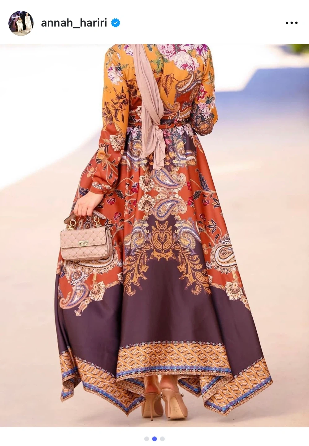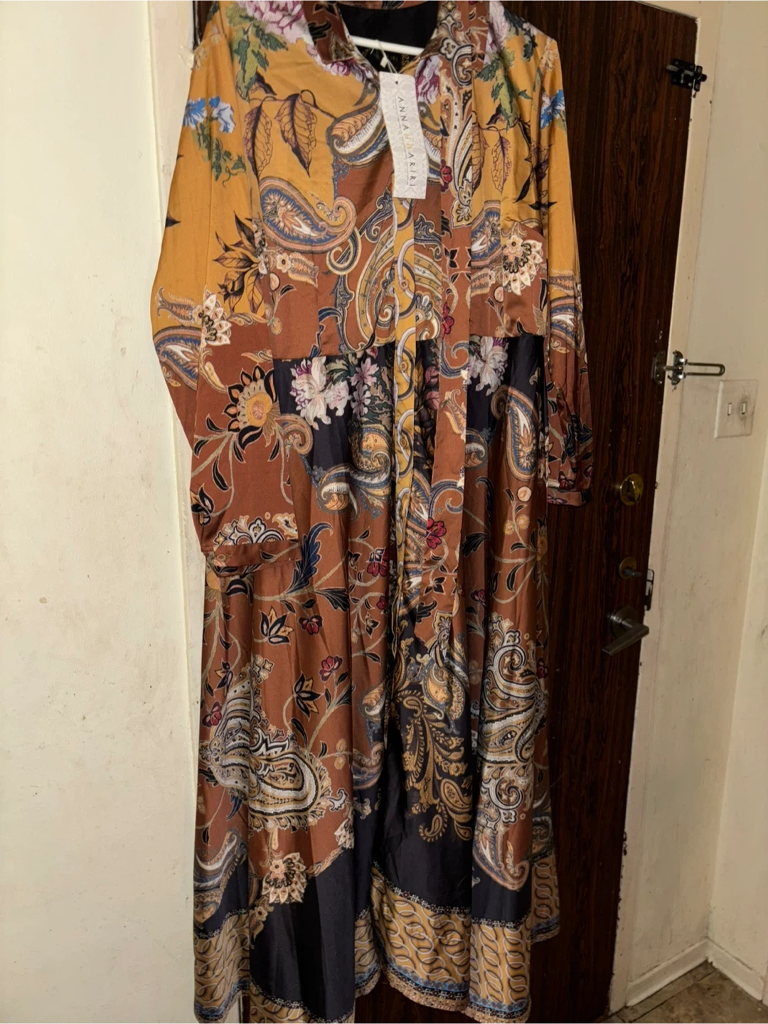 Beautiful ANNAH HARIRI dress with a unique paisley and floral pattern in shades of brown, gold, and black. It's in great condition and ready for a new home!
