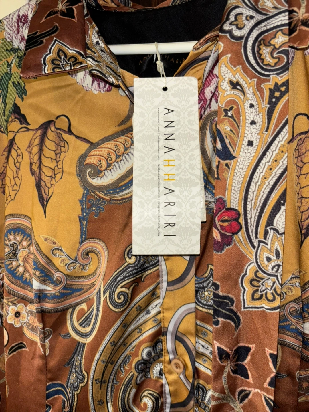 Beautiful ANNAH HARIRI dress with a unique paisley and floral pattern in shades of brown, gold, and black. It's in great condition and ready for a new home!