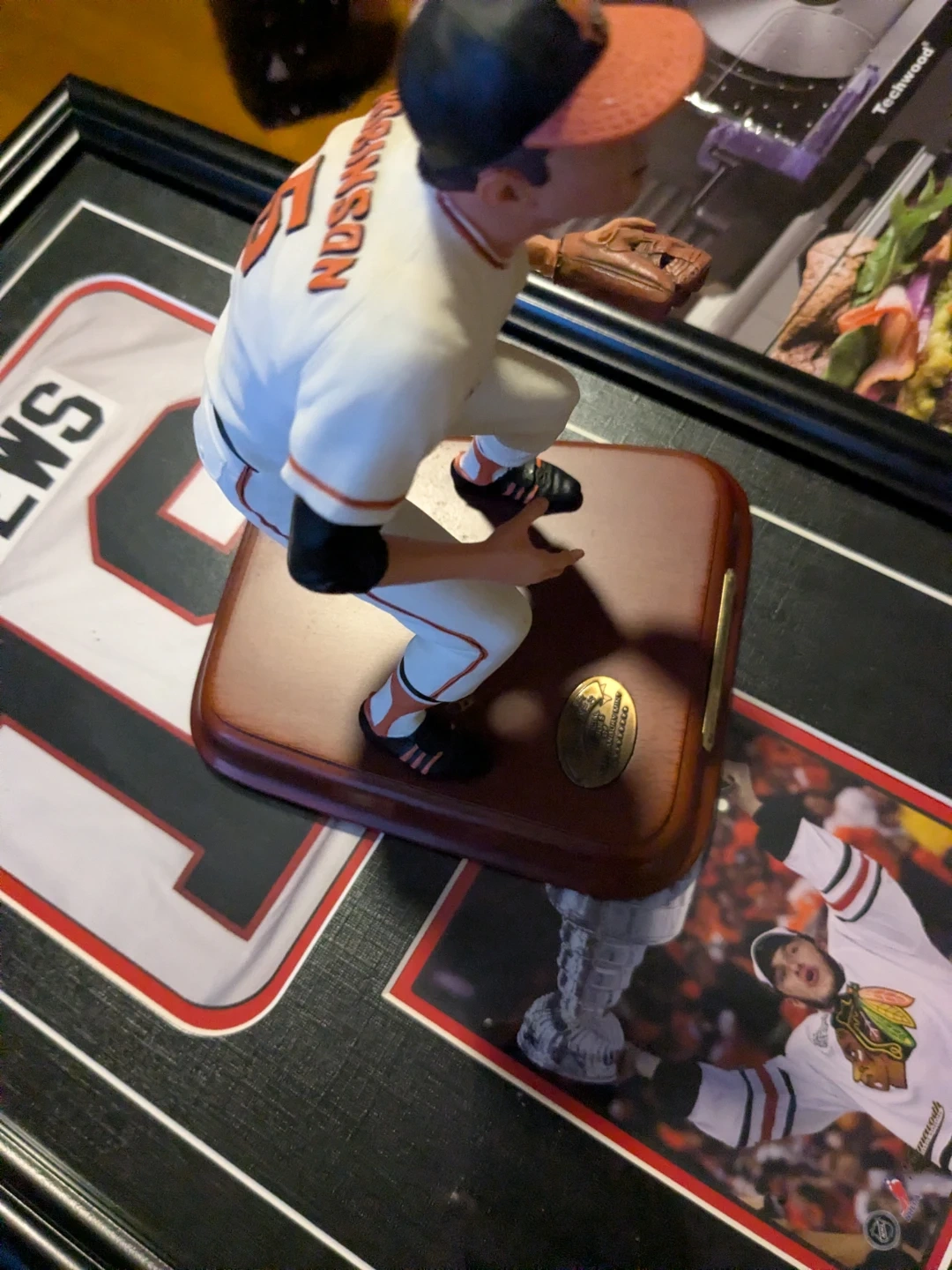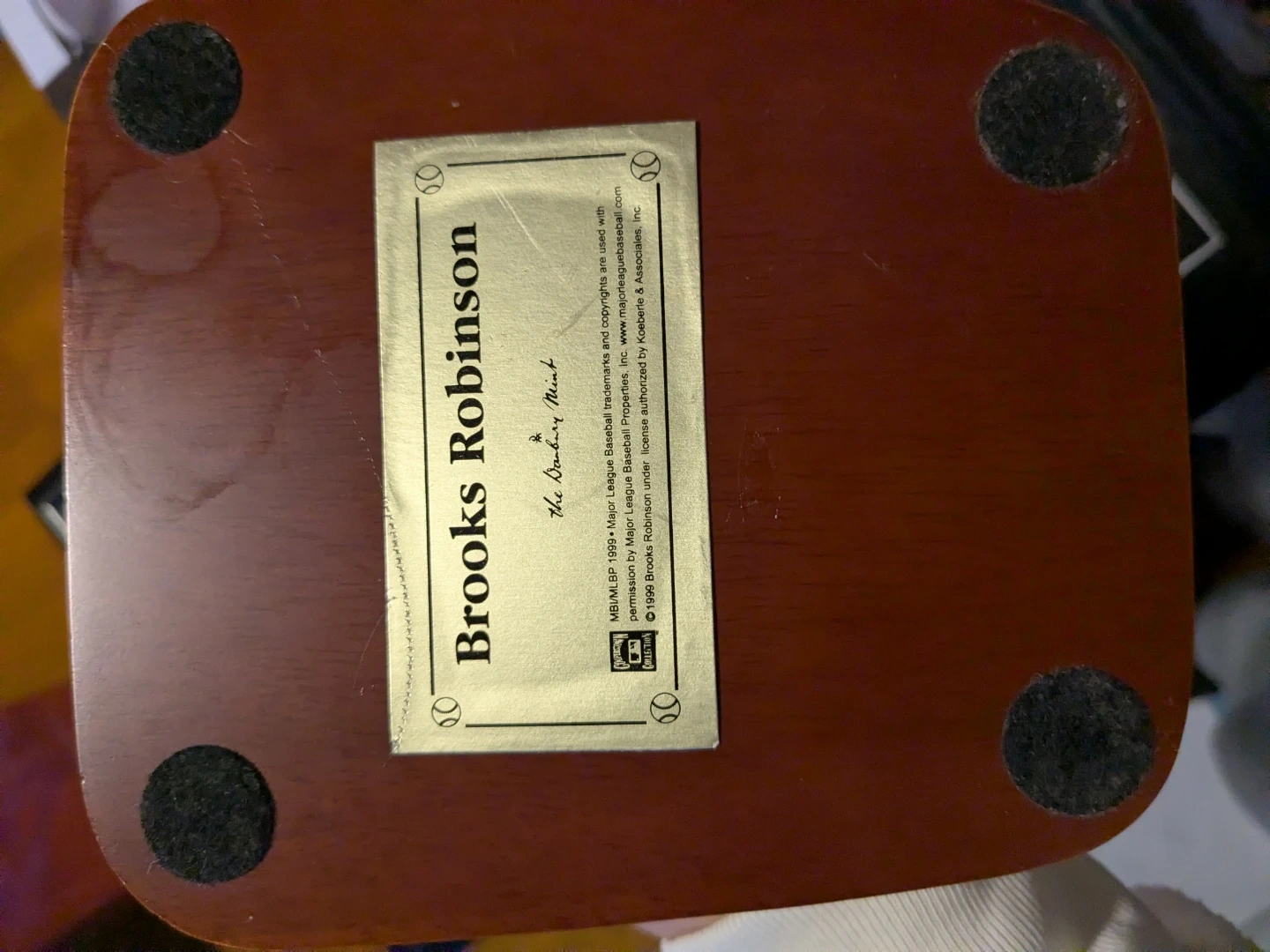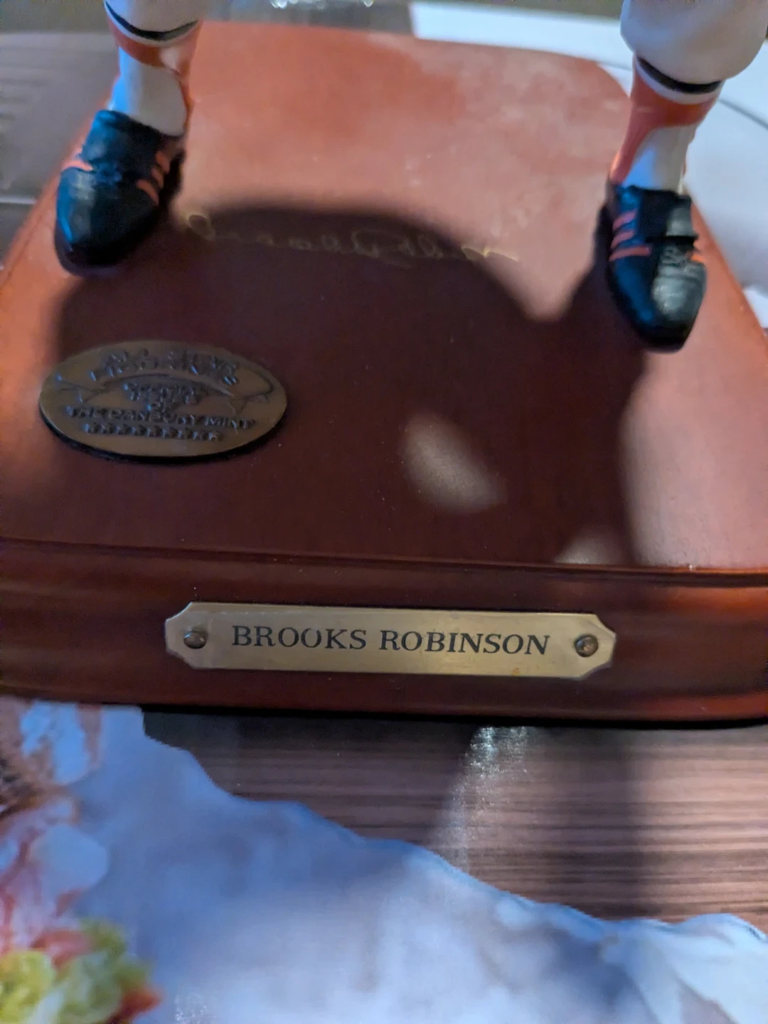 Brooks Robinson Limited Edition Figurine made by the Danbury Mint. These 9-inch ceramic figurines on a wood base were part of the "Legends of Baseball" collection and feature a brass nameplate and, often, a facsimile signature.