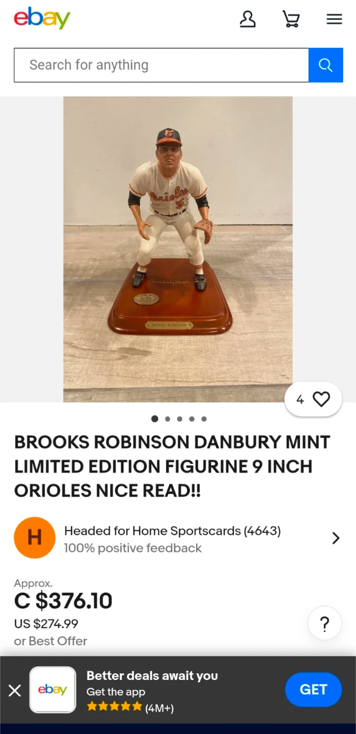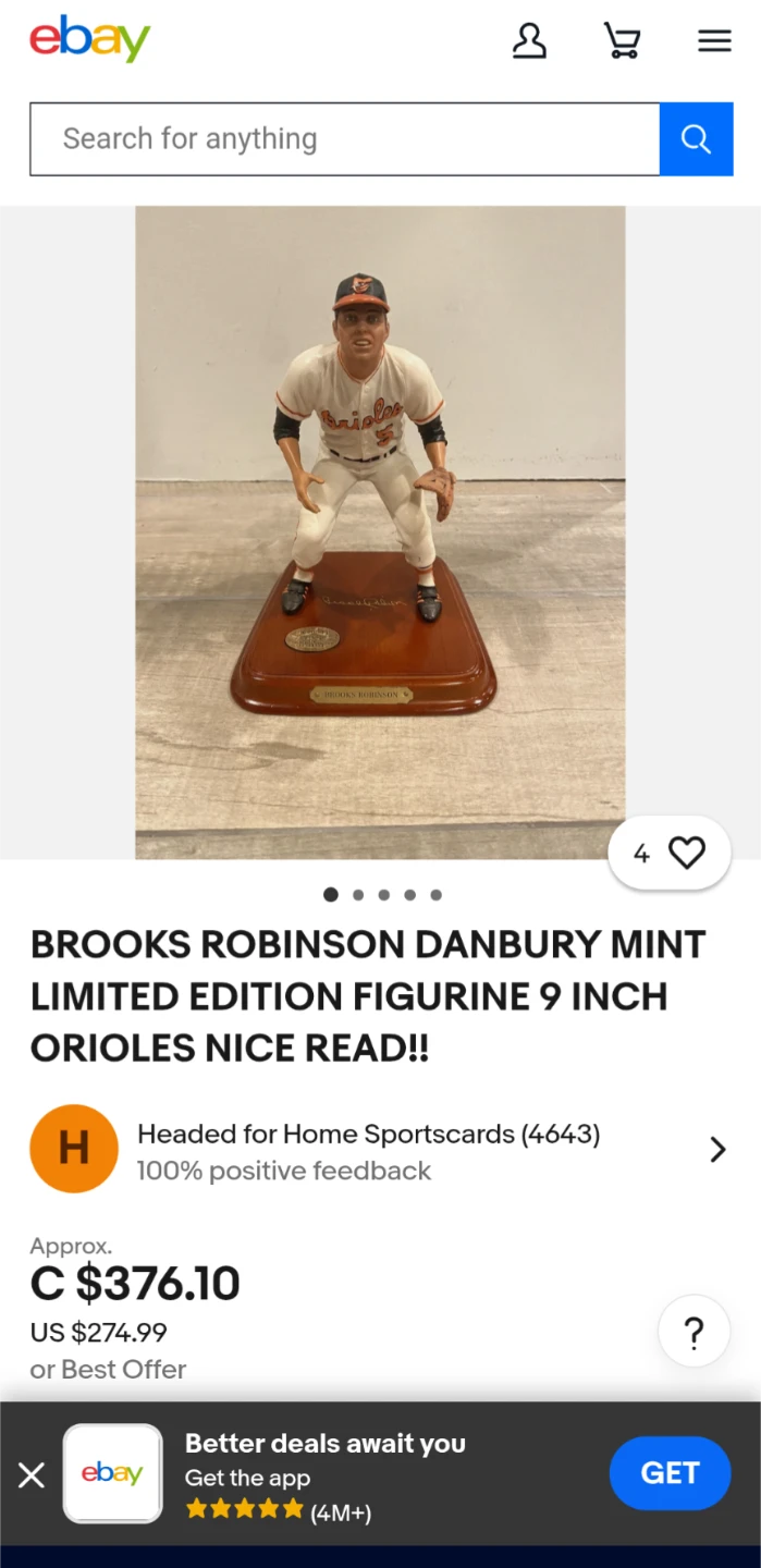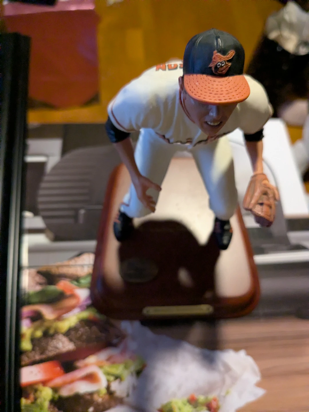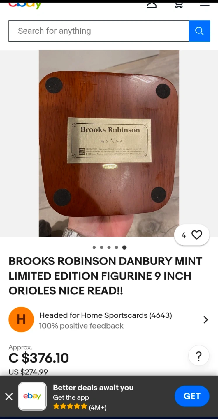 Brooks Robinson Limited Edition Figurine made by the Danbury Mint. These 9-inch ceramic figurines on a wood base were part of the "Legends of Baseball" collection and feature a brass nameplate and, often, a facsimile signature.