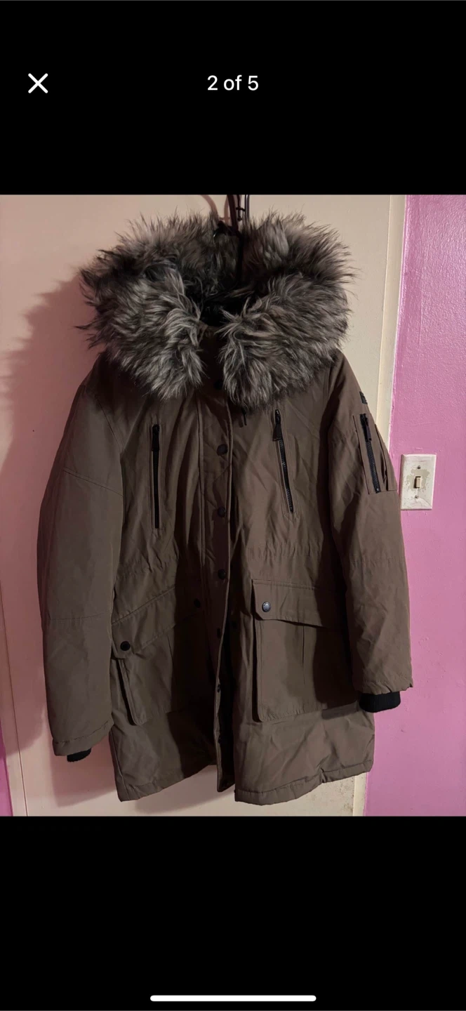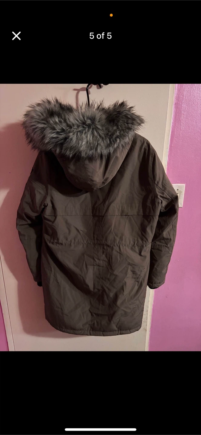 Here's a cozy olive green winter parka that's perfect for the cold weather! It features a faux fur trimmed hood and plenty of pockets. Great for staying warm and stylish during the winter months