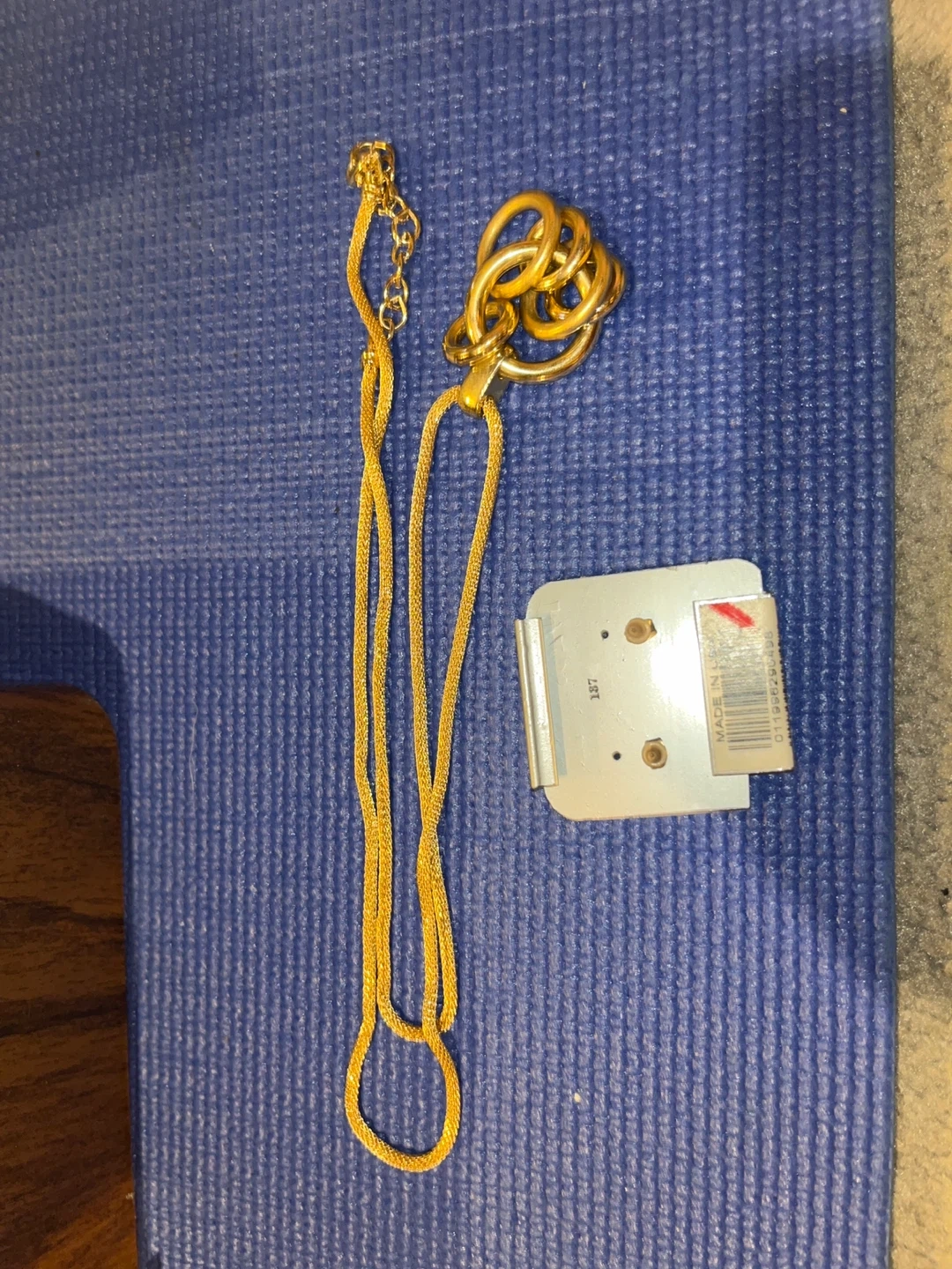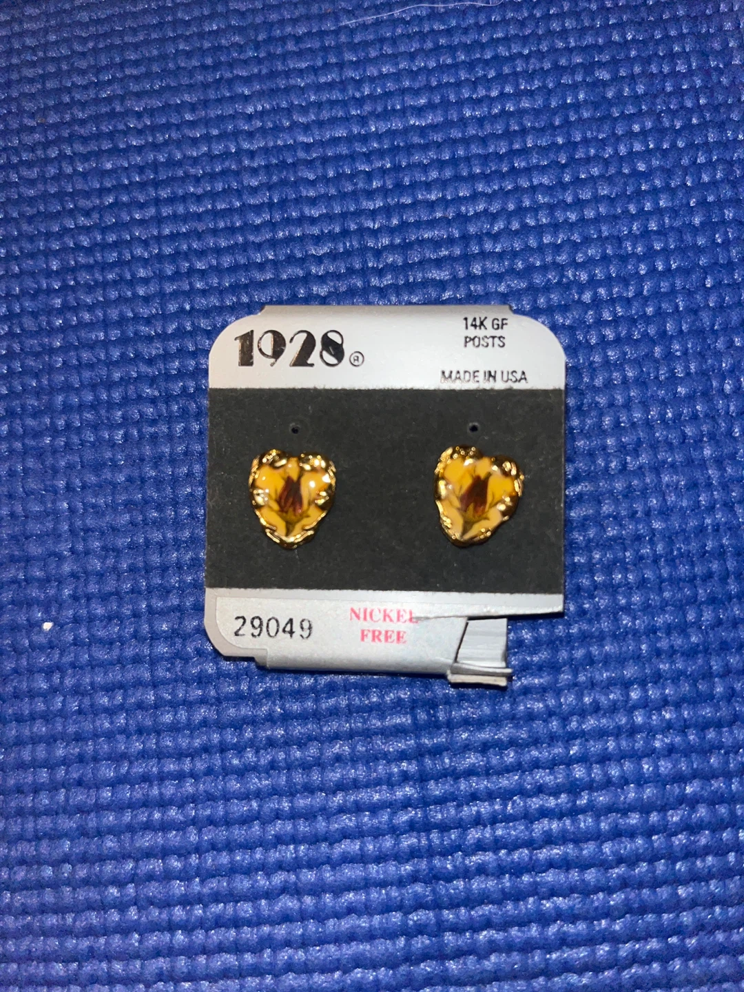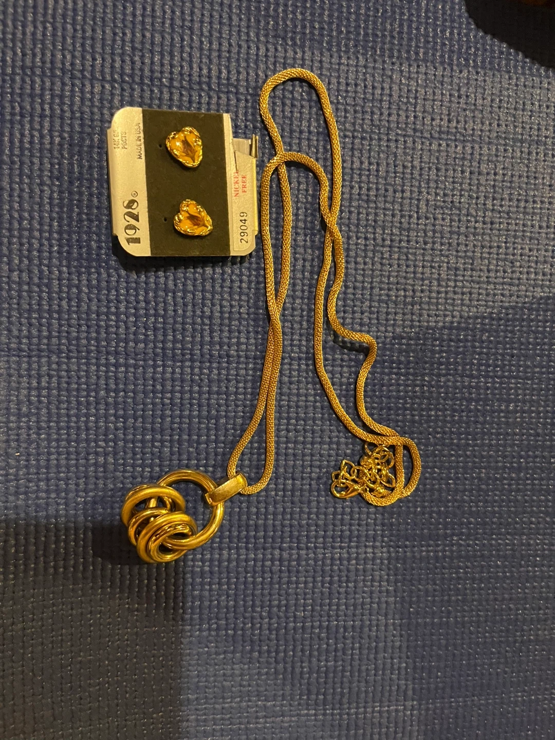 Selling a lovely gold-tone necklace and earrings set from 1928. The earrings are heart-shaped studs, and the necklace features a unique rings pendant. Both are nickel-free.