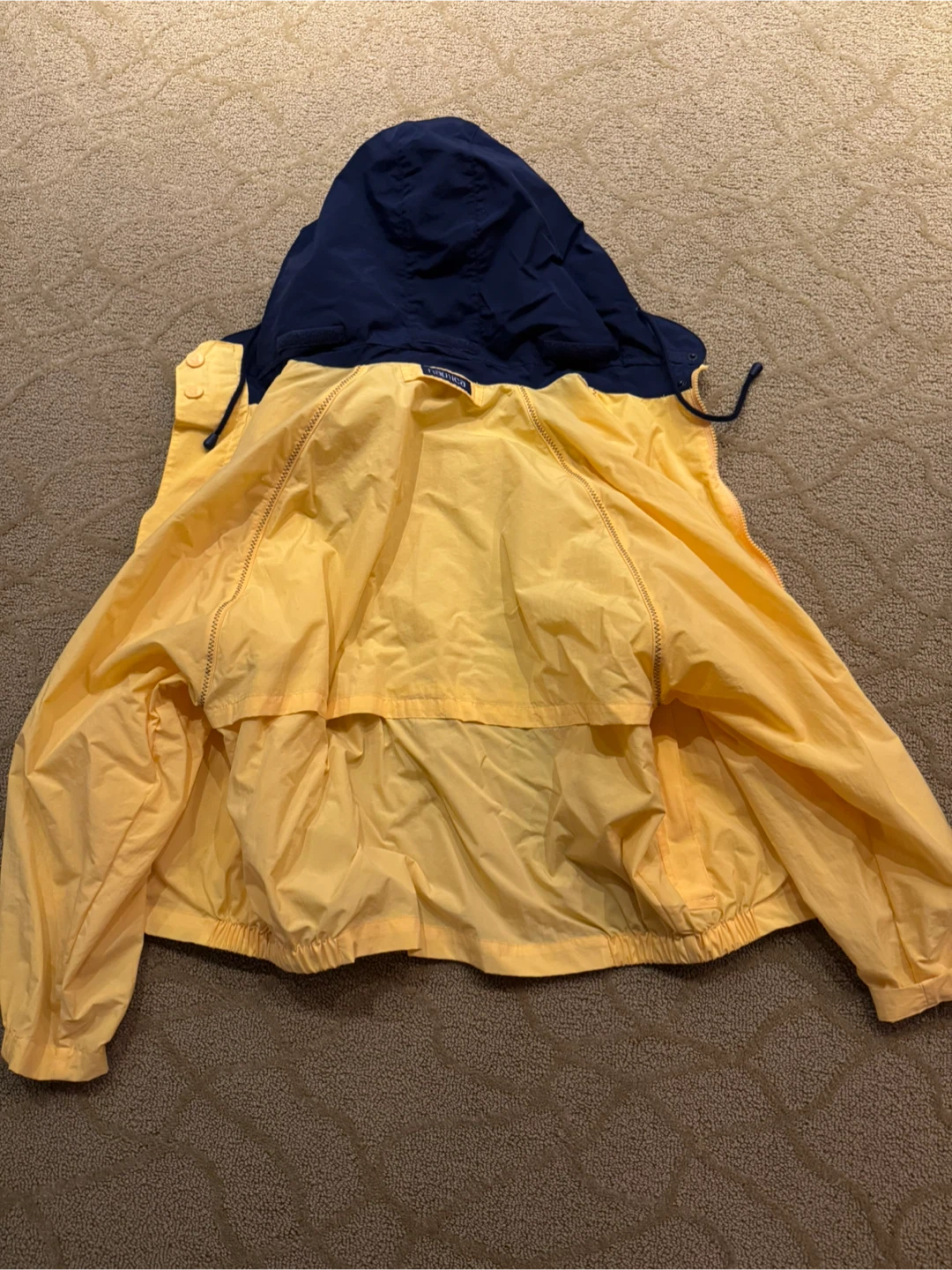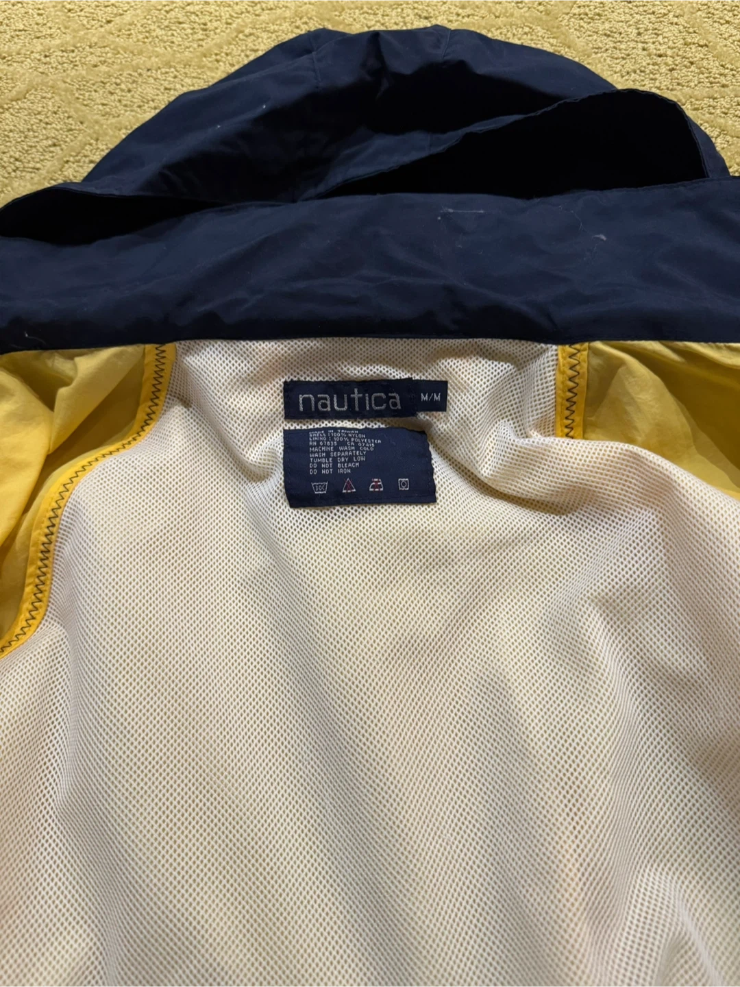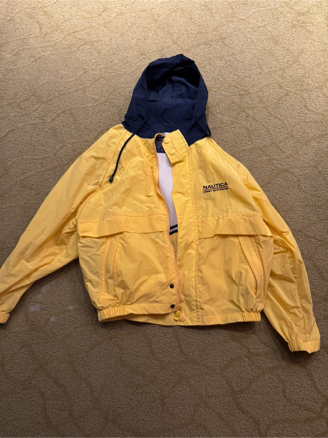 Selling a Nautica jacket featuring a vibrant yellow body and a navy blue hood. It's a size medium and in great condition! Perfect for those breezy days.