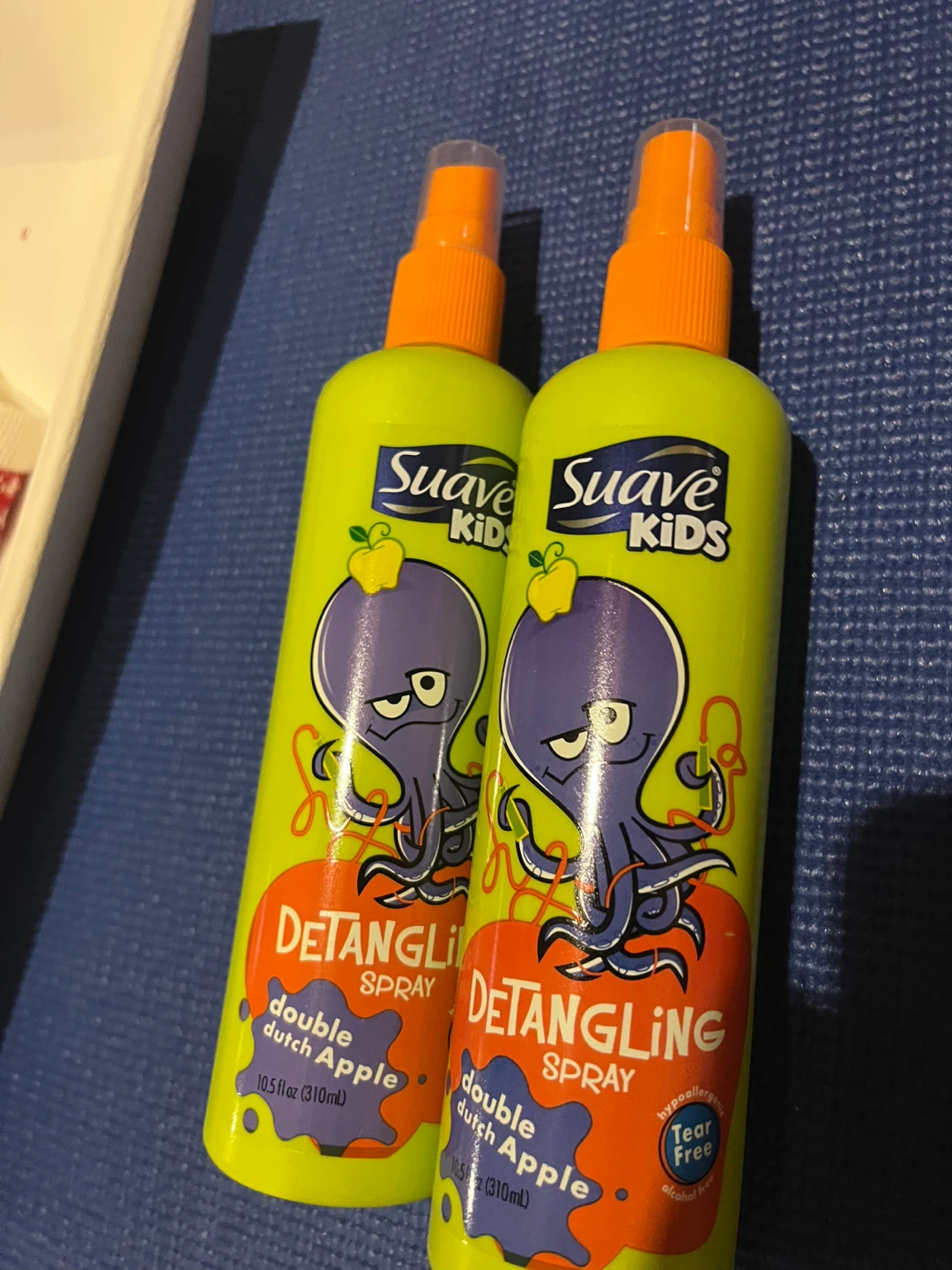 I have two new bottles of Suave Kids detangling spray. They're the Double Dutch Apple scent and each bottle contains 10.5 fl oz (310ml). Tear-free and hypoallergenic.