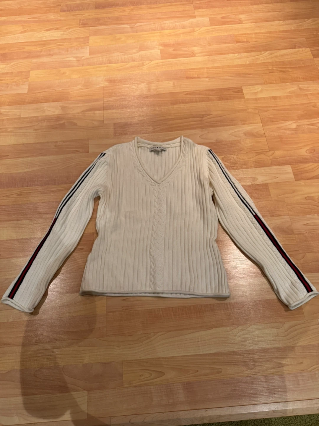 Here's a Tommy Hilfiger sweater in a lovely white ribbed knit! It features a V-neck and stylish stripes along the sleeves. Perfect for adding a touch of classic style to your wardrobe