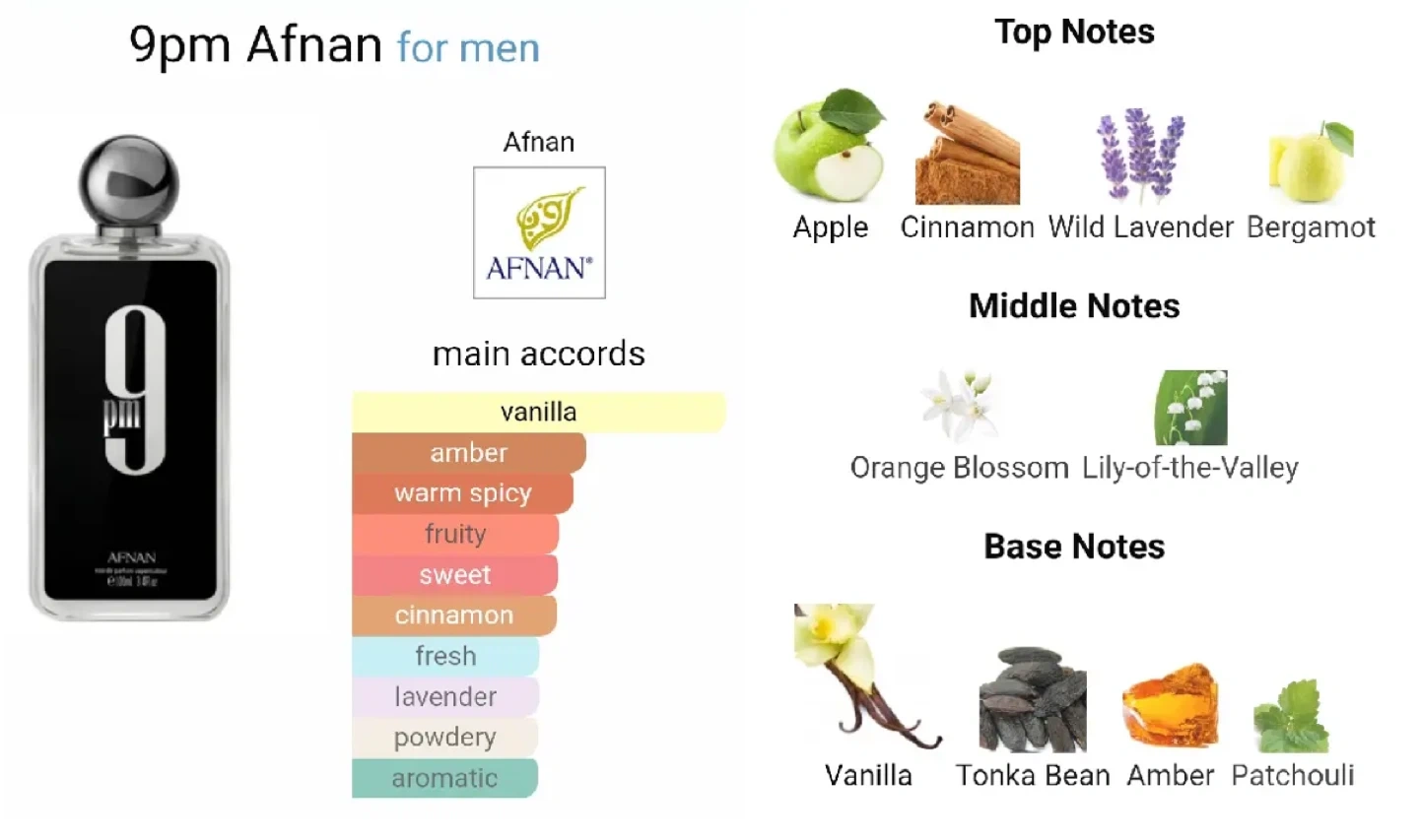 Selling a bottle of Afnan 9pm Eau De Parfum. It comes in a 3.4 oz (100ml) bottle. This fragrance features top notes of apple, cinnamon, wild lavender, and bergamot. The middle notes consist of orange blossom and lily-of-the-valley, while the base notes include vanilla, tonka bean, amber, and patchouli. The main accords are vanilla, amber, warm spicy, fruity, sweet, cinnamon, fresh, lavender, powdery, and aromatic