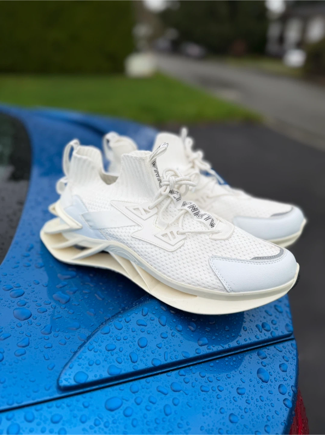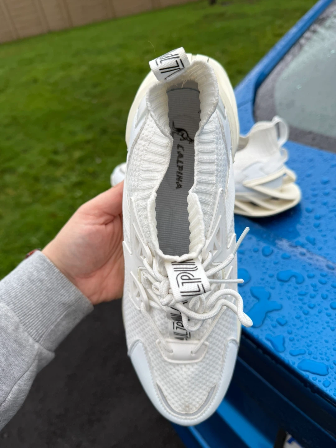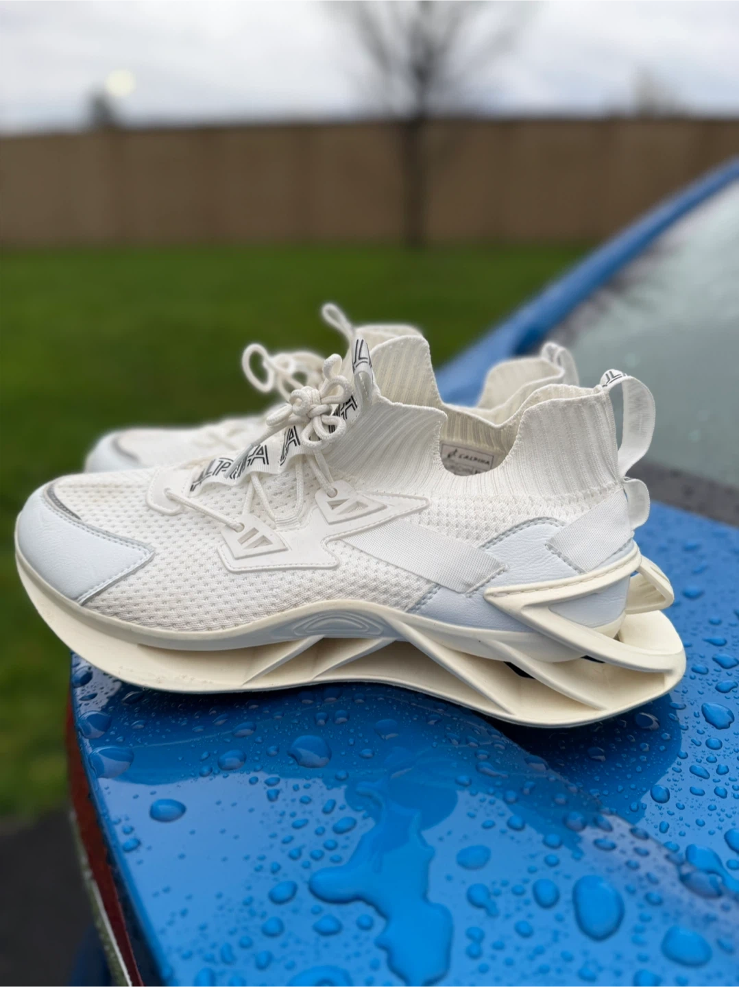 Selling a pair of CALPINA running shoes in white. These shoes have a unique design and look to be in great condition. Perfect for running or casual wear!