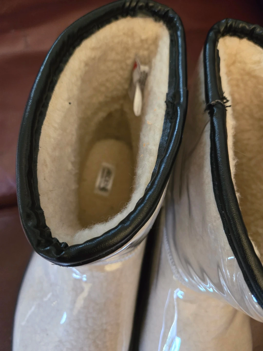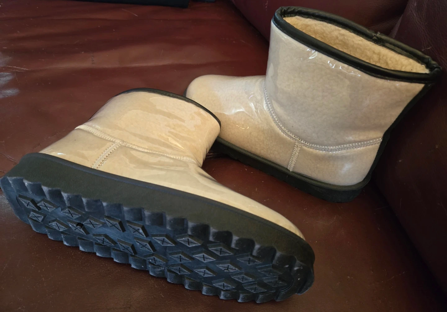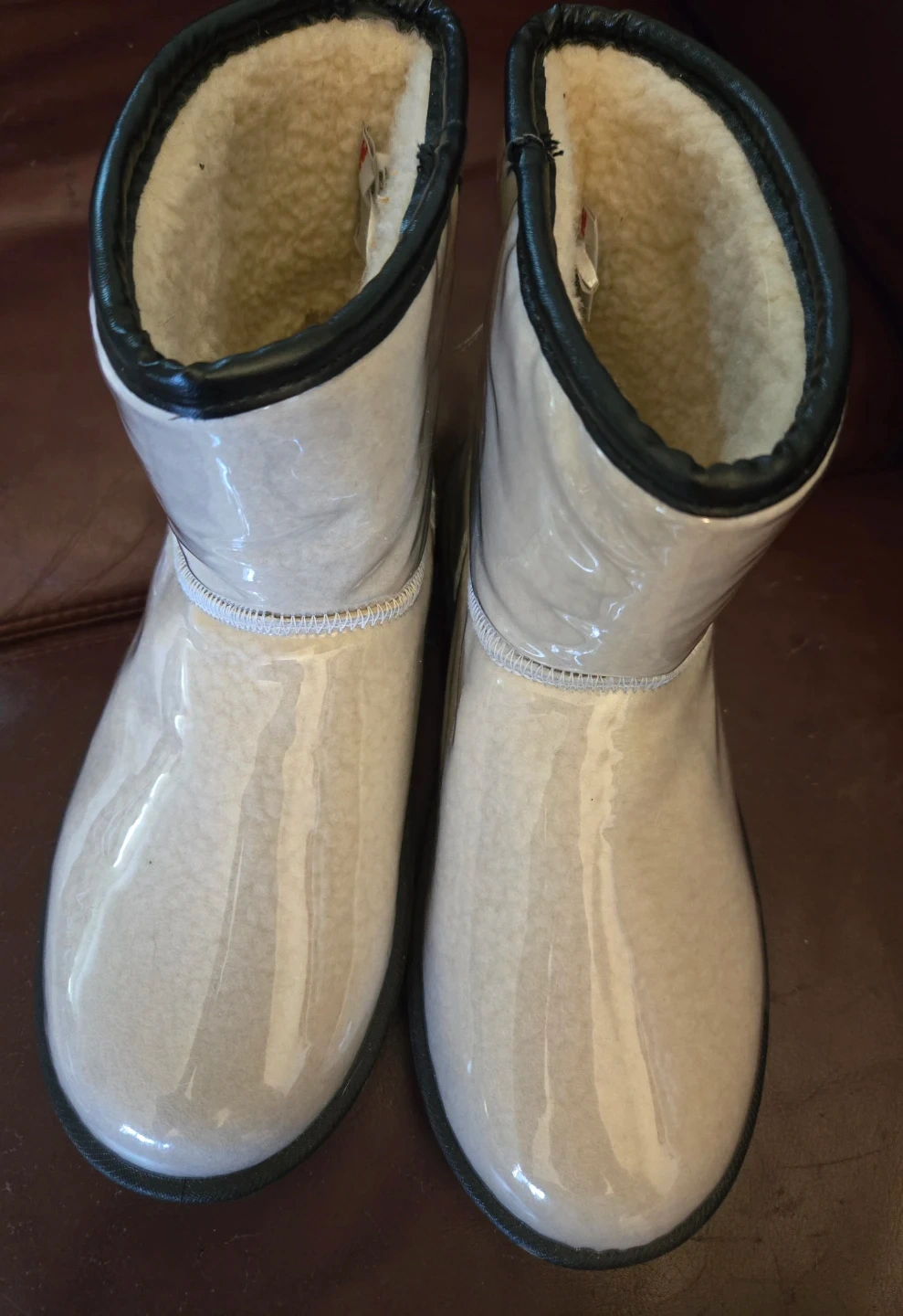 These boots from Ardene are a unique find! They are a clear, neutral colour with a black trim and chunky black sole. The interior is lined with a soft, warm material. They're in great brand new condition and ready for someone to enjoy!