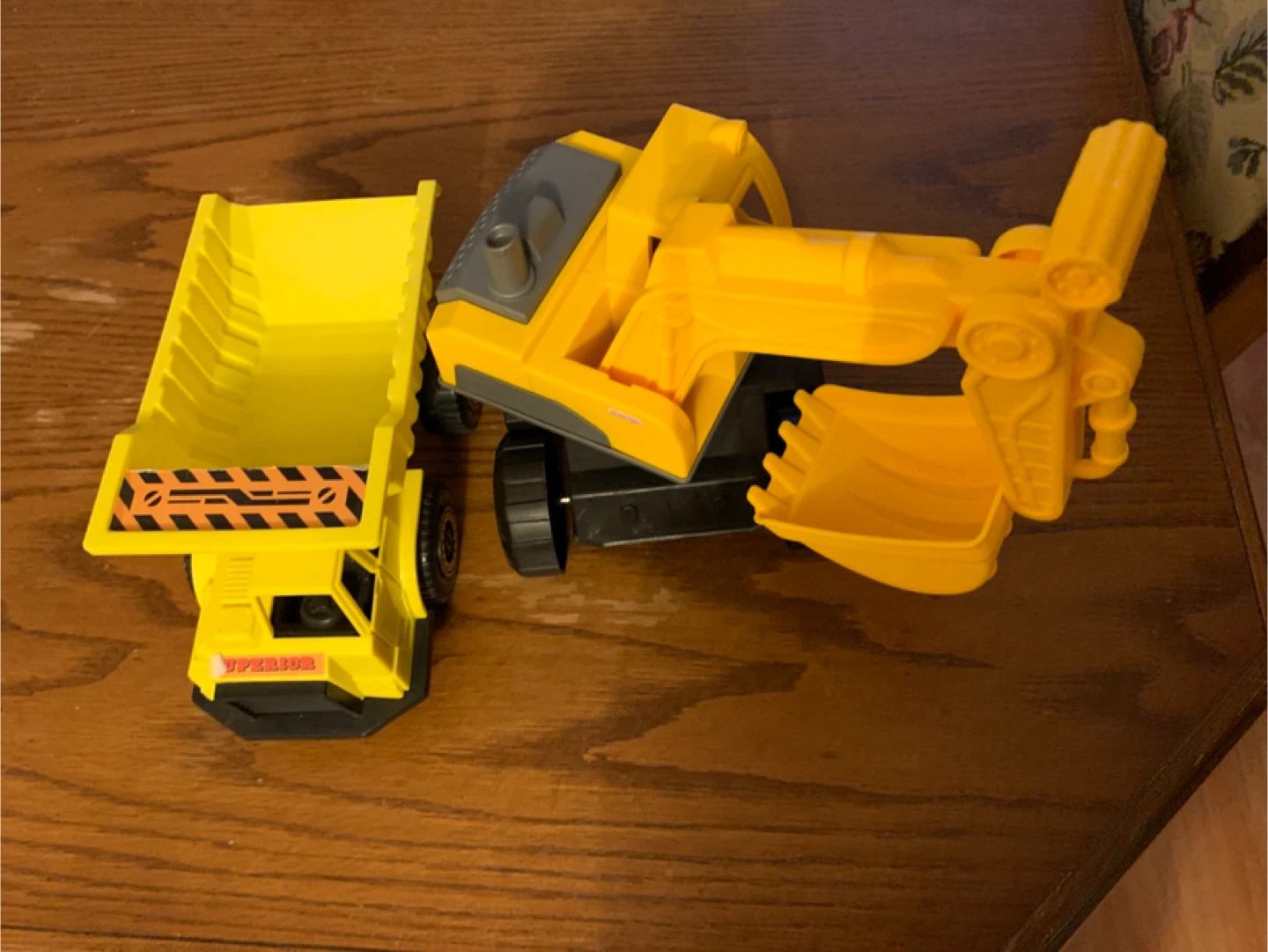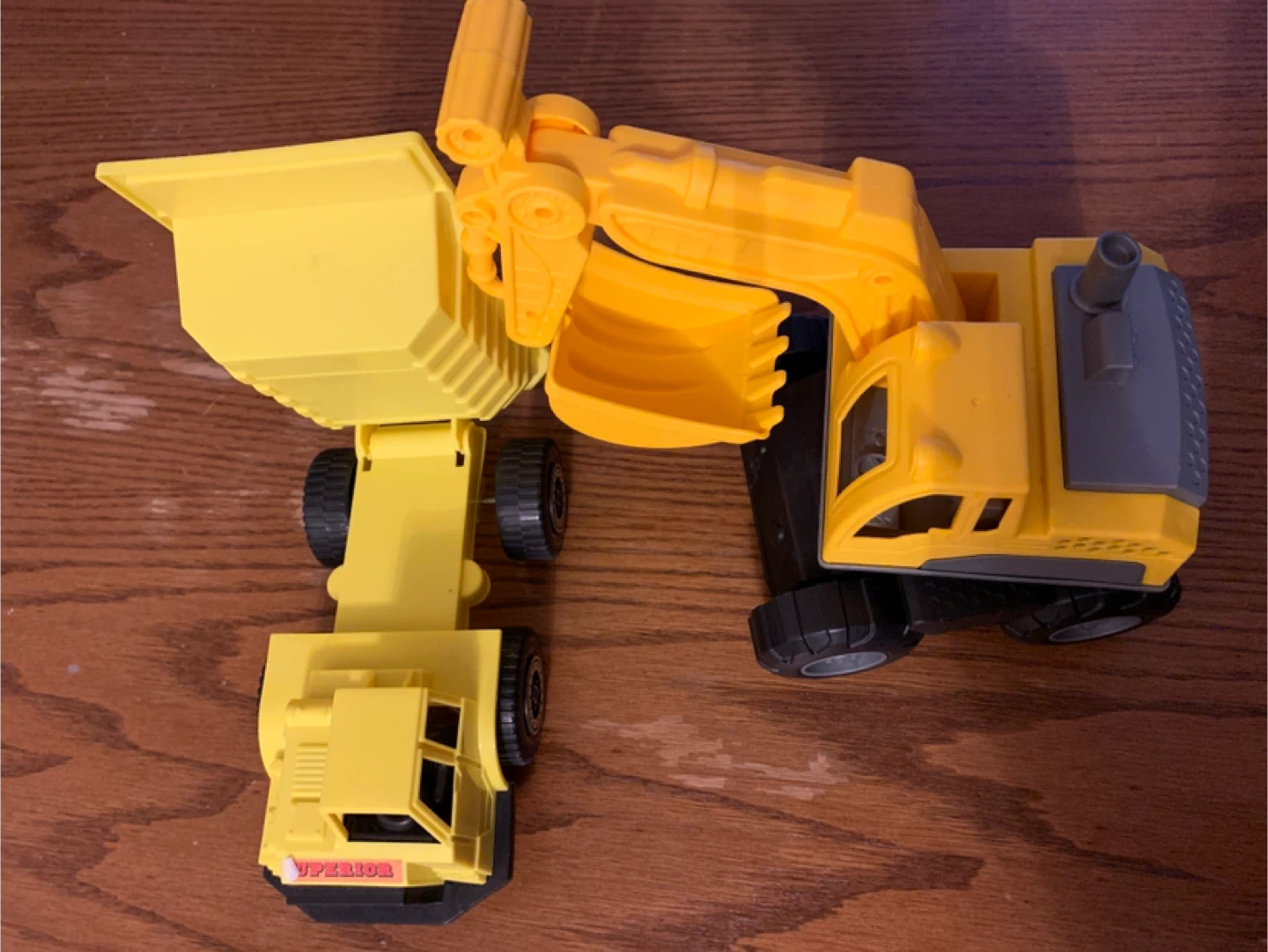 Selling a fun yellow toy set that includes a dump truck and an excavator! Both toys are in good condition and ready for some imaginative play