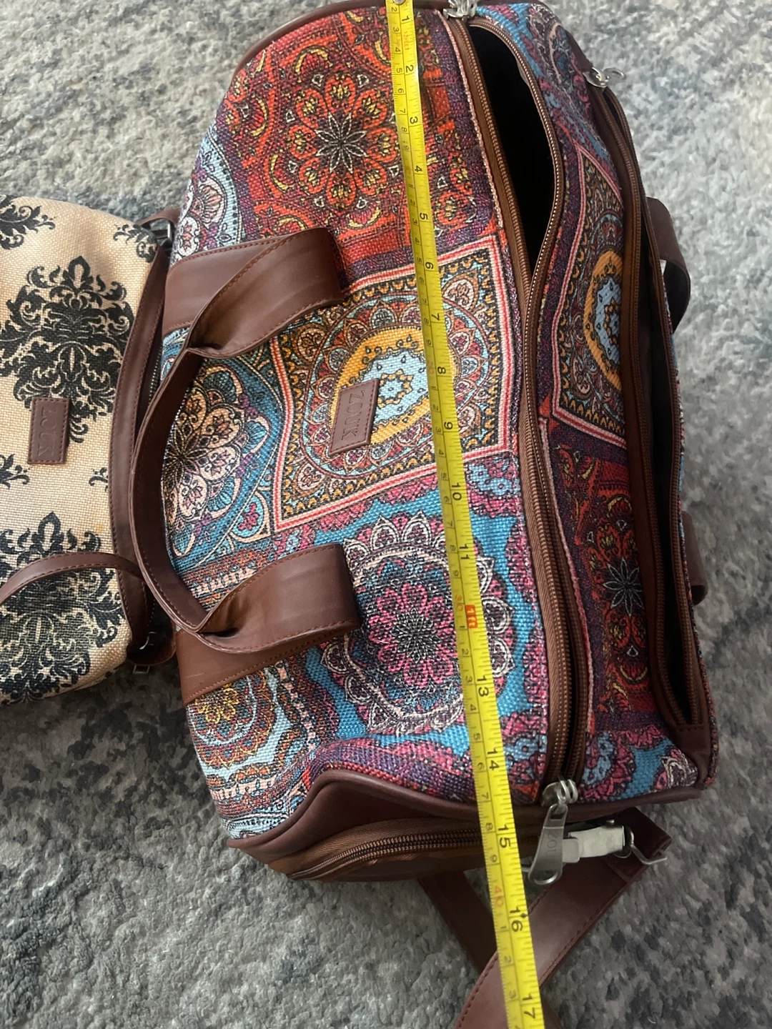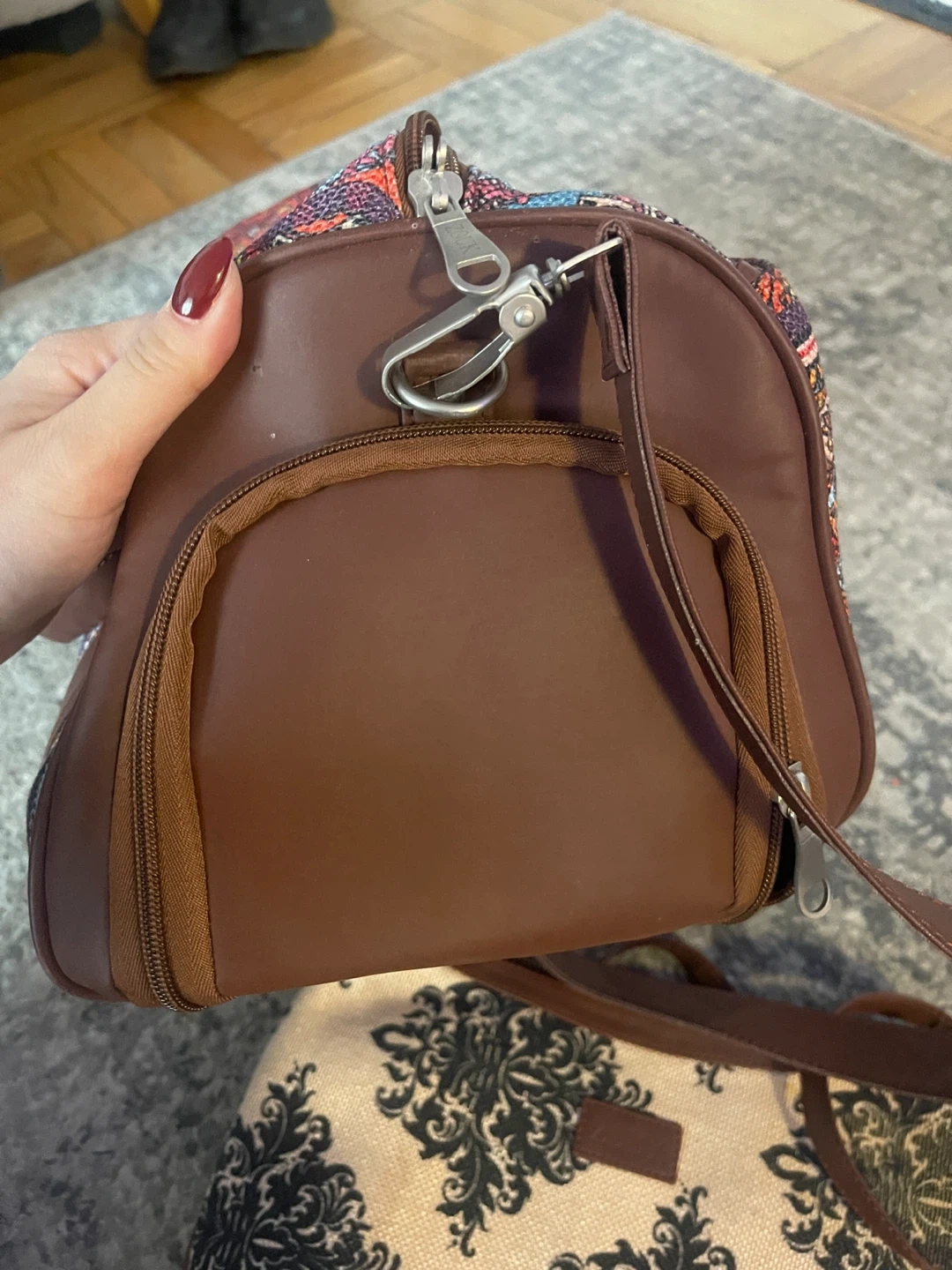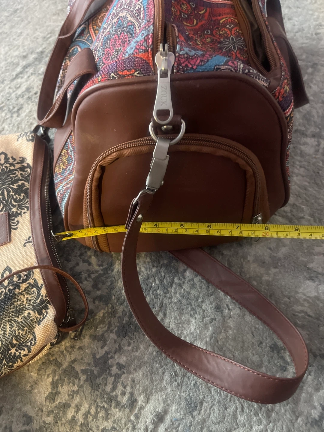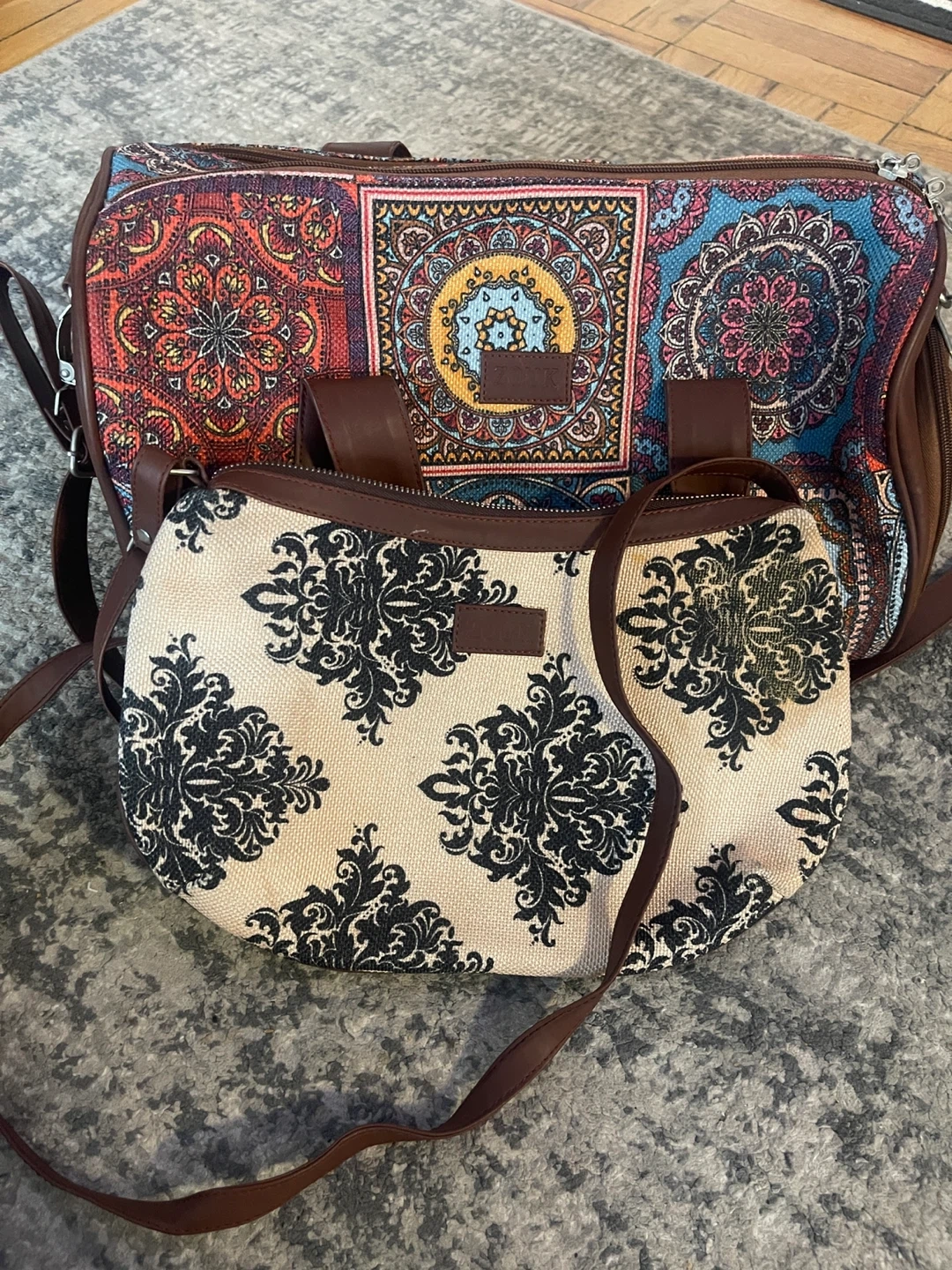 Selling a Zouk handbag and weekender bag set. The handbag is approximately 12 inches in length. The weekender bag is approximately 17 inches in height.