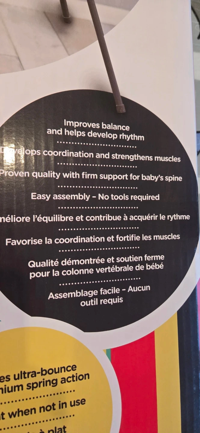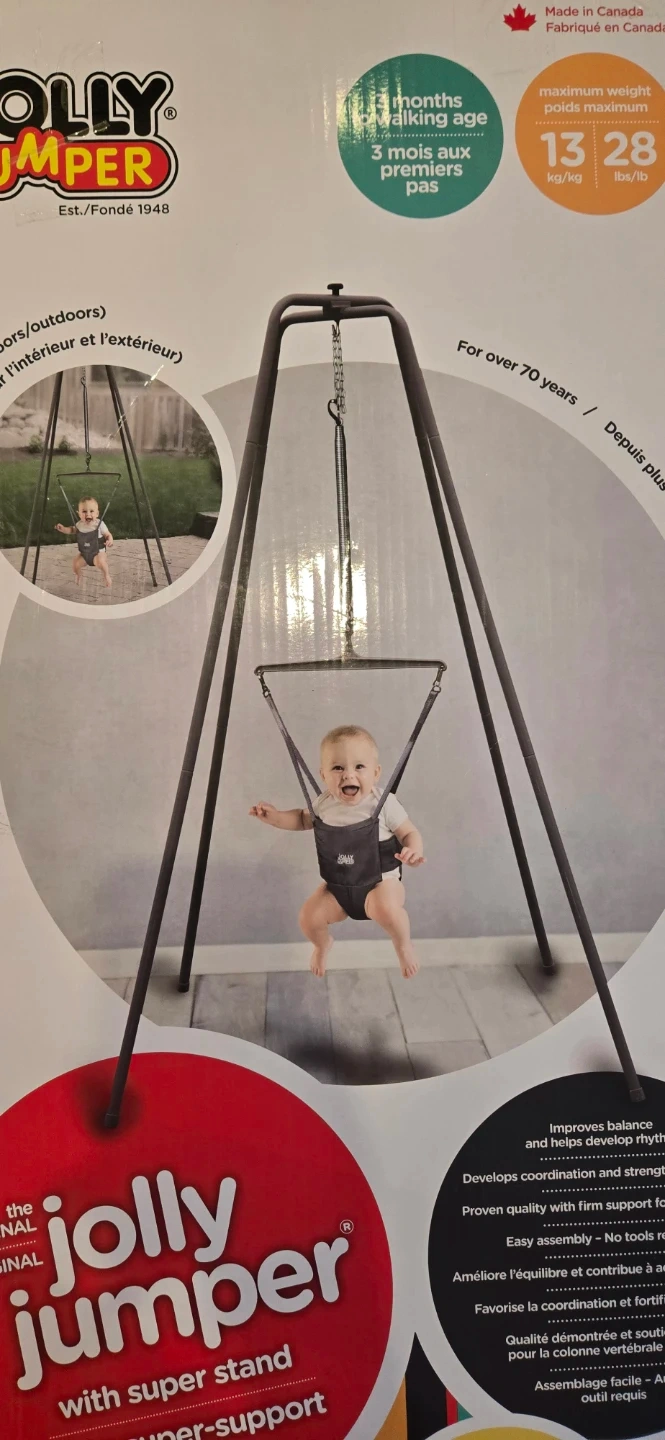 Jolly Jumper with Super Stand for babies 3 months and up! It's in great condition and provides ultra-bounce with premium spring action. It's easy to assemble with no tools required and folds flat when not in use. It improves balance and helps develop rhythm, while also developing coordination and strengthens muscles. Weight capacity is 13 kg / 28 lbs