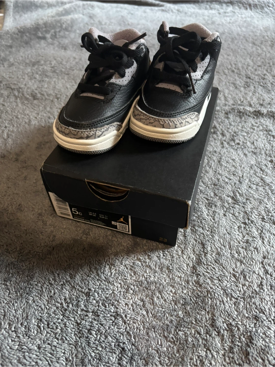 Selling a pair of Jordan 3 Retro Black Cement shoes in a kids size 5C. Great condition, barely worn. They come with the original box!